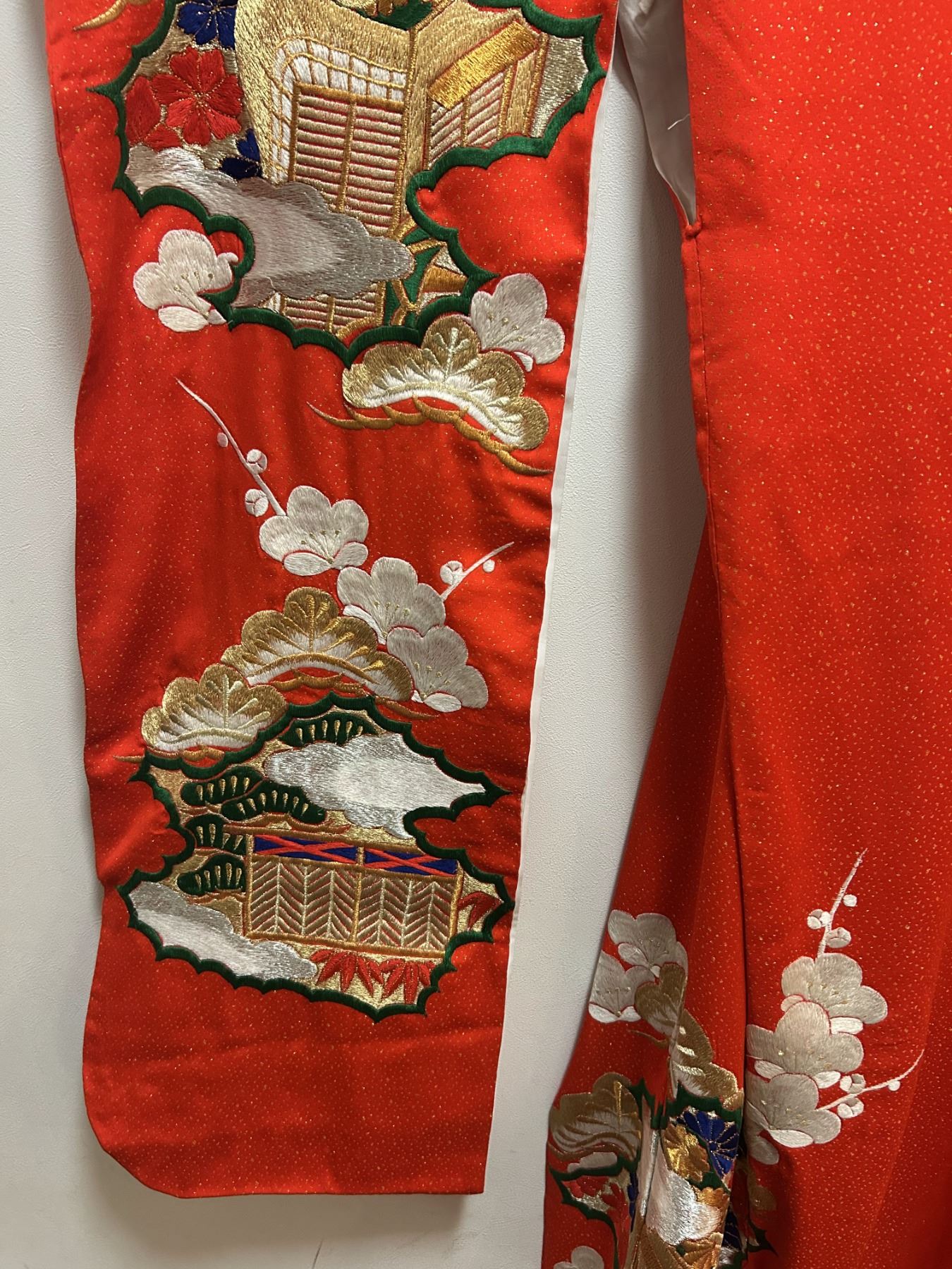 Red Japanese Wedding Kimono w/ Floral Design, Women's One Size