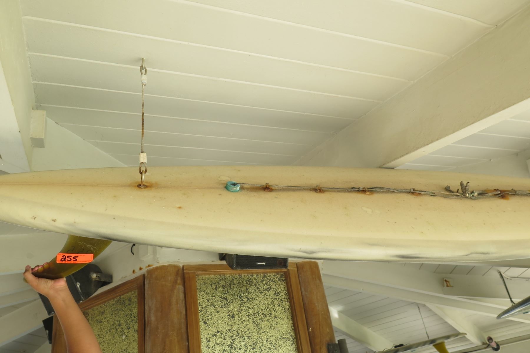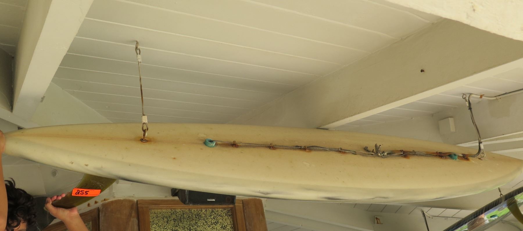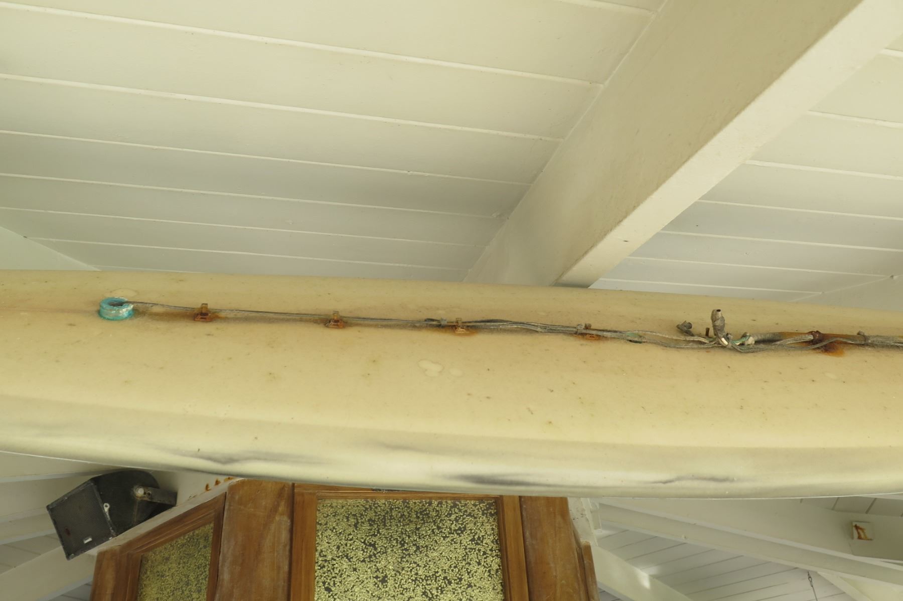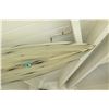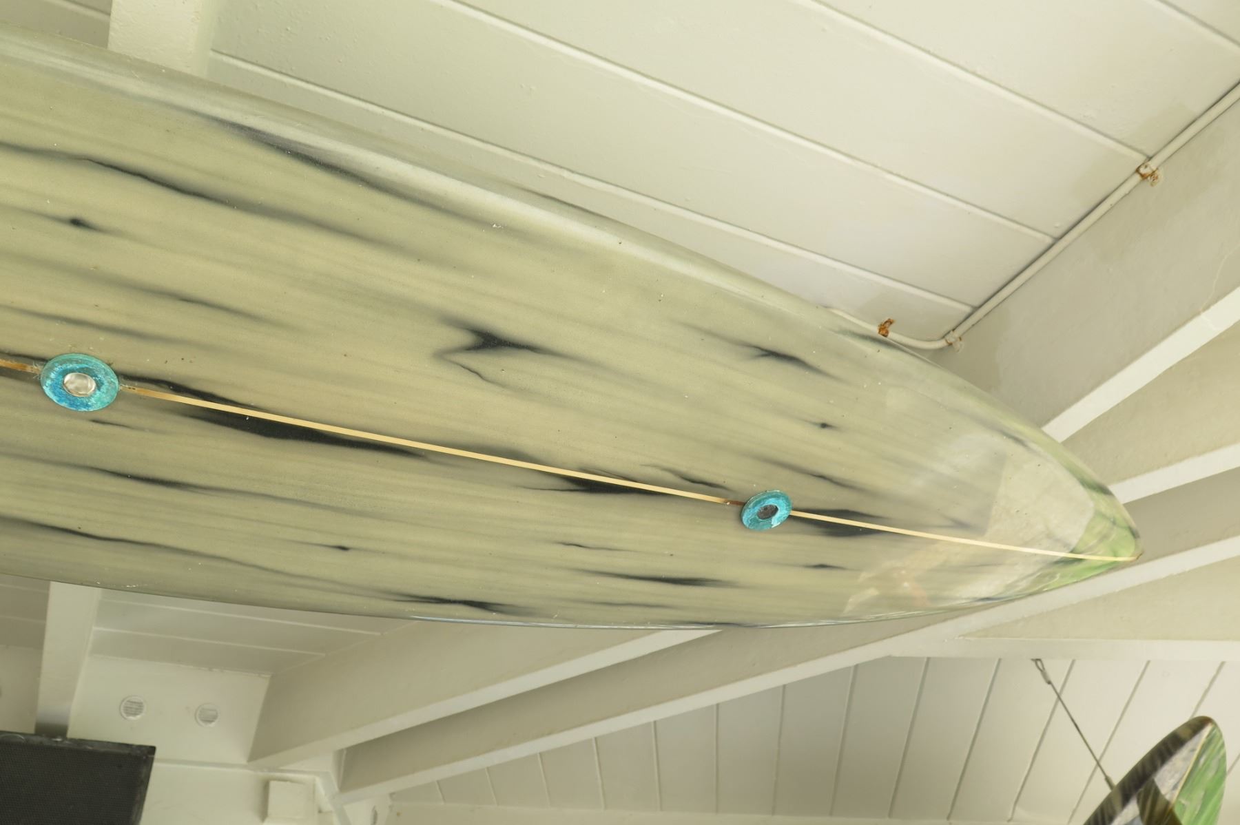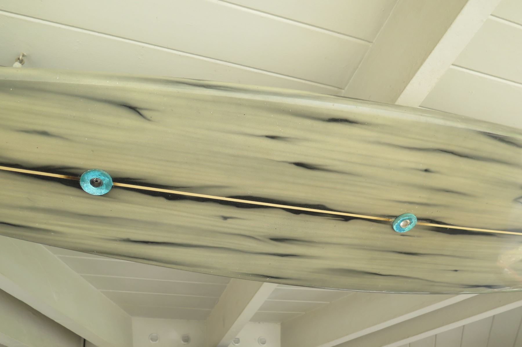 Repurposed Surfboard Ceiling Light Fixture, White w/ Black Accent Markings, Approx. 9ft Long