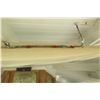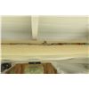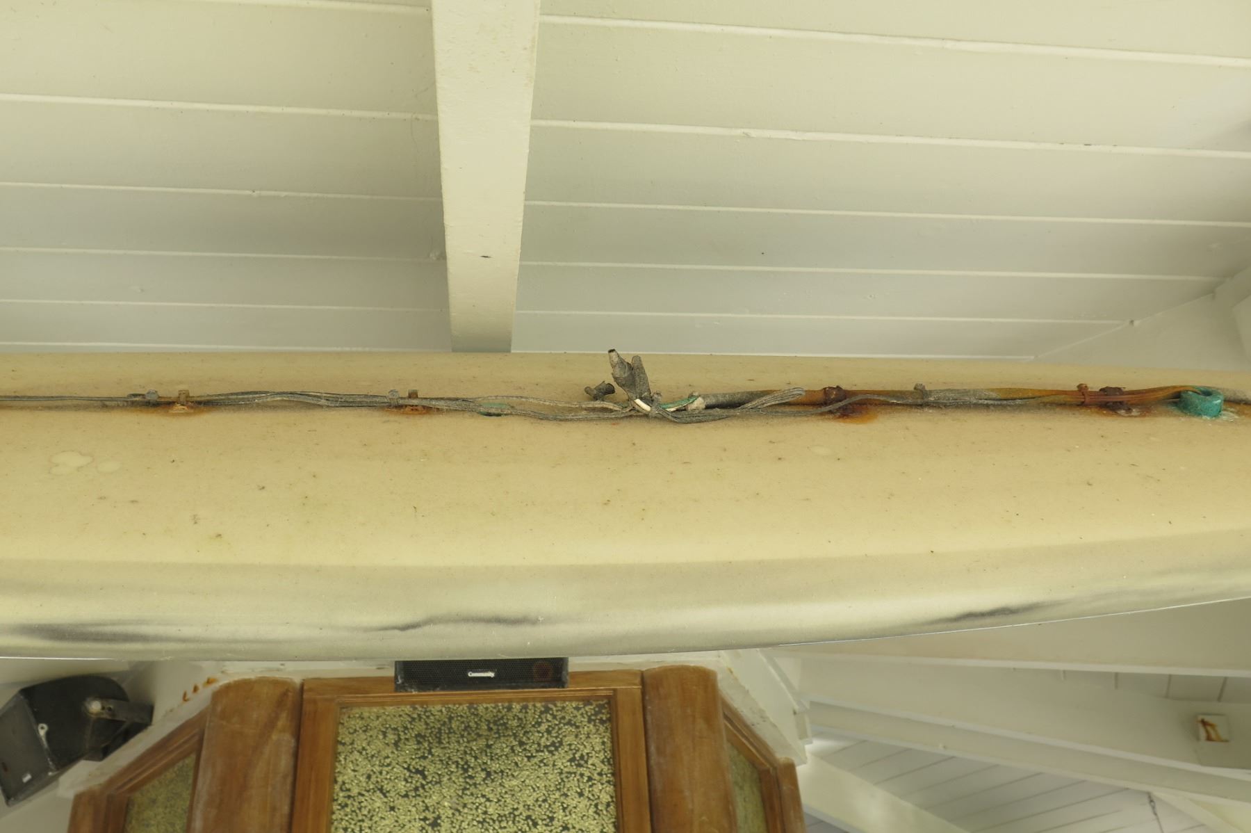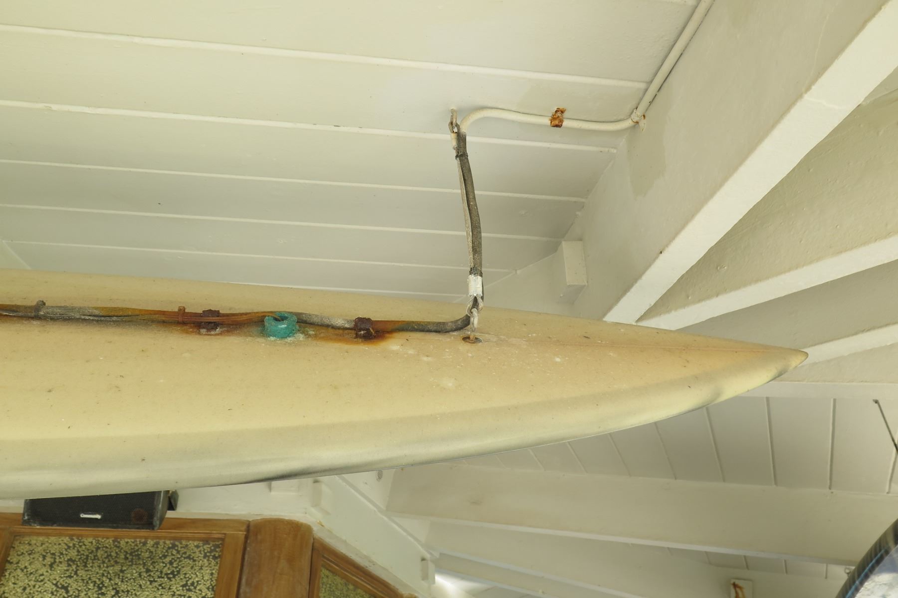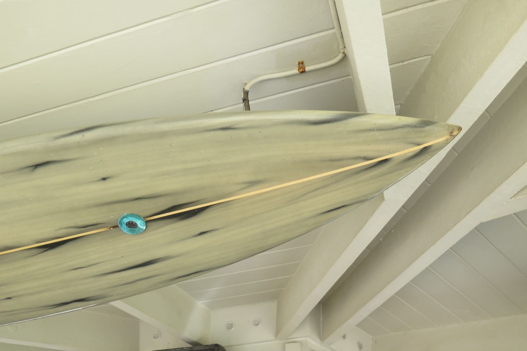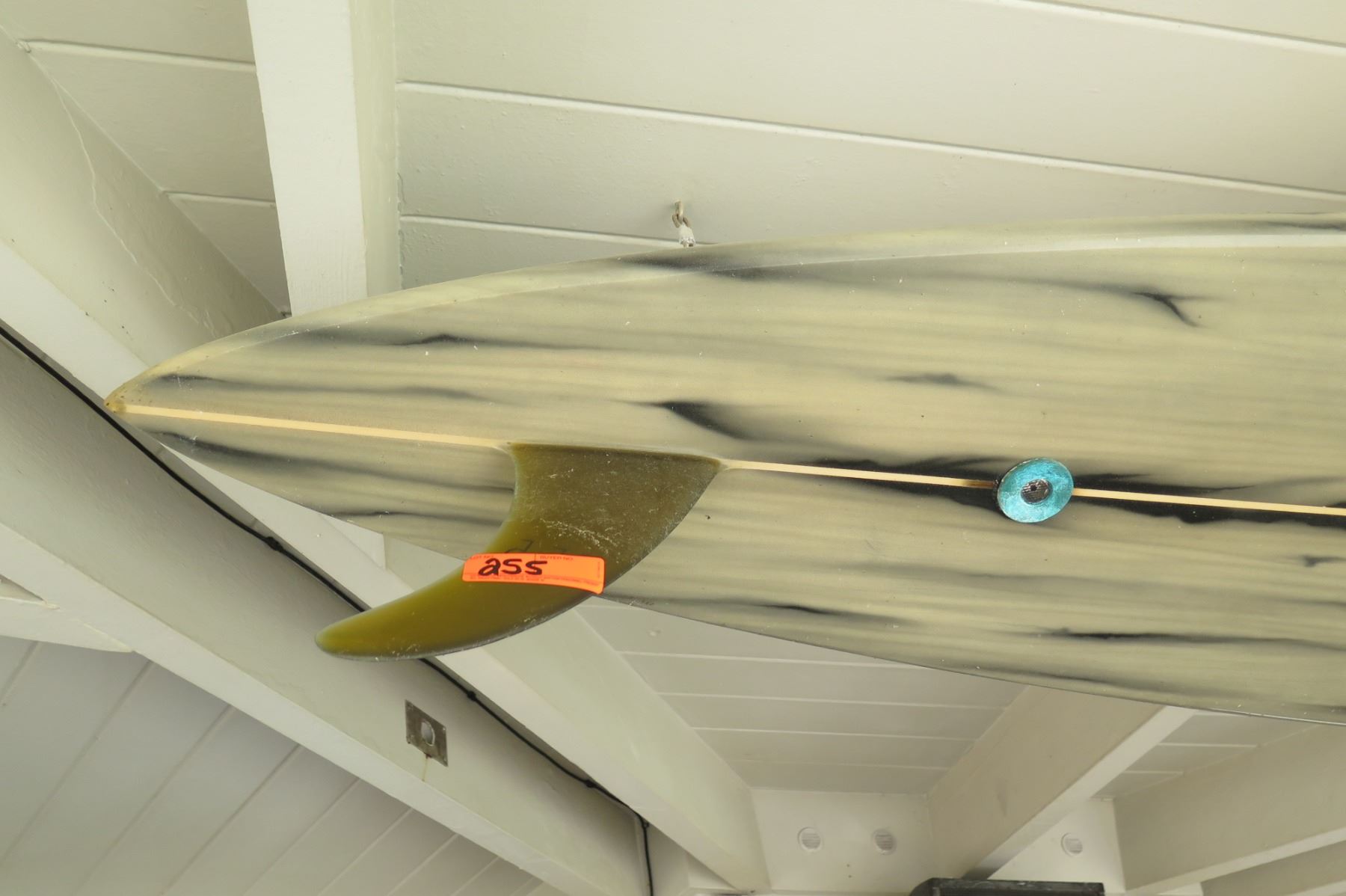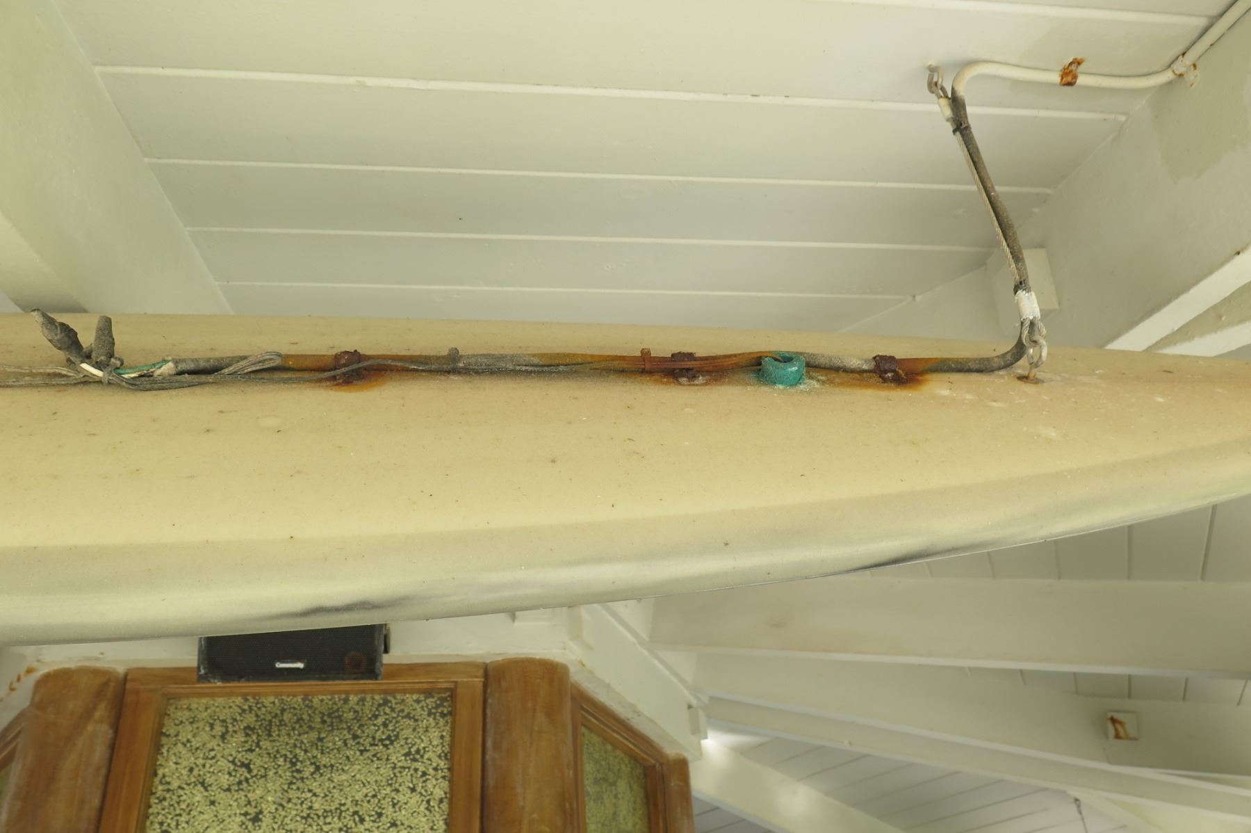 Repurposed Surfboard Ceiling Light Fixture, White w/ Black Accent Markings, Approx. 9ft Long
