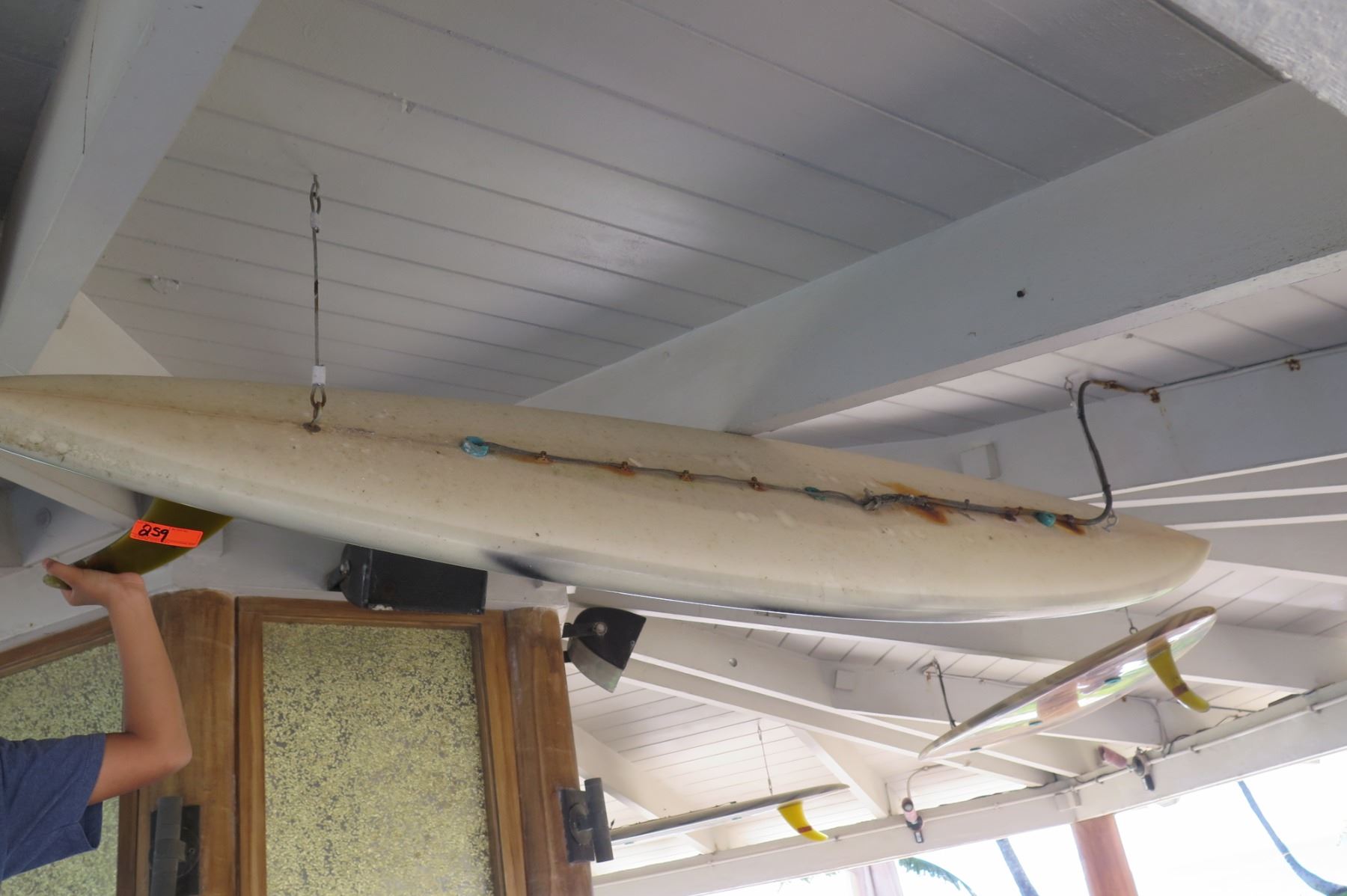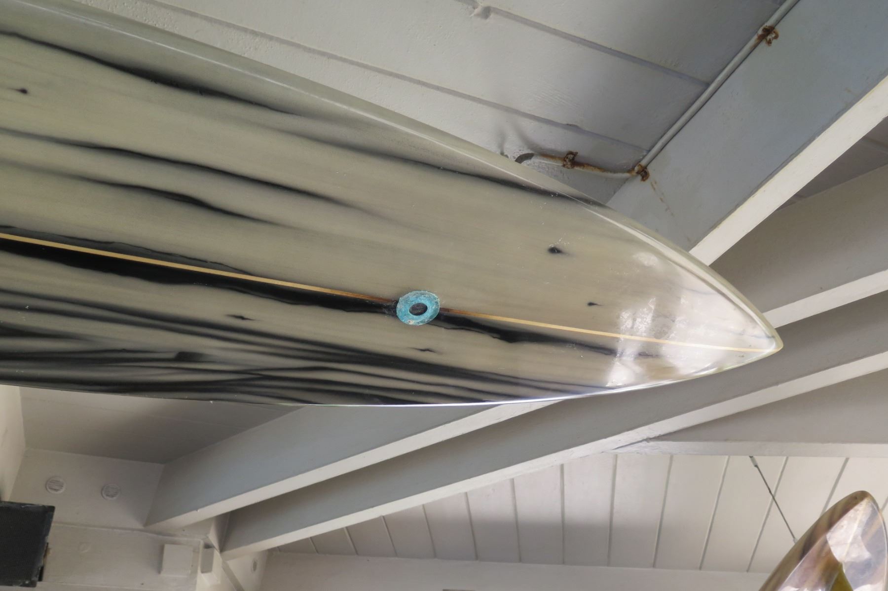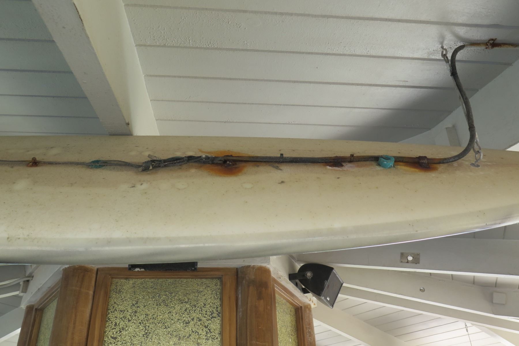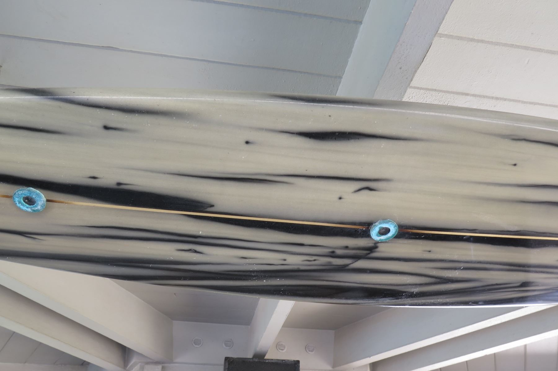 Repurposed Surfboard Ceiling Light Fixture, White w/ Black Markings, Approx. 9ft Long