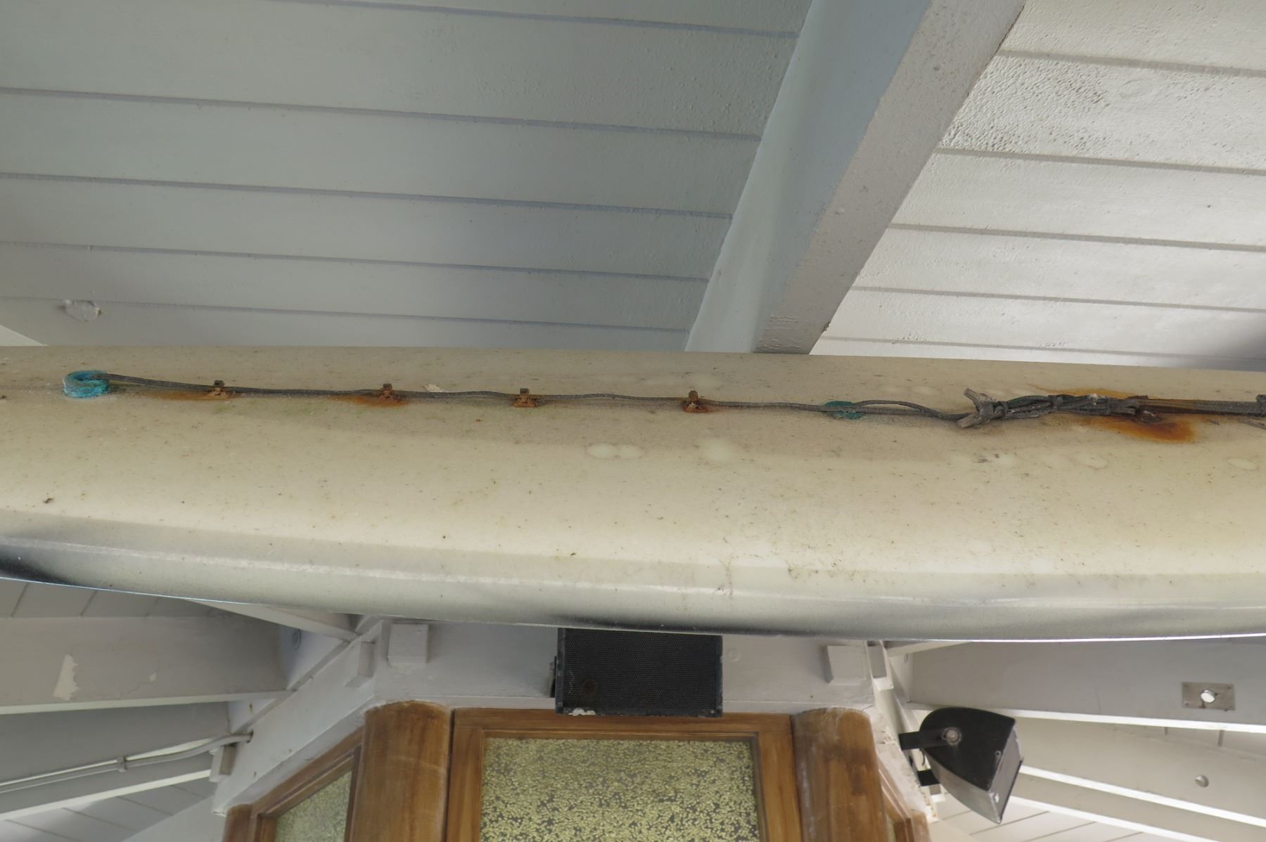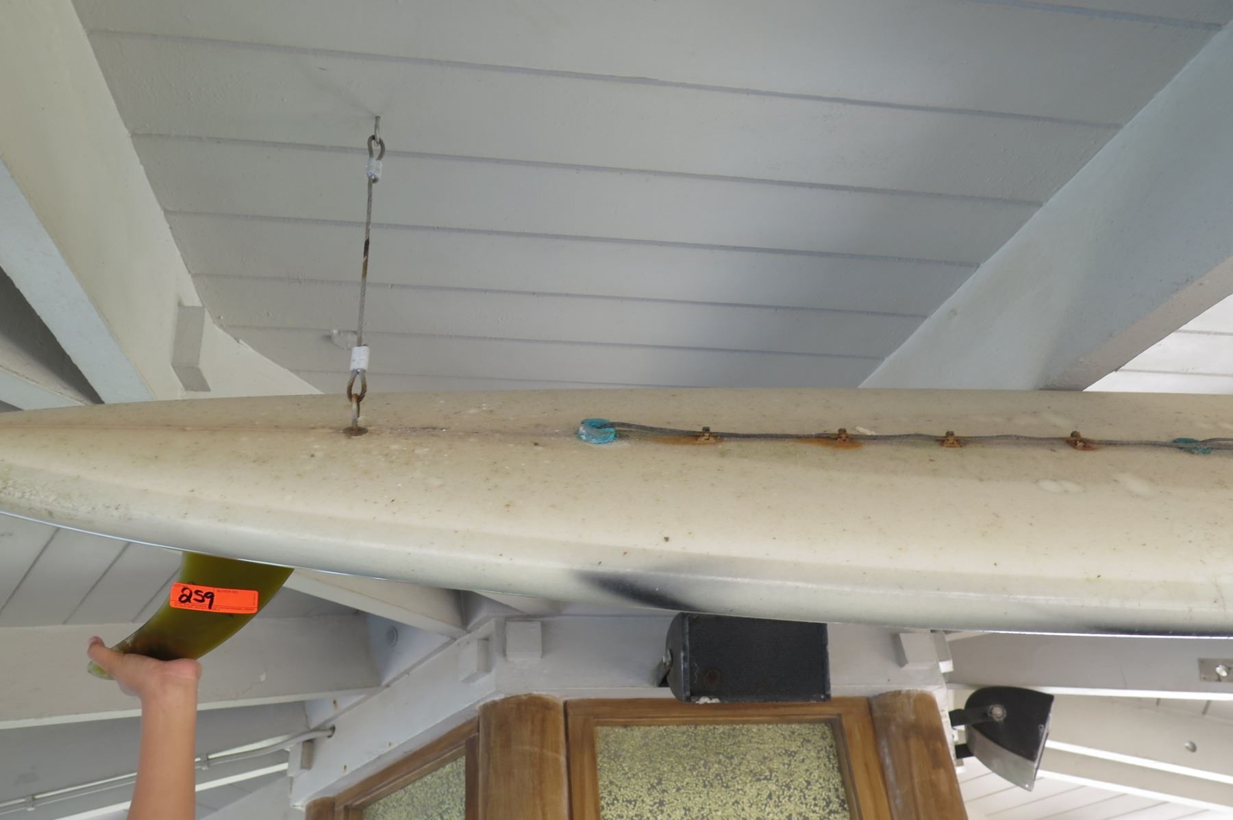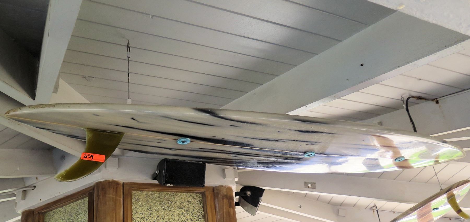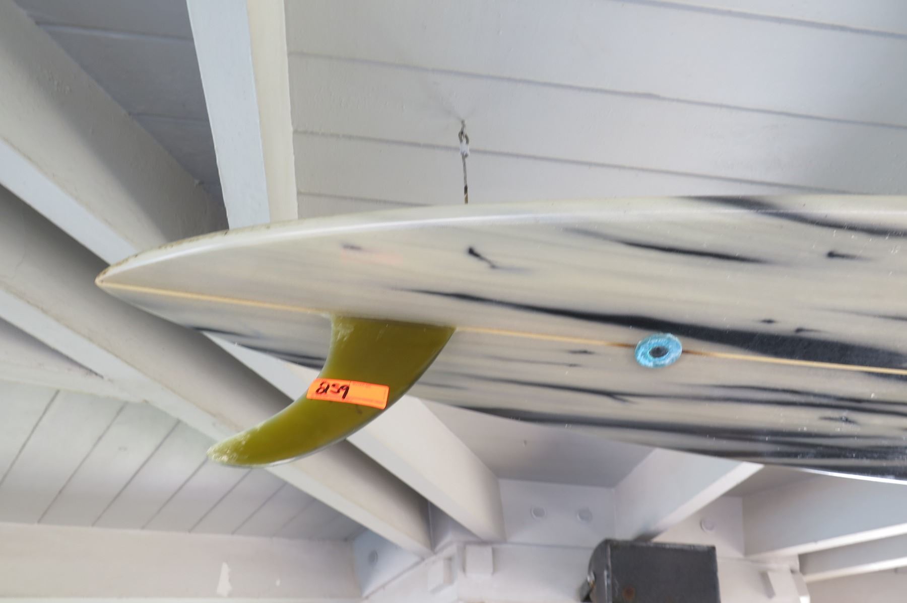Repurposed Surfboard Ceiling Light Fixture, White w/ Black Markings, Approx. 9ft Long