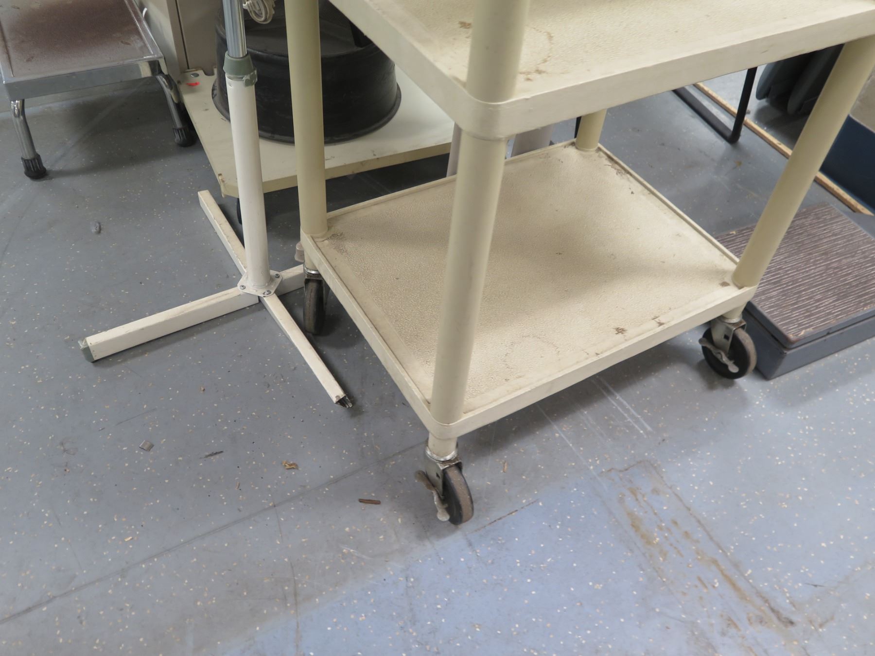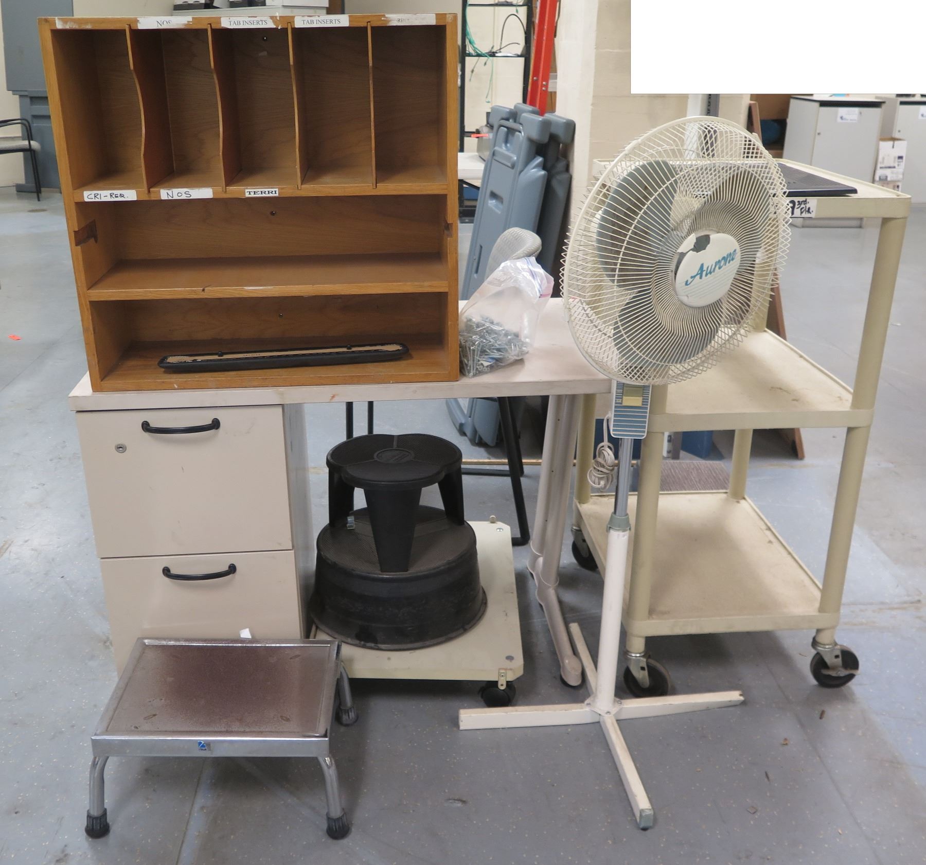 Rolling 2-Tier Metal Cart, Desk w/ 2 Drawers, Step-Stools, Wooden Organizer, Floor Fan, etc