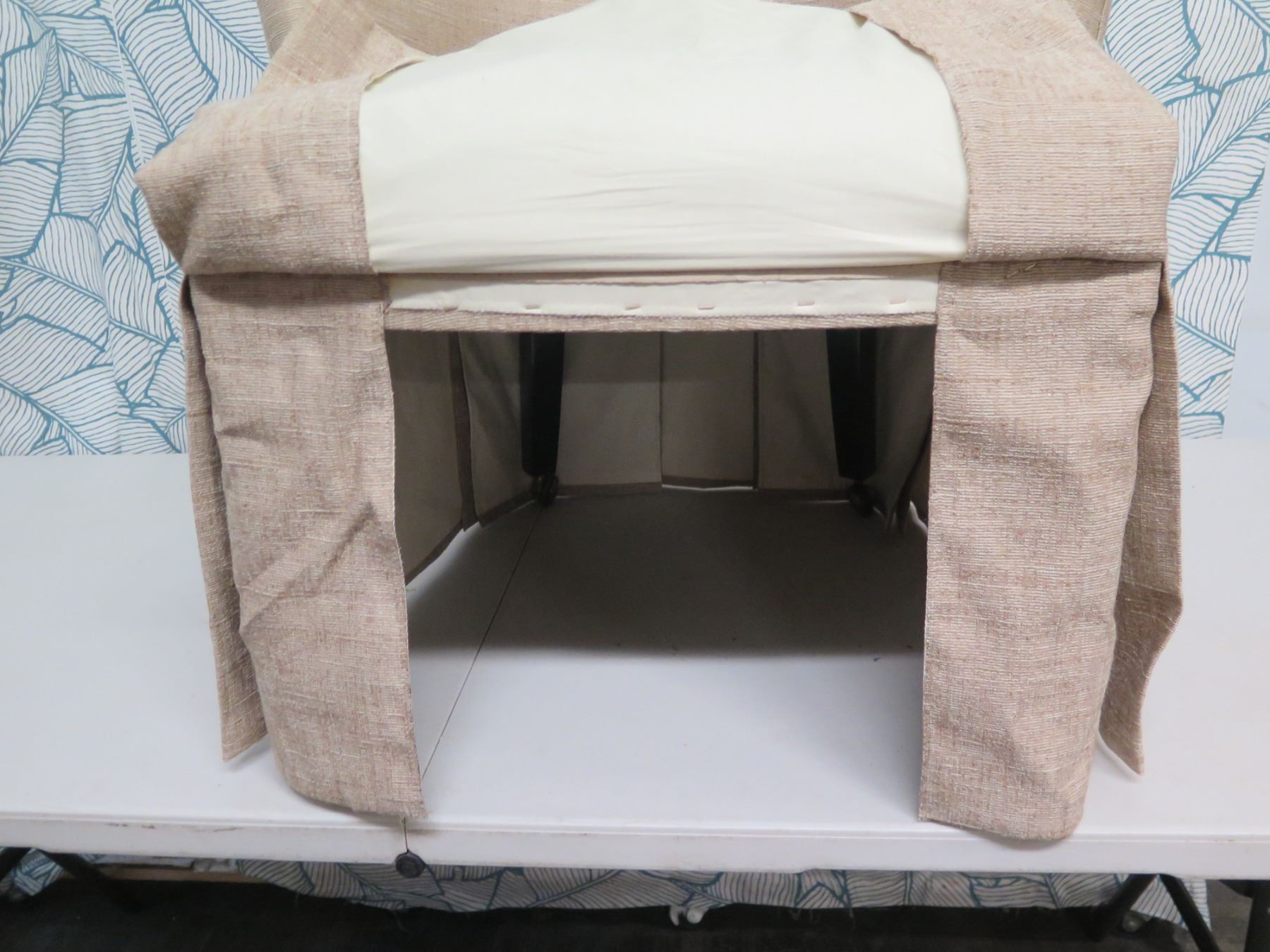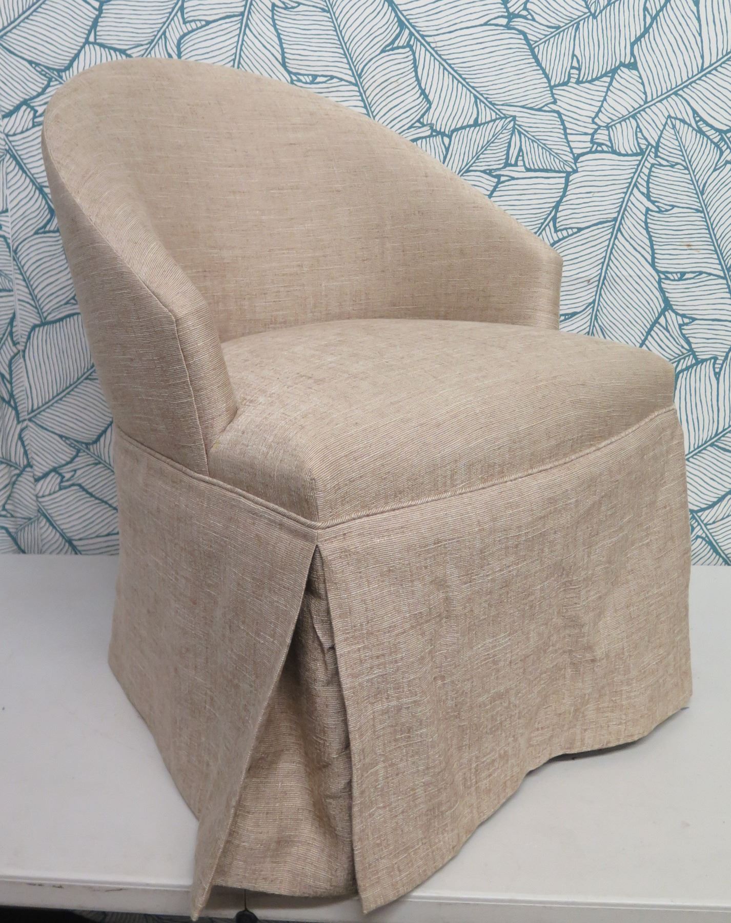 Rolling Curved Back Upholstered Chair w/ Skirt & Hook 23"x21"x34"H, This is a stock photo, representative of item. Condition may vary.