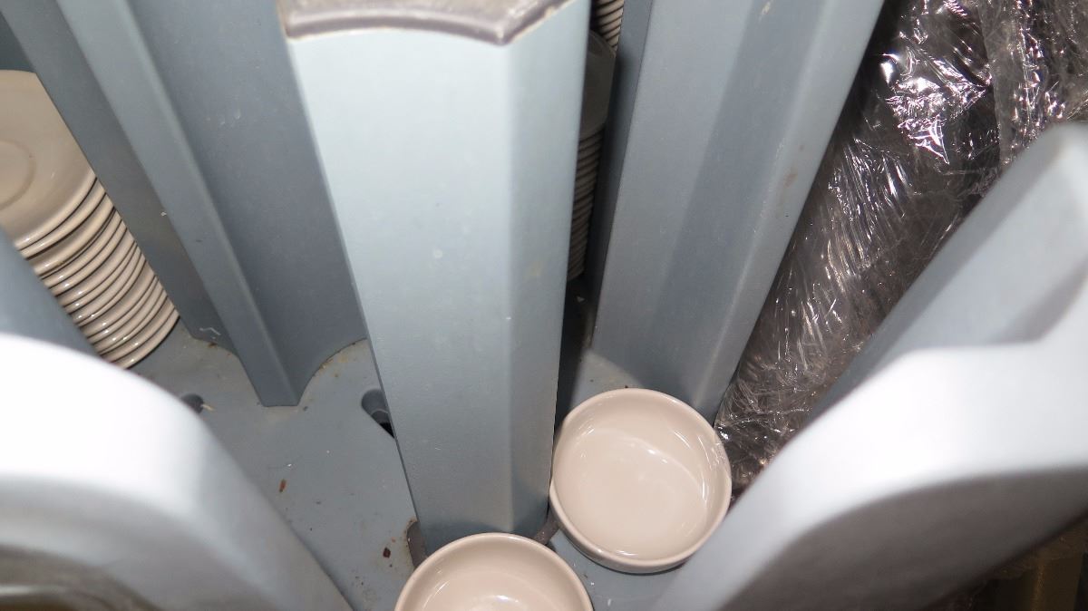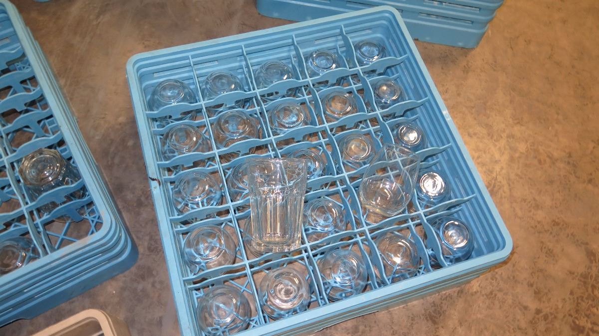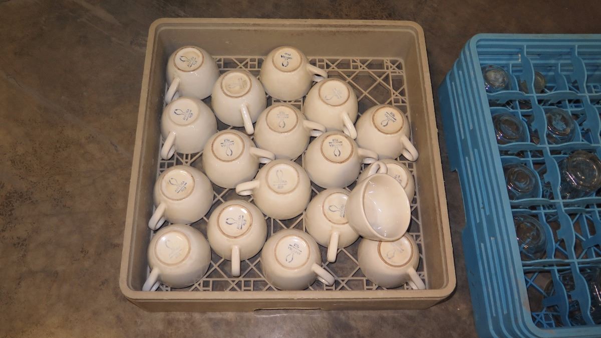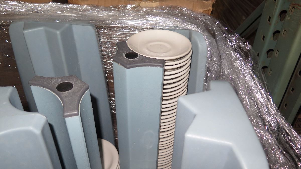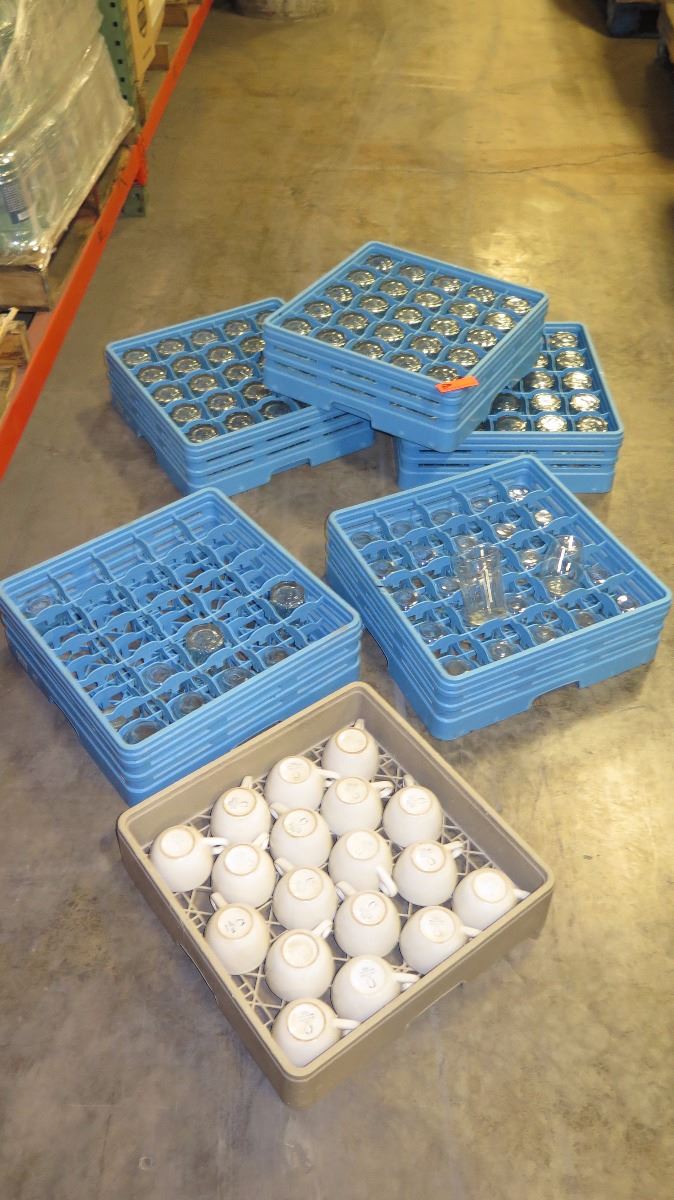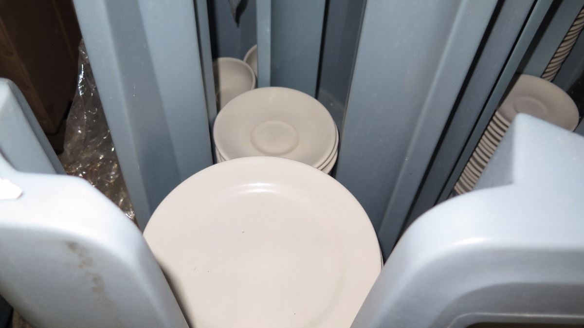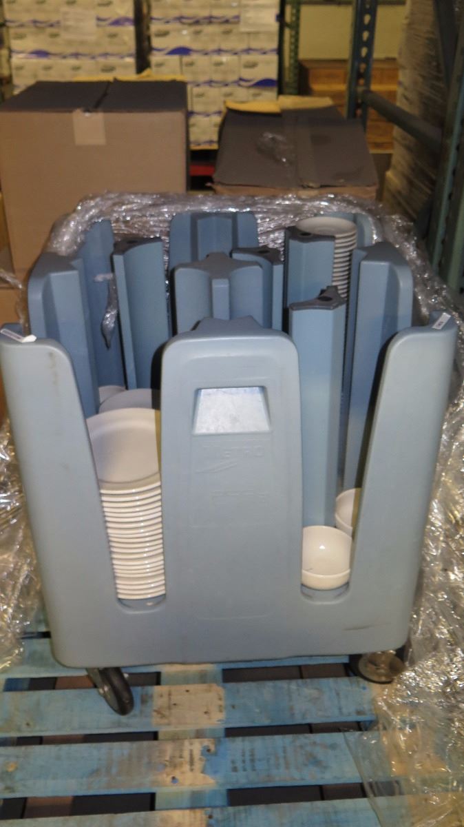 Rolling Dishware Transporter and Large Lot of Porcelain Cups & Plates w/Dish Racks