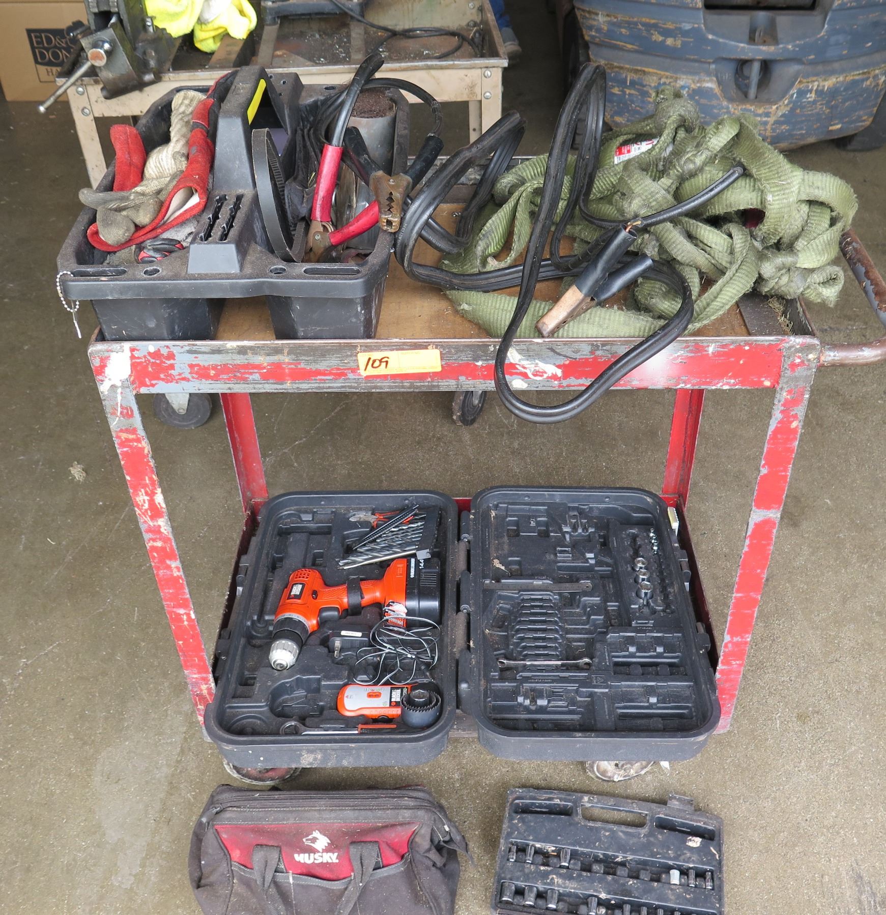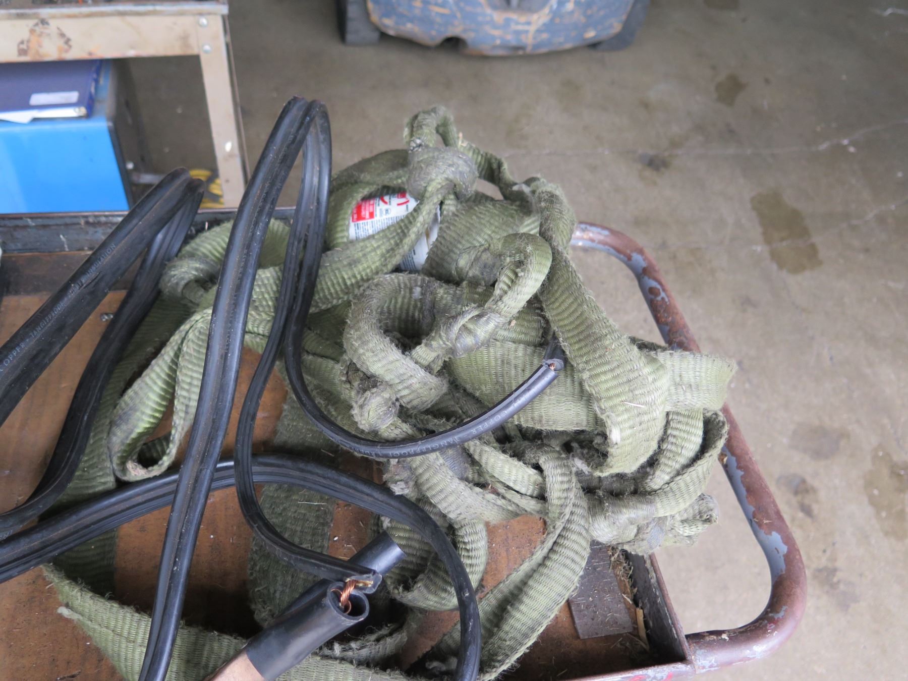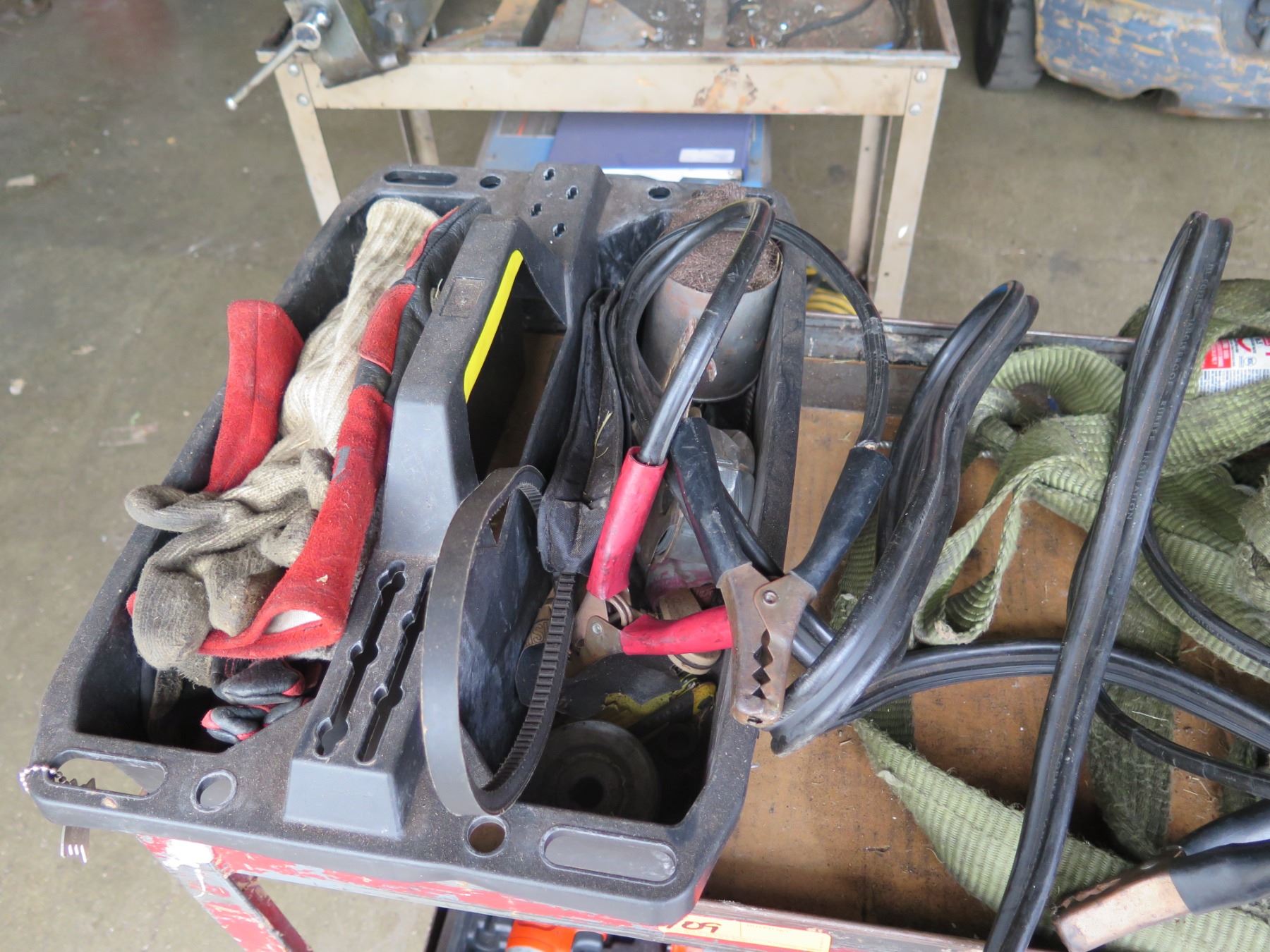 Rolling Metal Cart w/ Undershelf & Contents: Tools, Jumper Cables, Strapping, etc