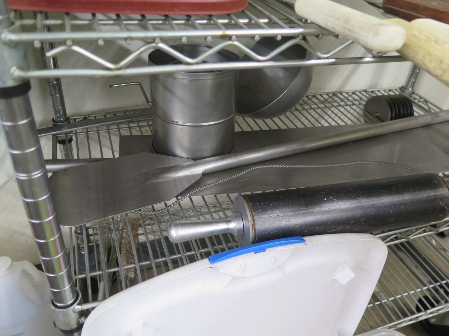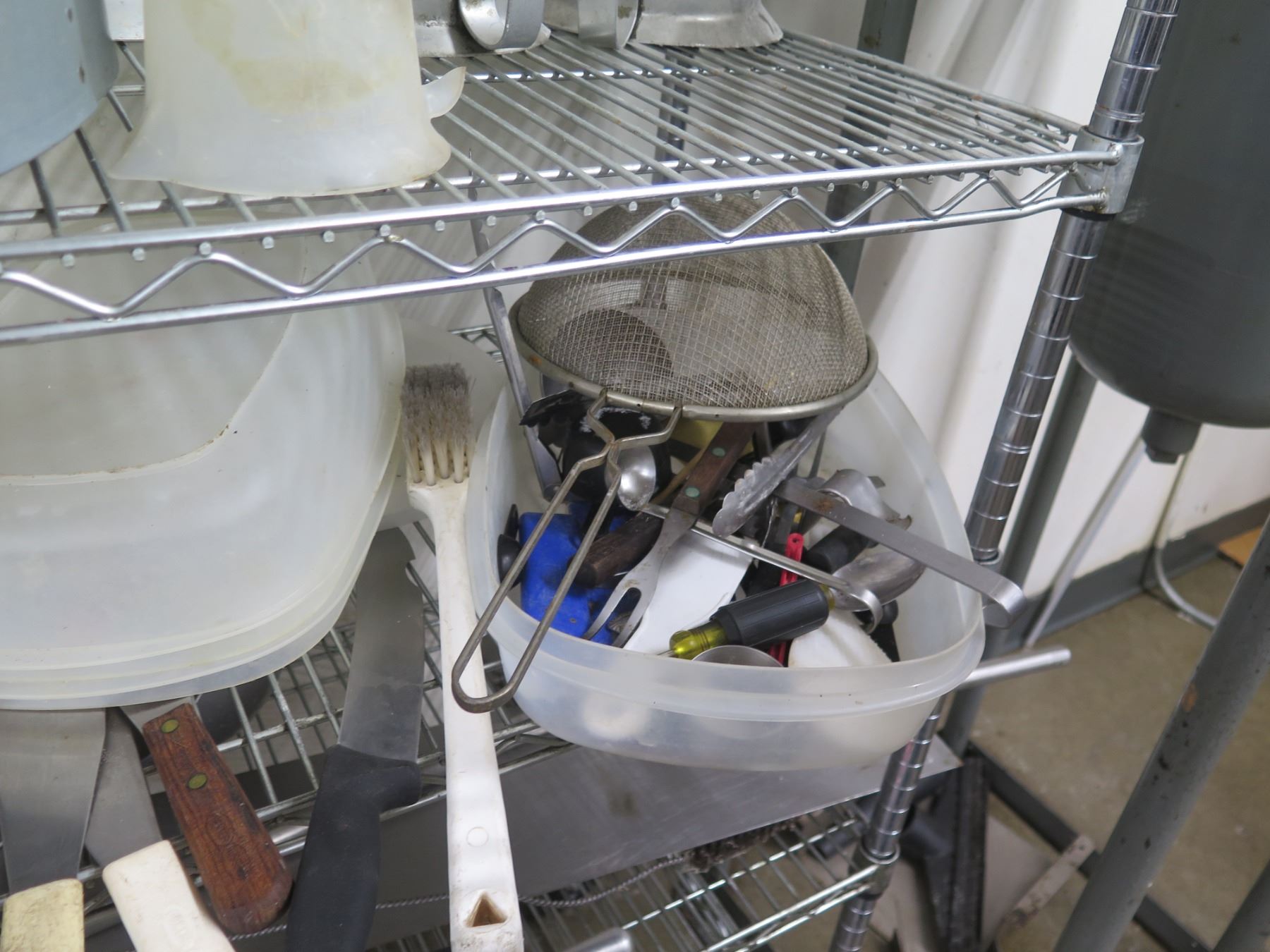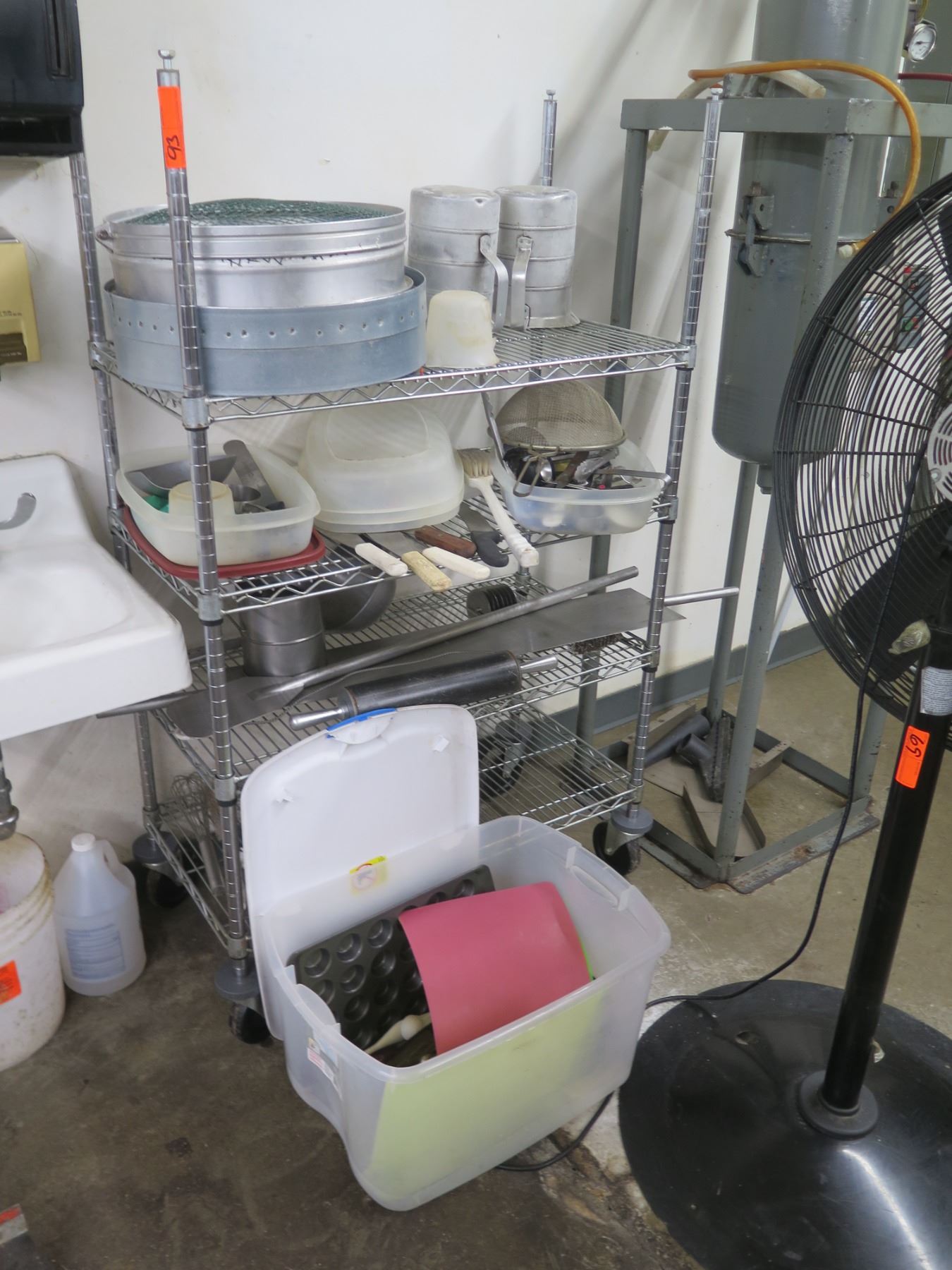 Rolling Metal Mesh 4-Tier Adjustable Shelf & Contents: Sifters, Utensils, etc