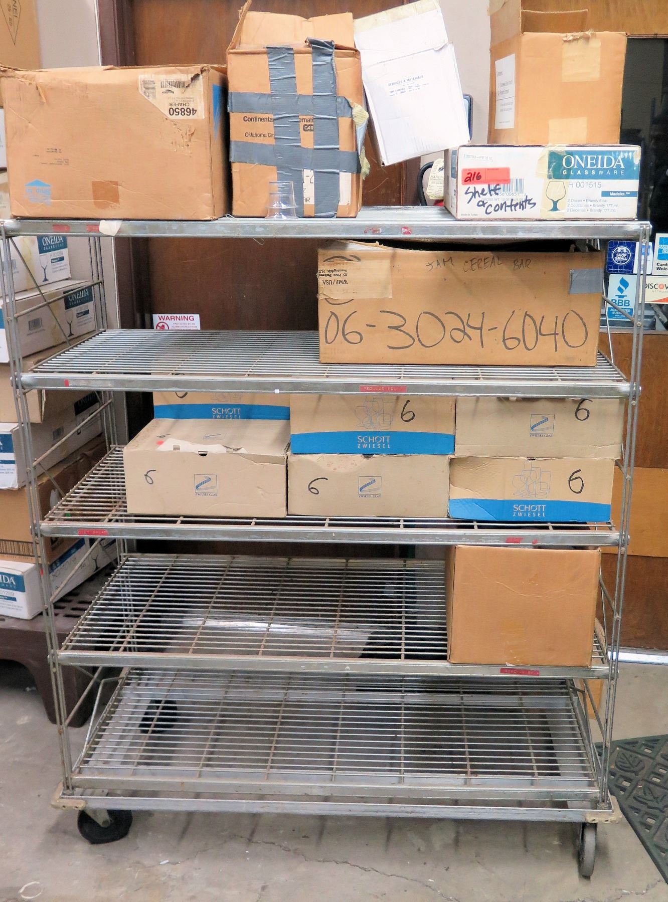 Rolling Metal Wire 3-Tier Adjustable Shelving Unit & Contents - Glassware, Ramekins, etc