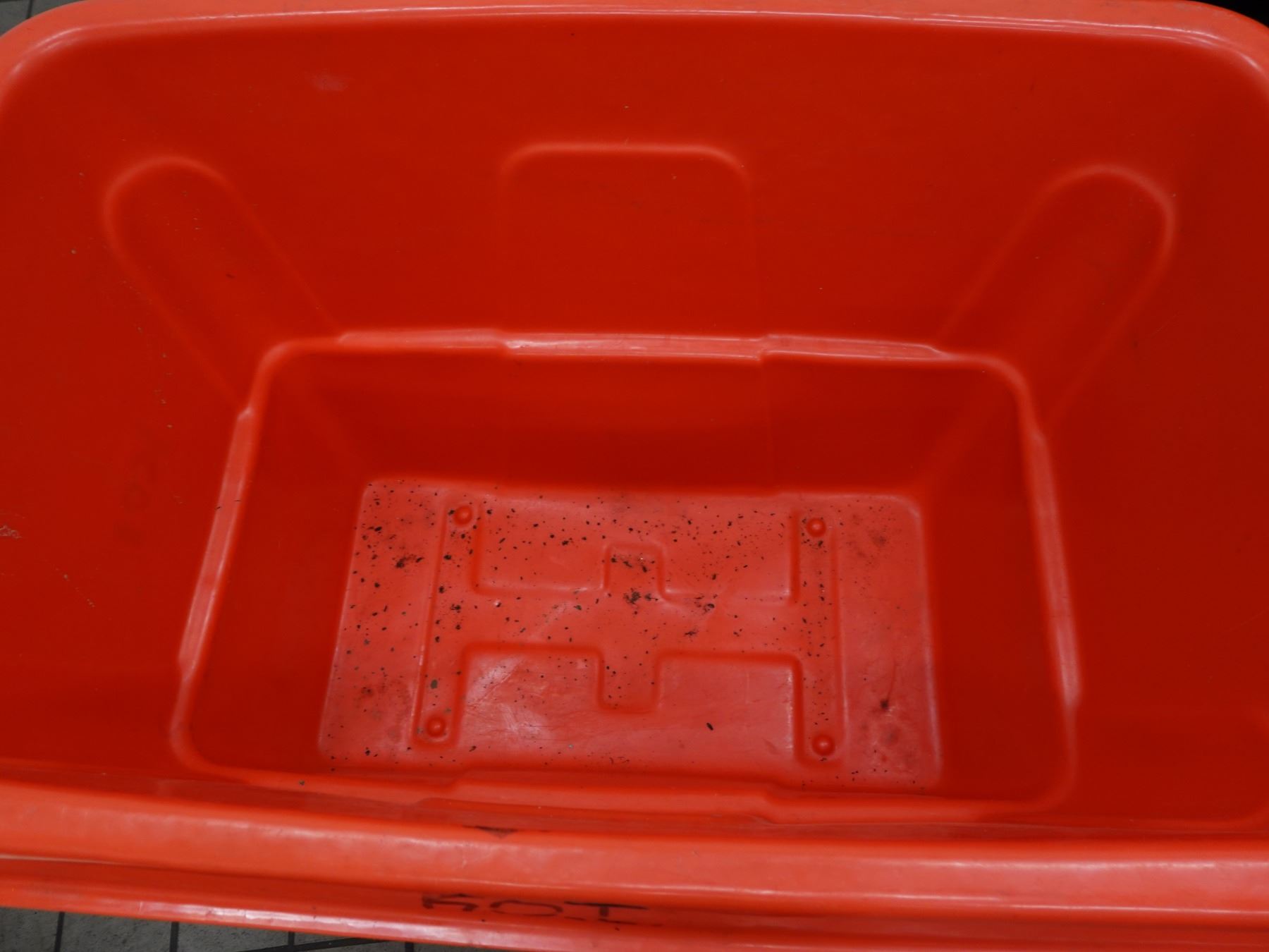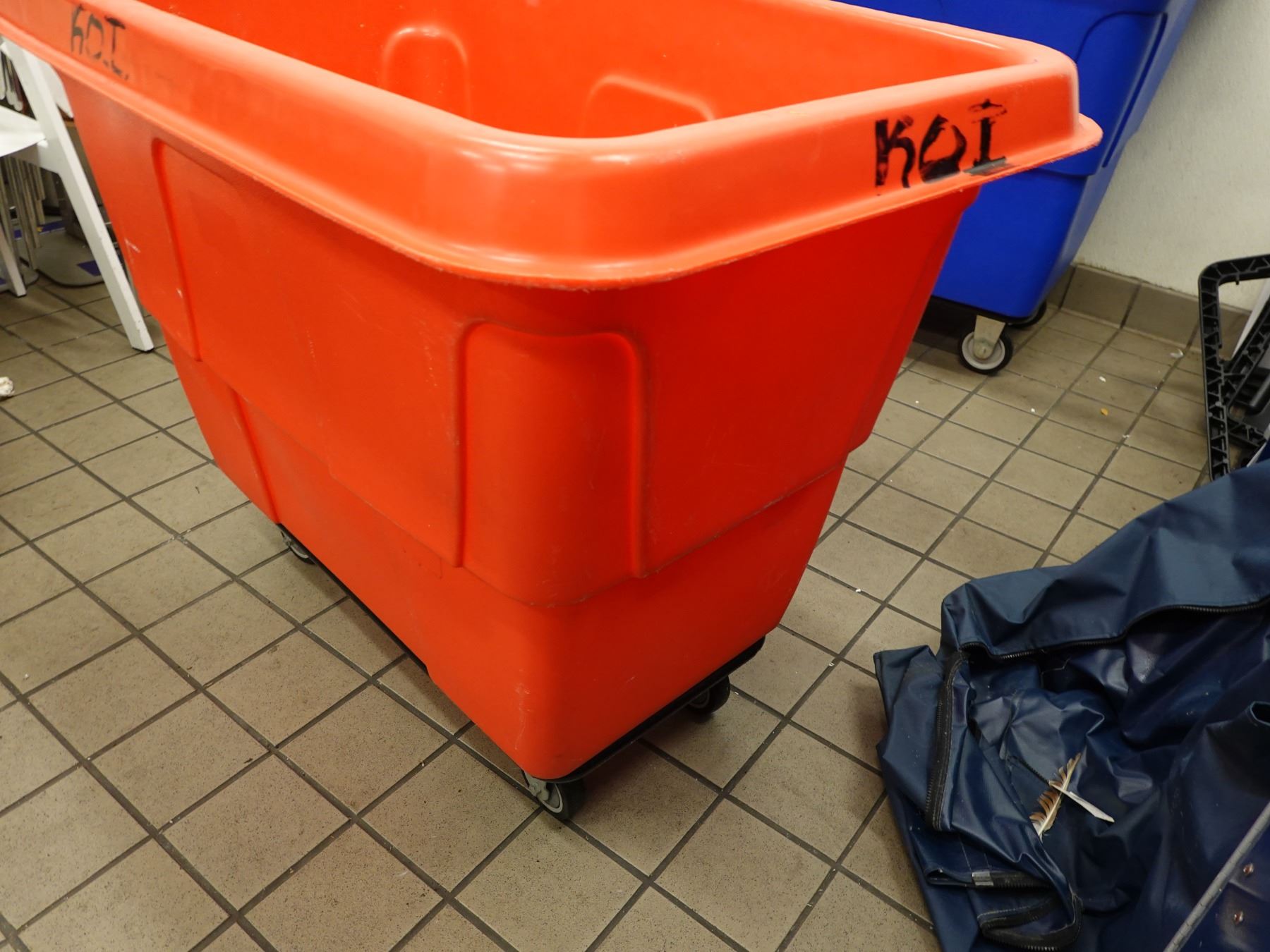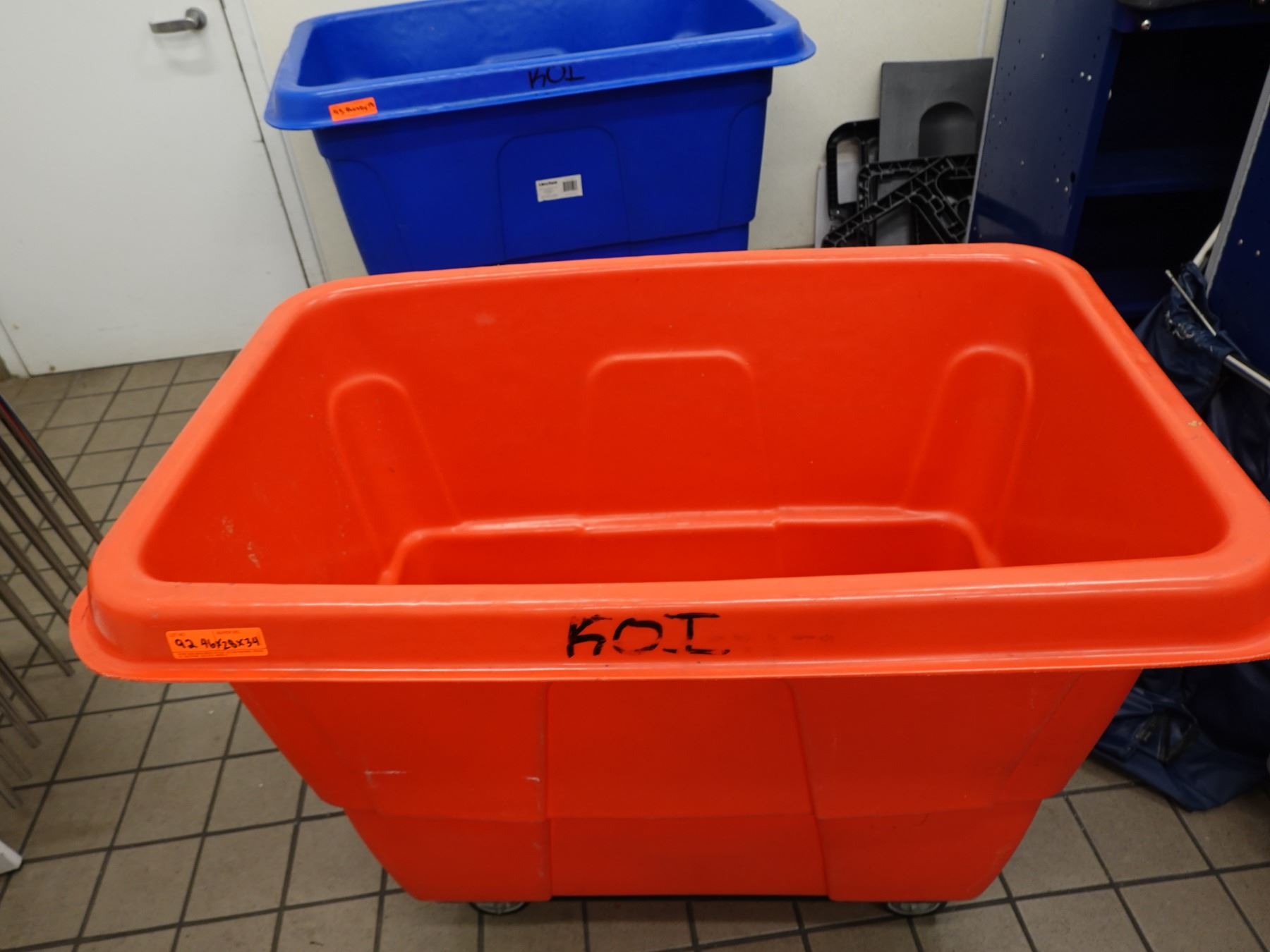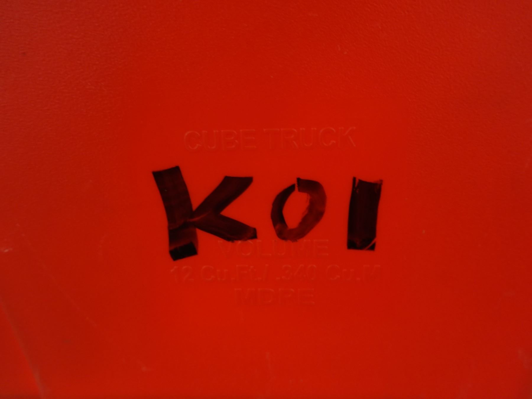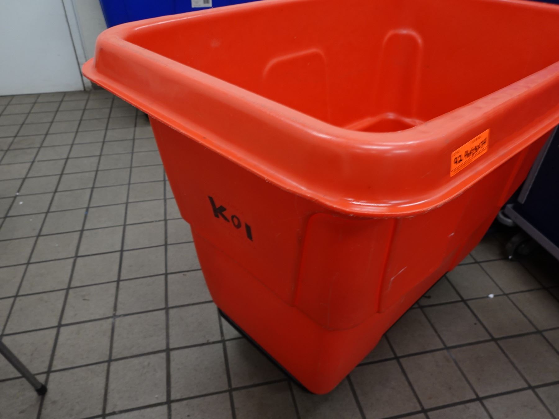 Rolling Orange Bin Marked KOI 46" x 28" x 34"H. Note: This item is large, heavy and may have sharp edges or grease. Removal is at buyer's risk; bring tools, equipment & help.