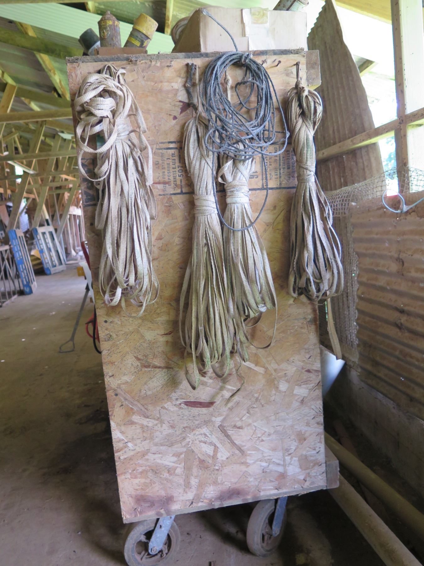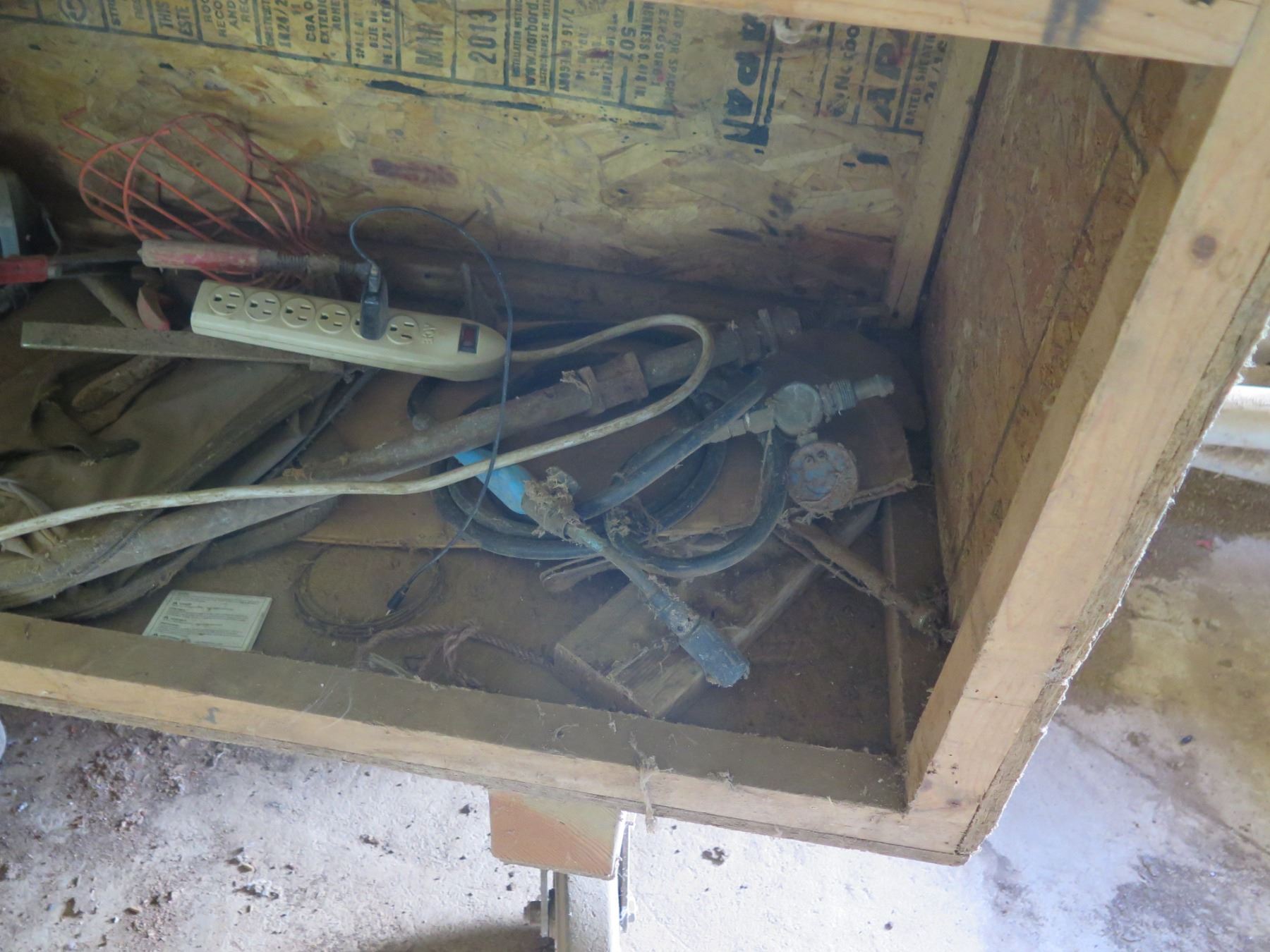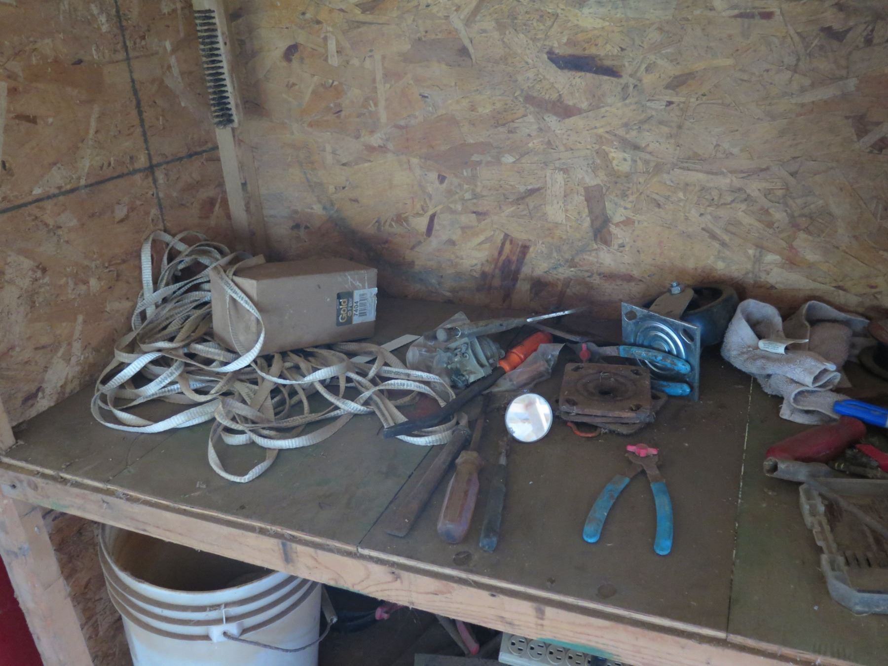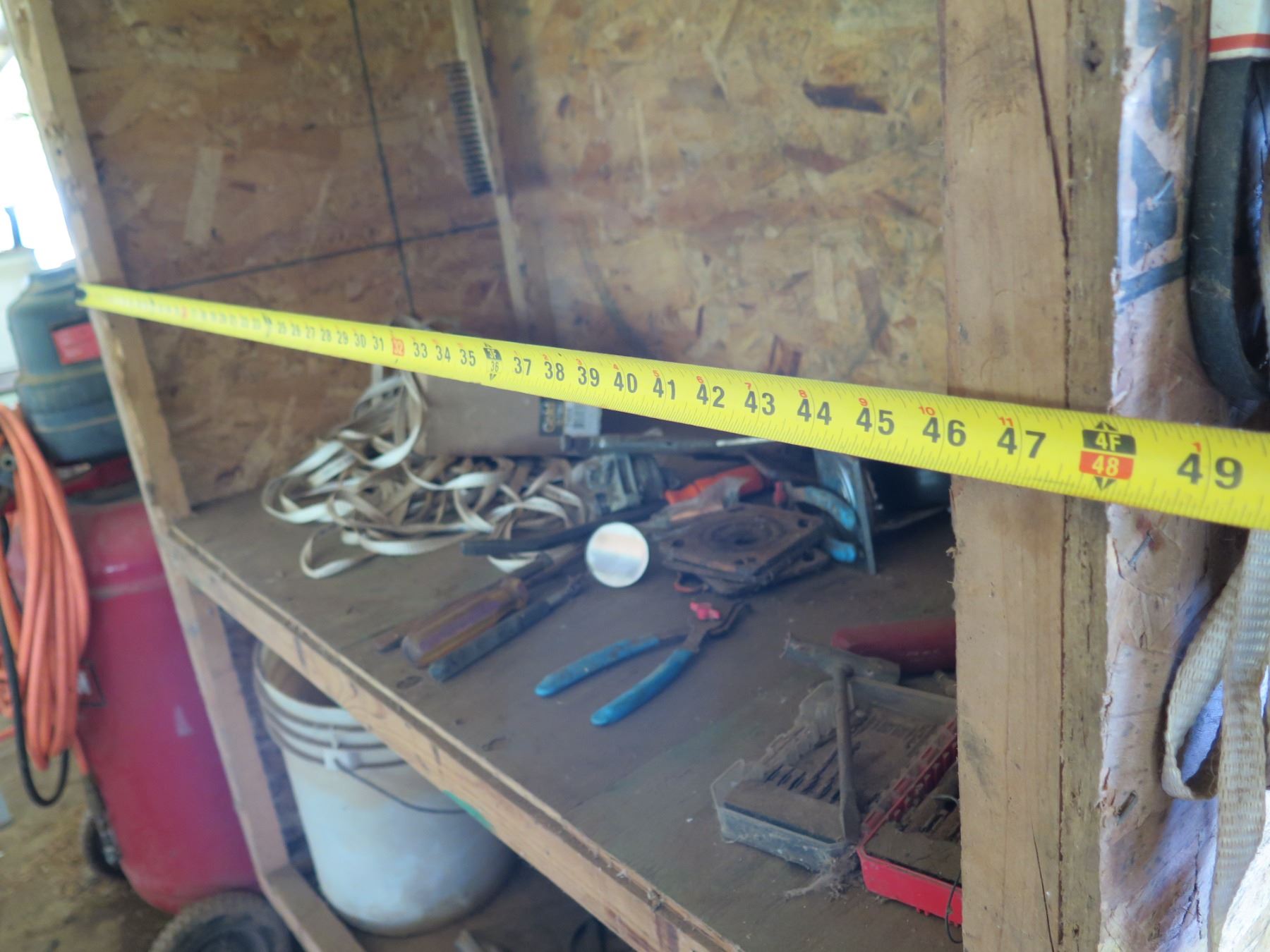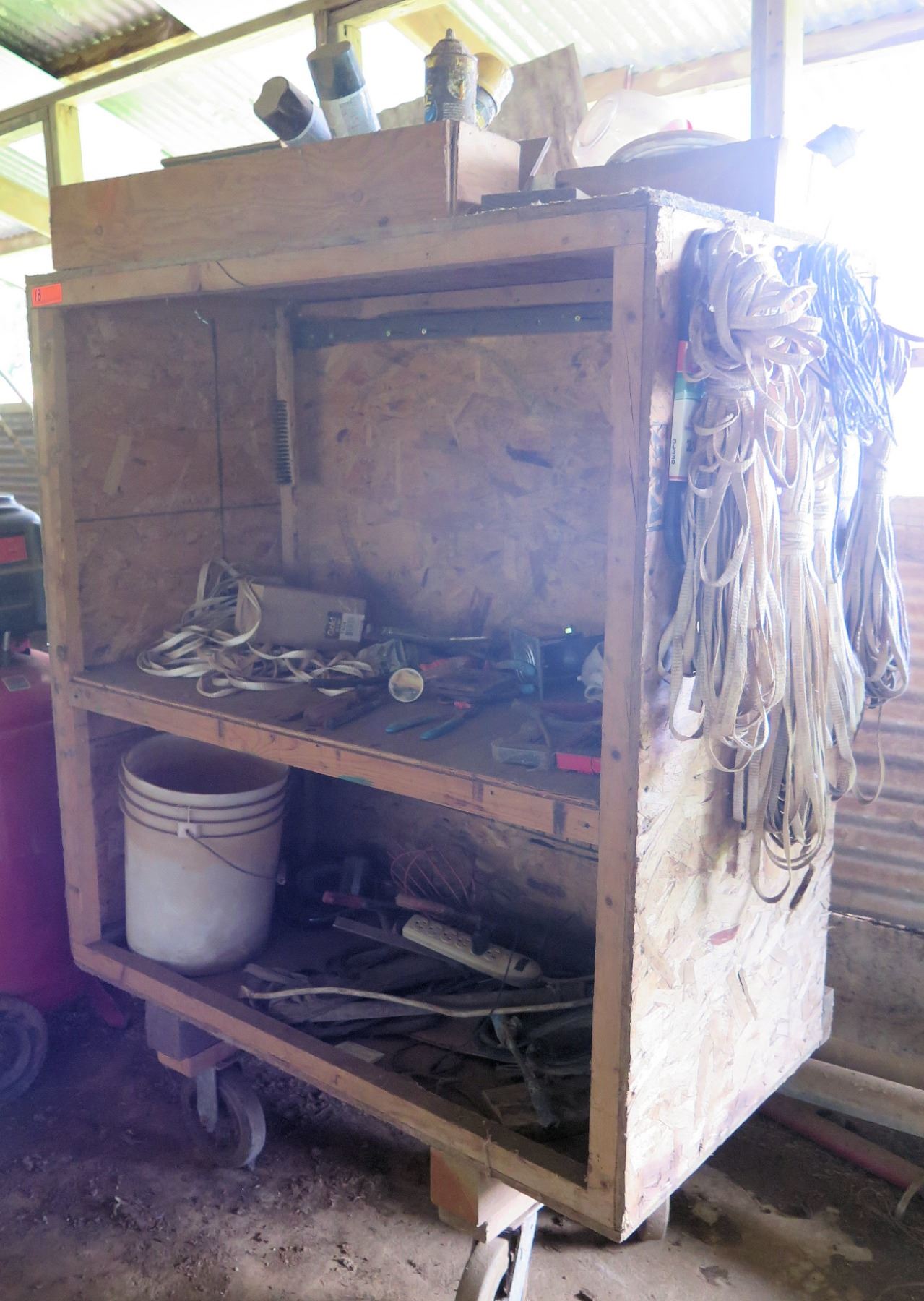 Rolling Plywood 2-Section Storage Unit & Contents: Straps, Tools, etc 48" x 24" x 64"H