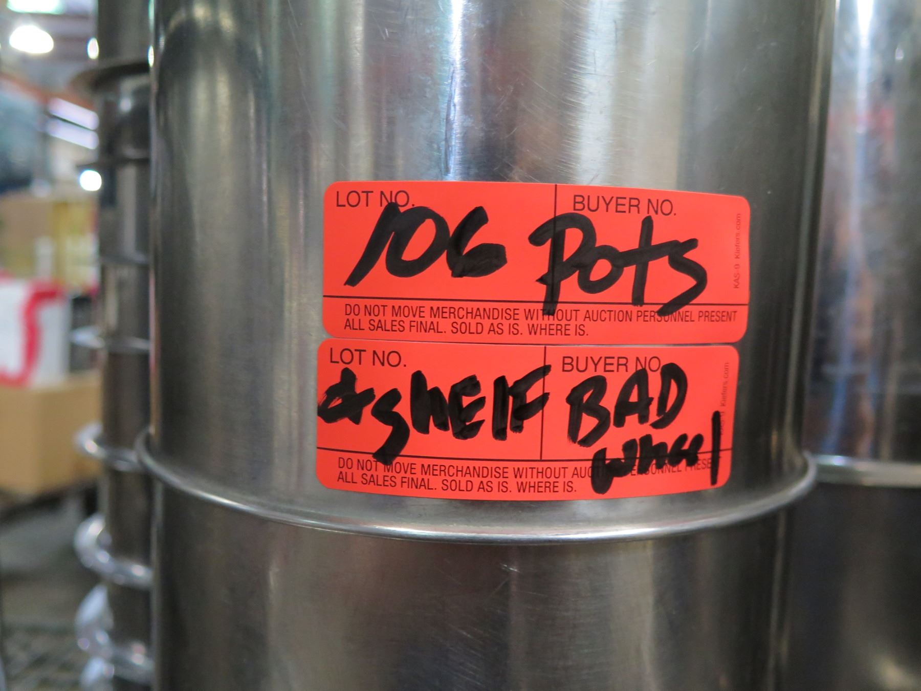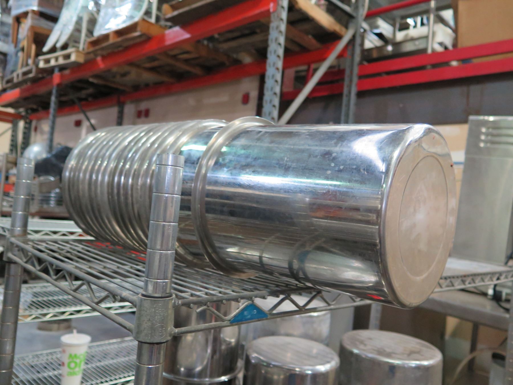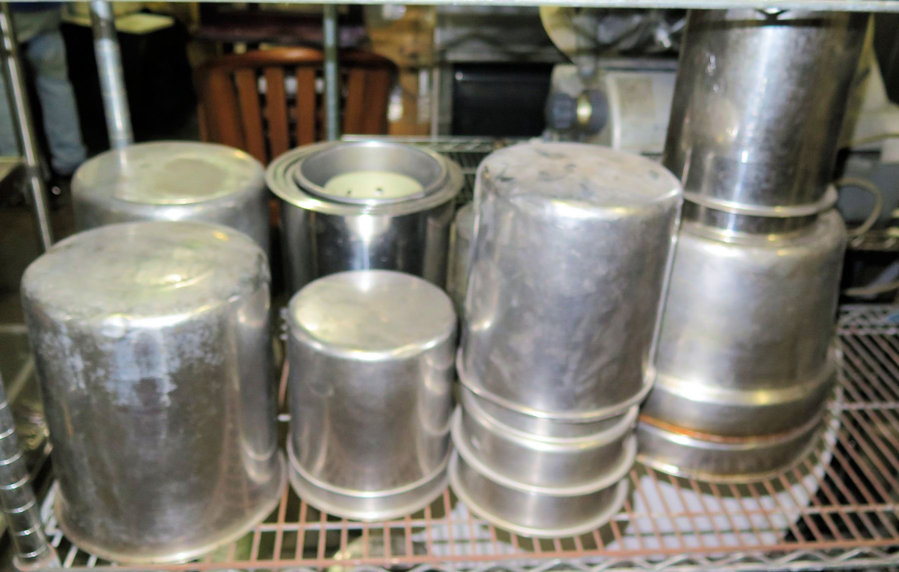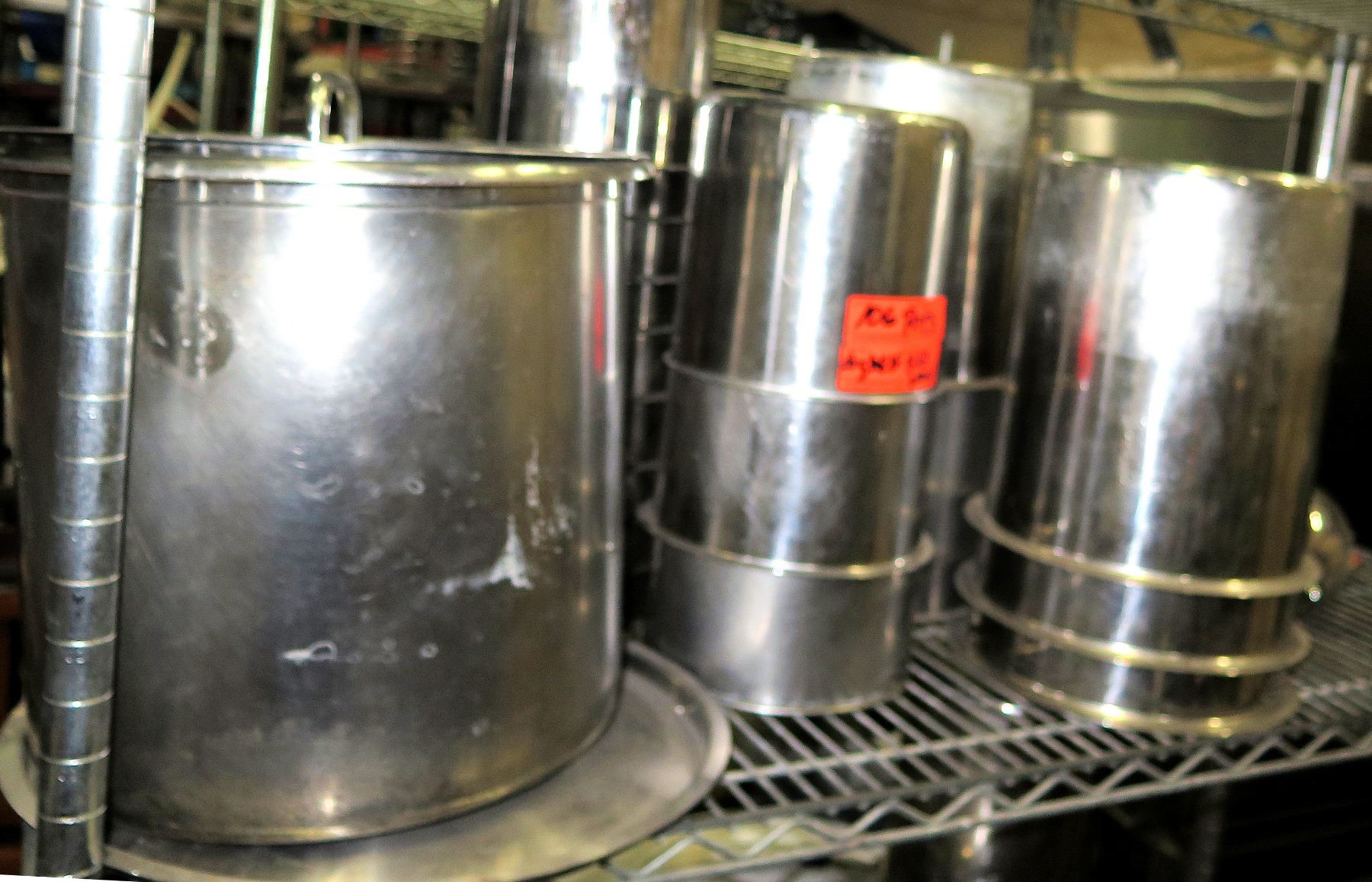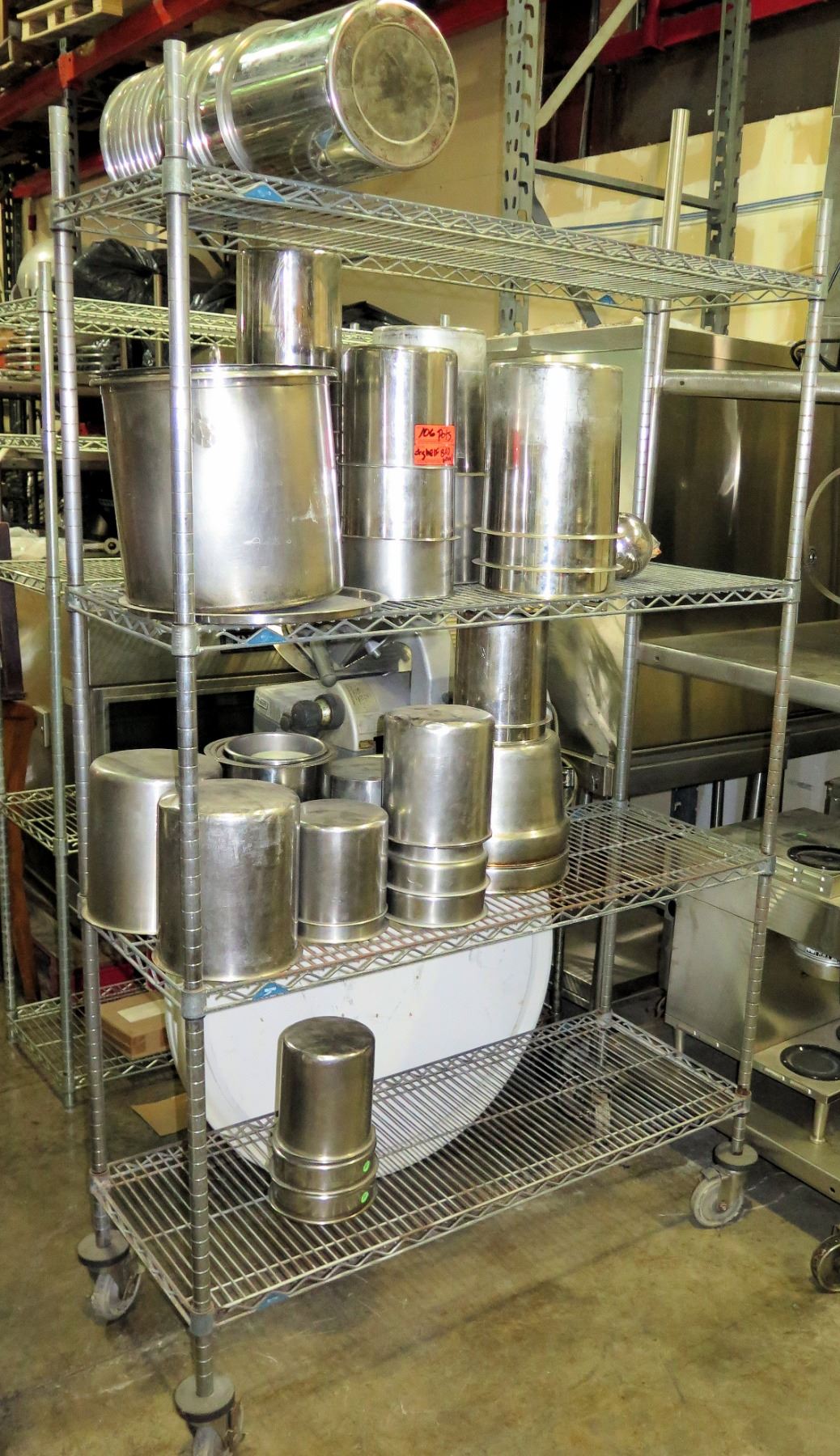 Rolling Shelving Unit (w/ bad wheel) & Contents - Stainless Steel Pots & Containers