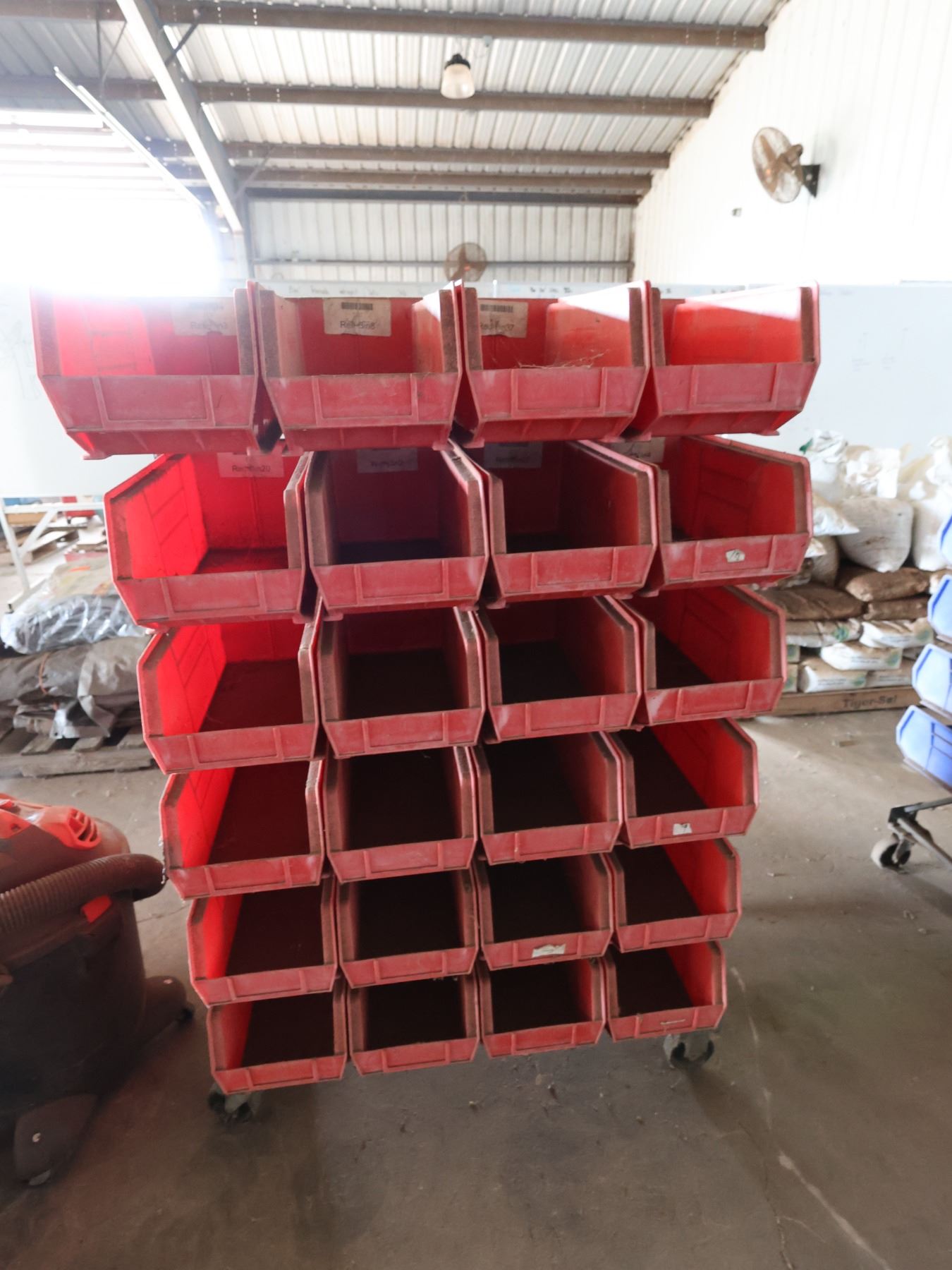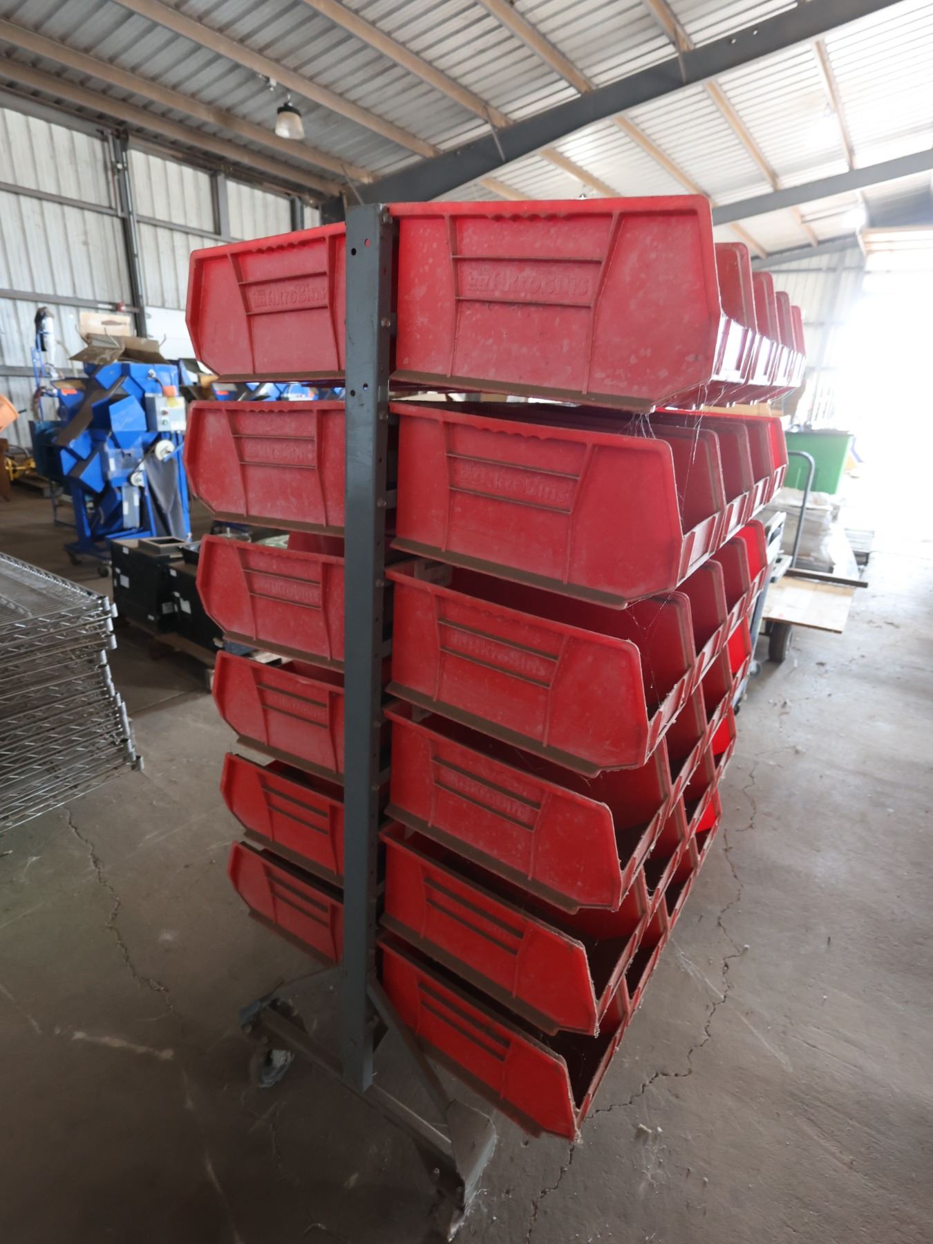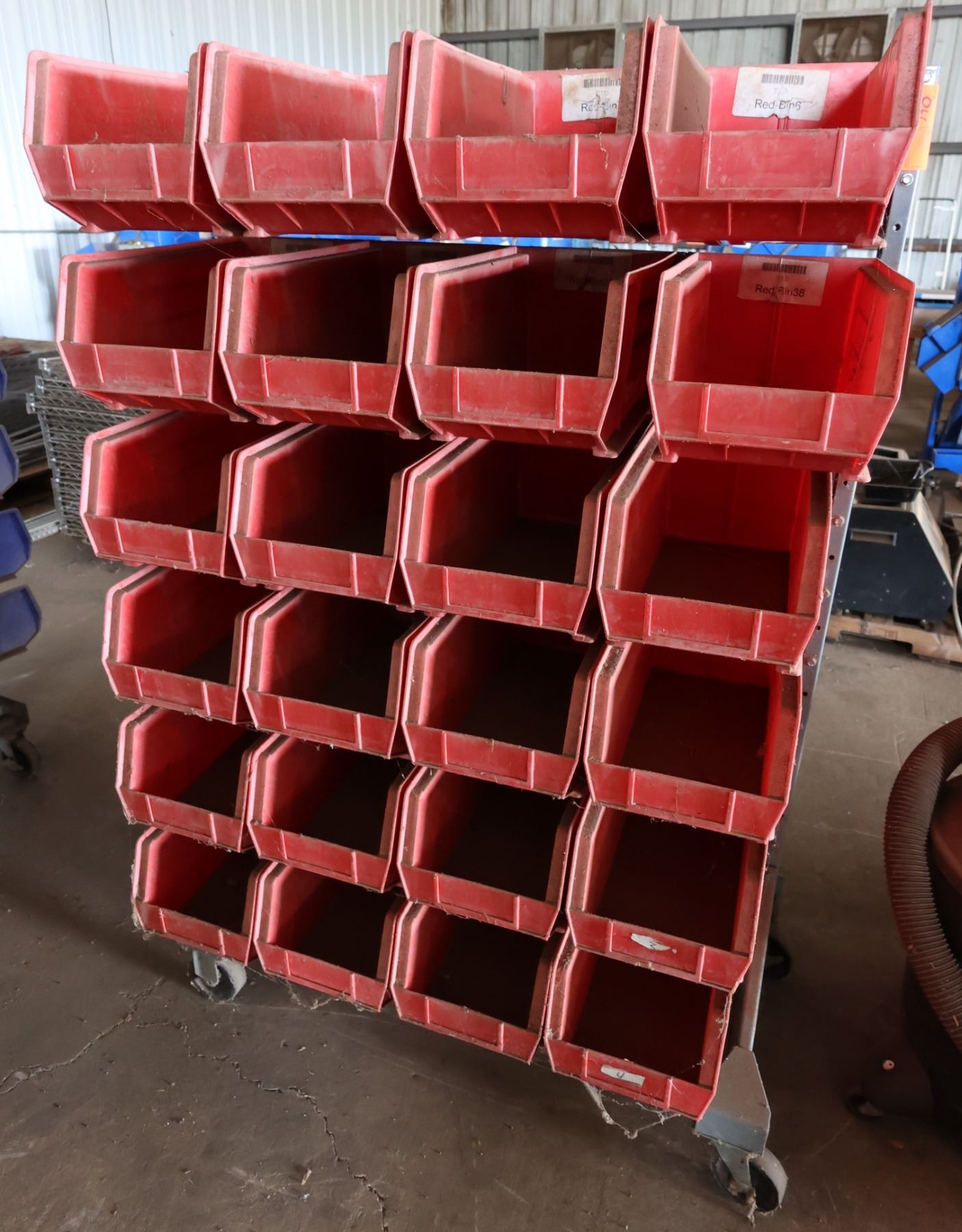 Rolling Storage Bin Rail Floor Rack w/ Red Bins