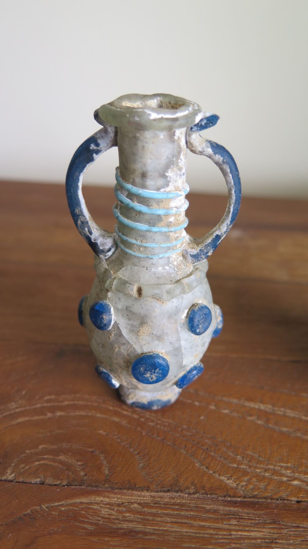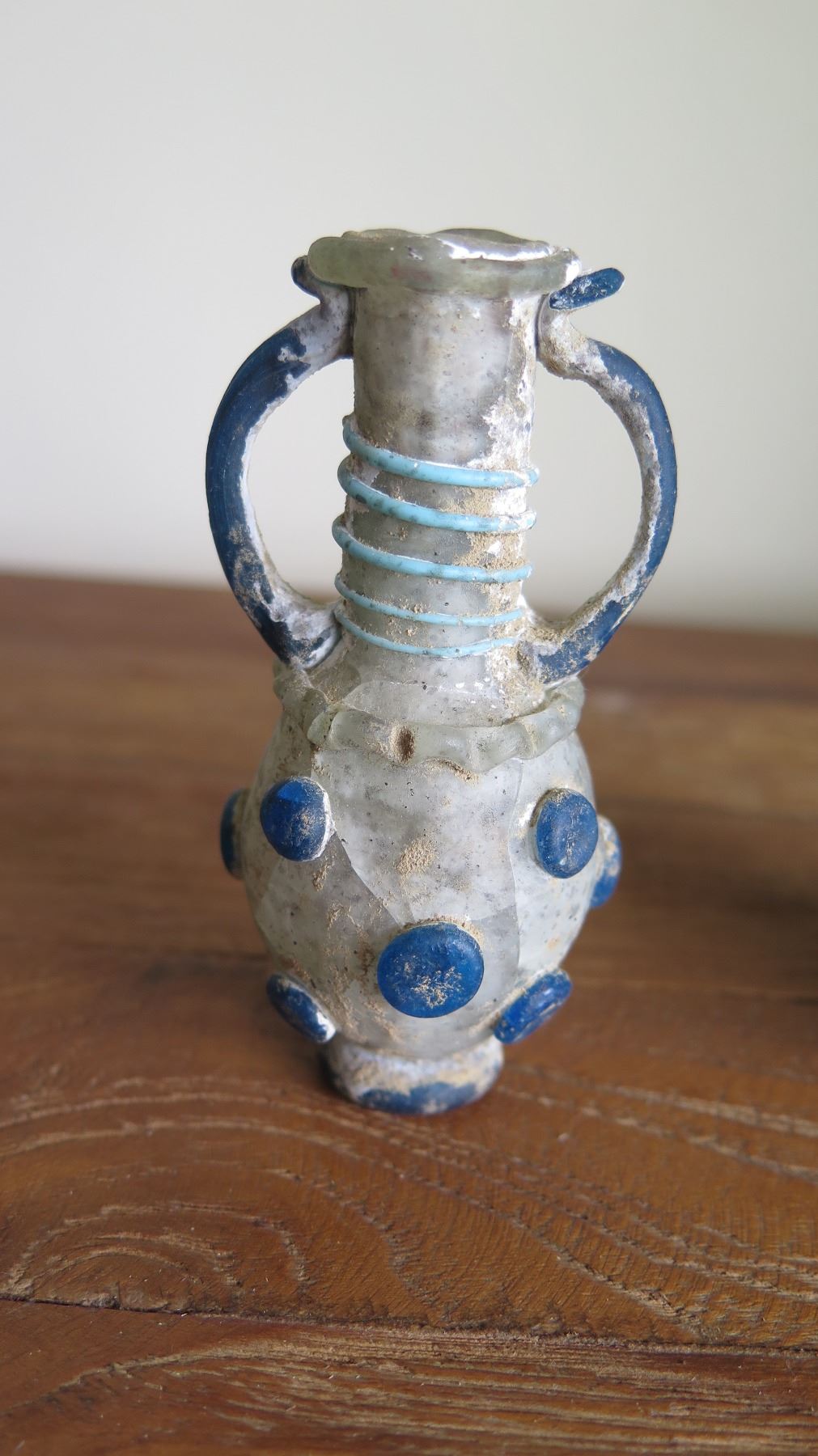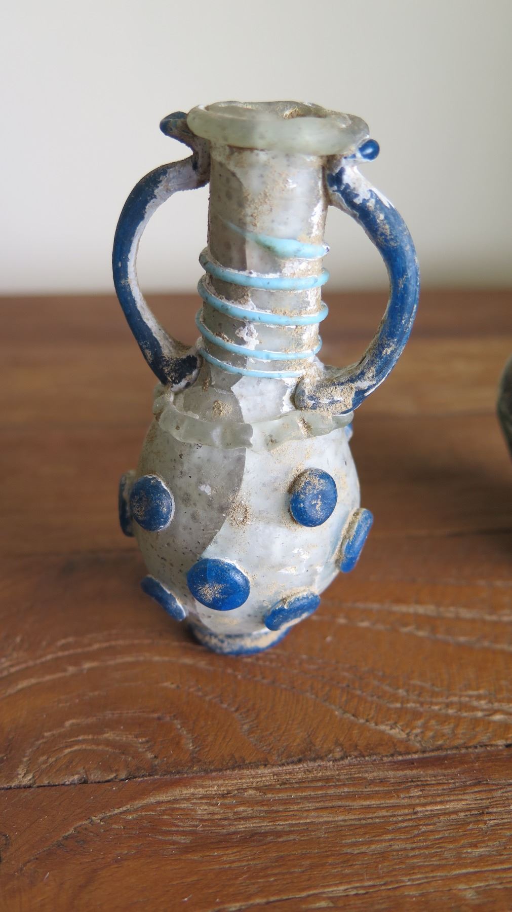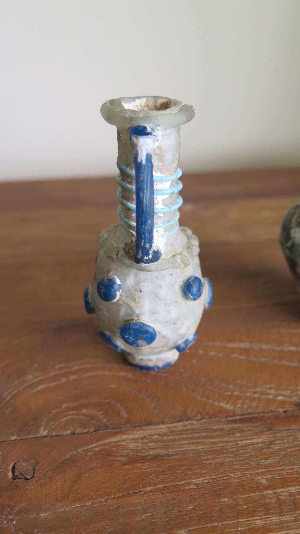 Roman Period Glass Perfume Bottle Ewer with Handles & Small Jar