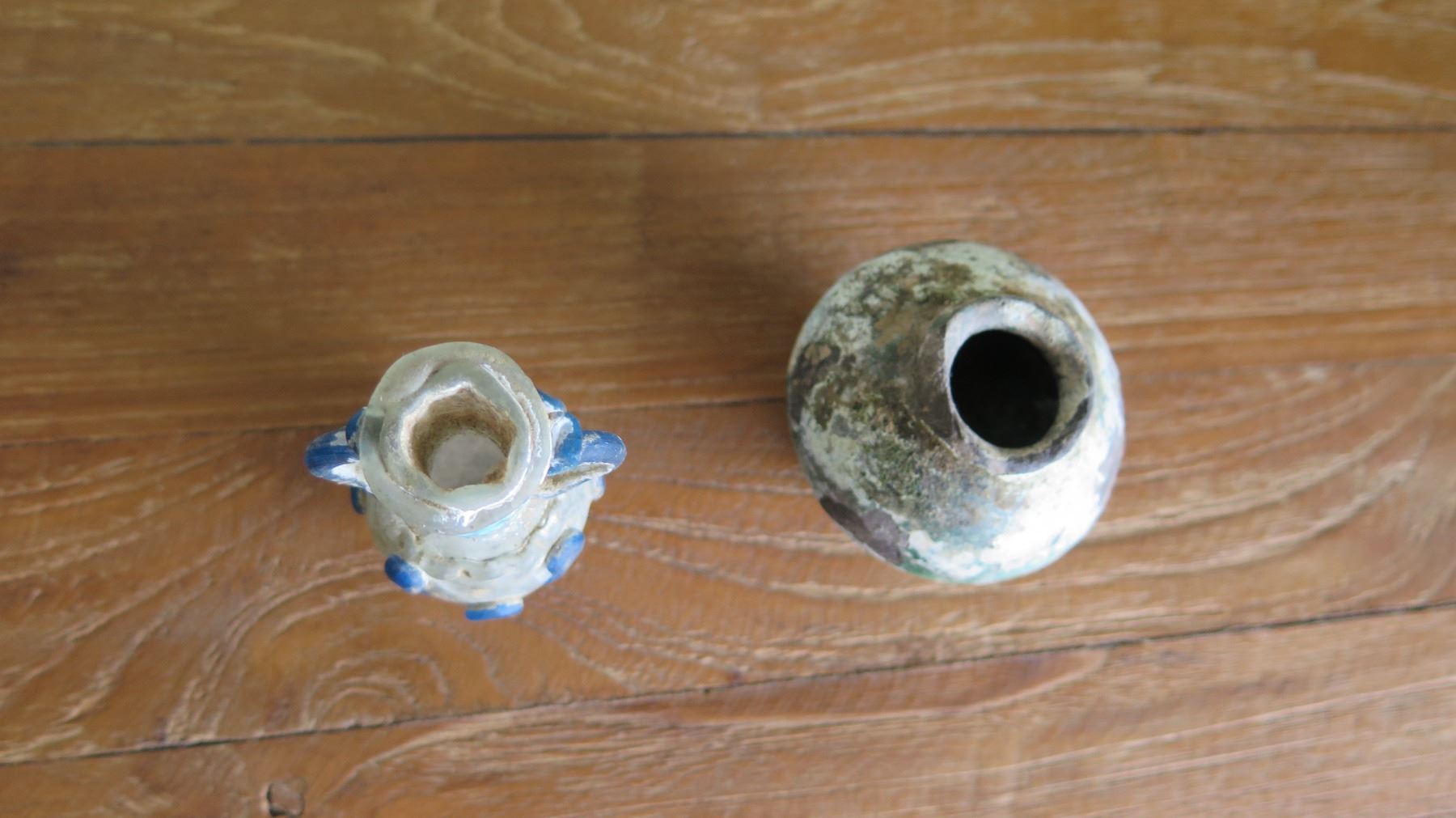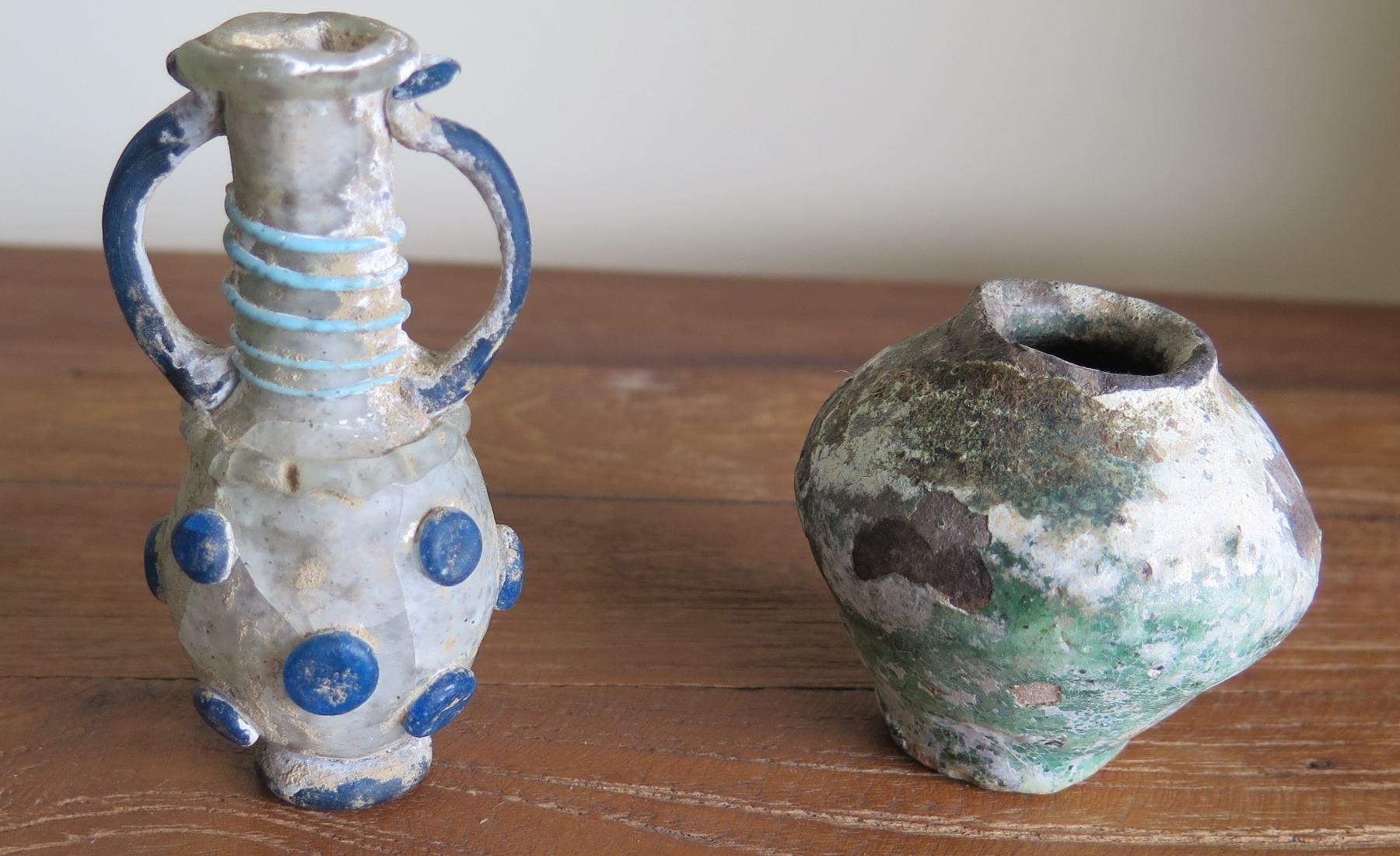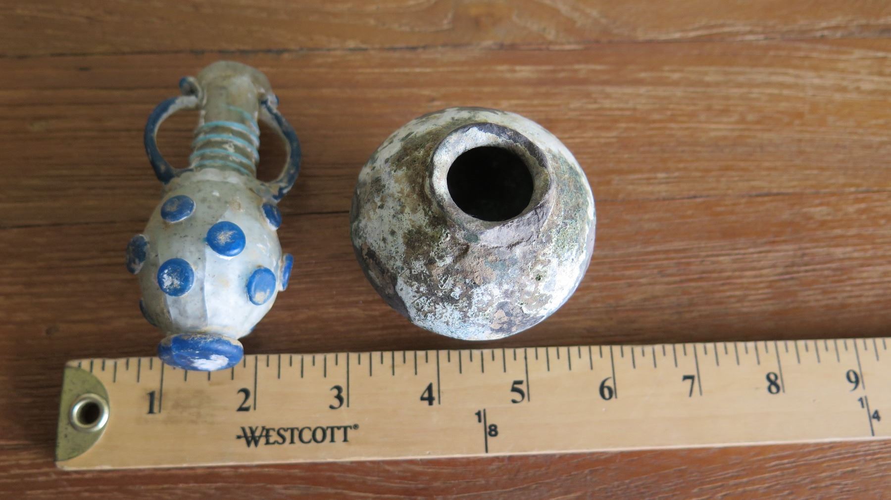 Roman Period Glass Perfume Bottle Ewer with Handles & Small Jar