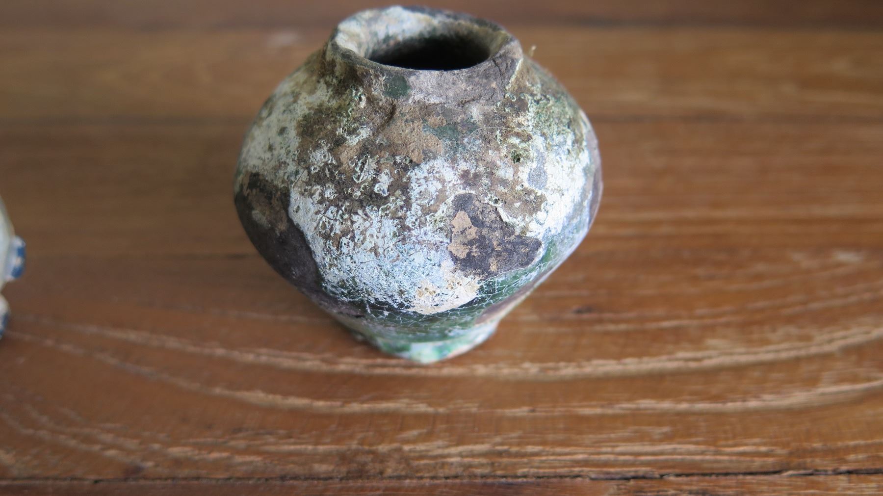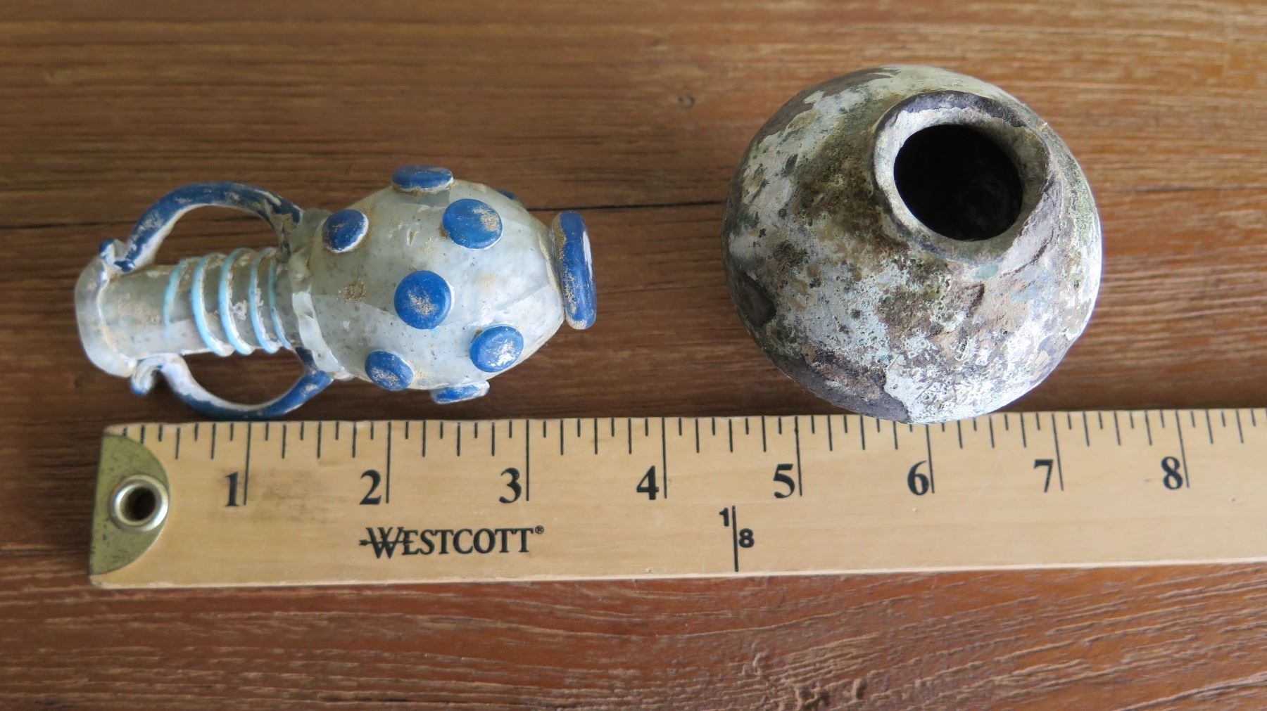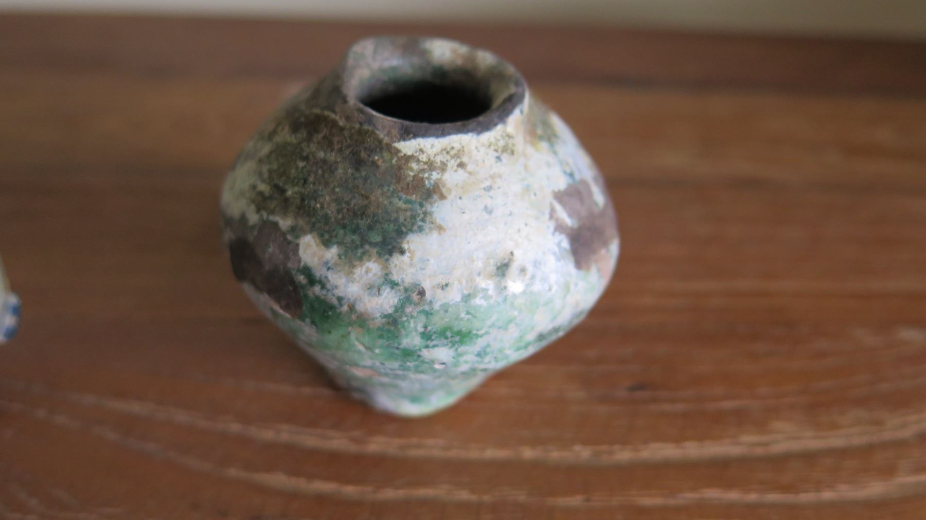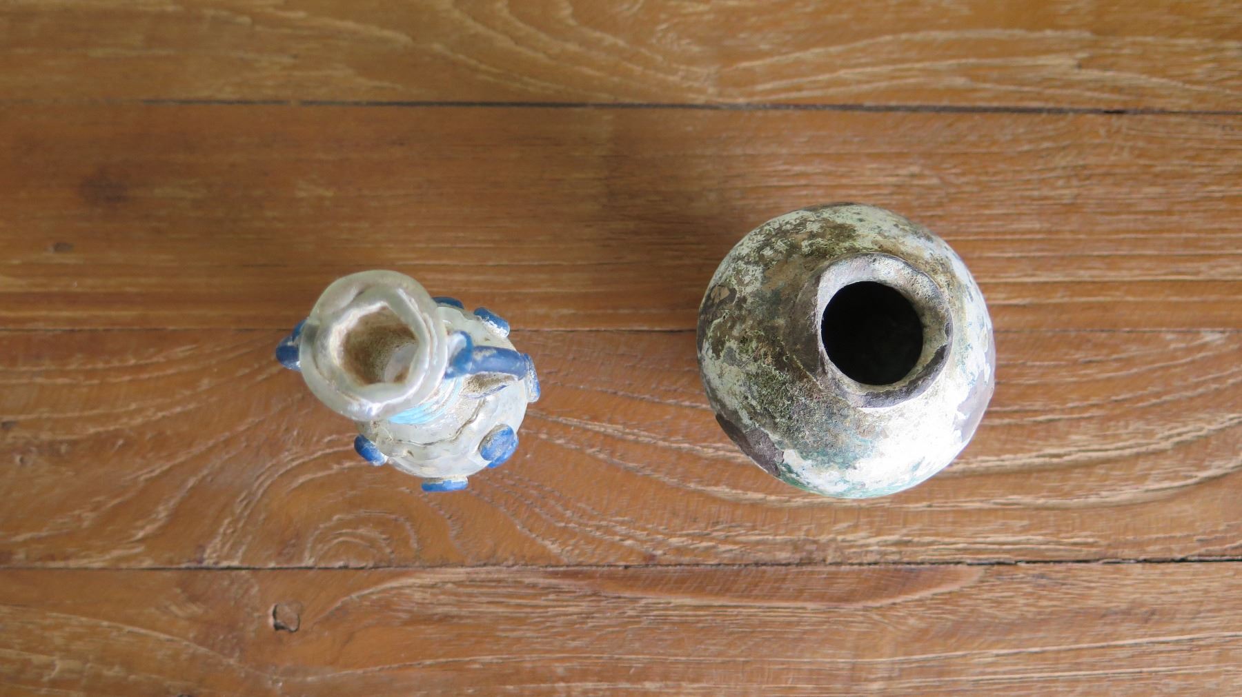 Roman Period Glass Perfume Bottle Ewer with Handles & Small Jar