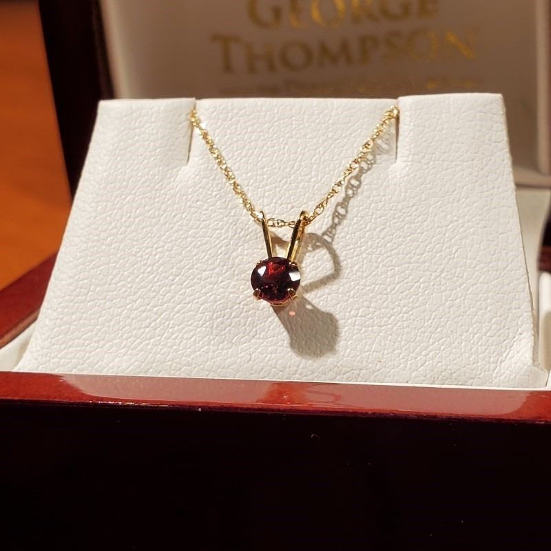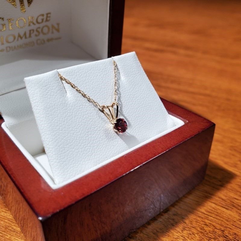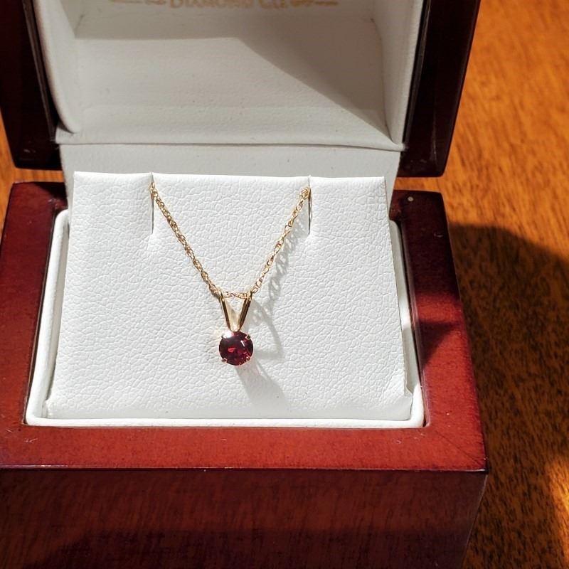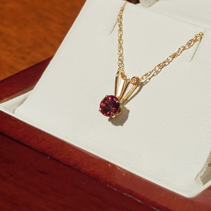 This pendant contains a round cut garnet that has a total weight of approximately .25 ct and has a medium dark orange-brown color. Comes with an 18" 10k gold chain. The pendant with chain weighs .5 grams.