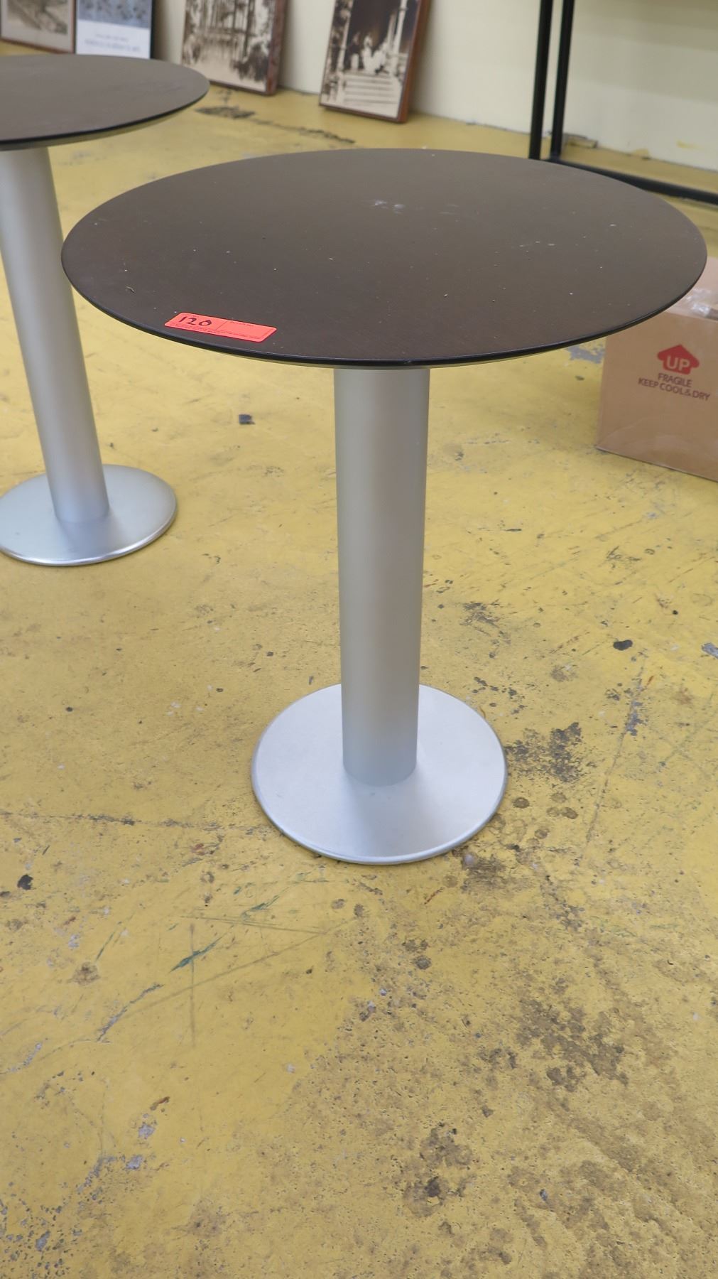 Round Pedestal Side Table - Dark Wood Top, Brushed Aluminum Base, 23.5" Dia., Some Surface Wear