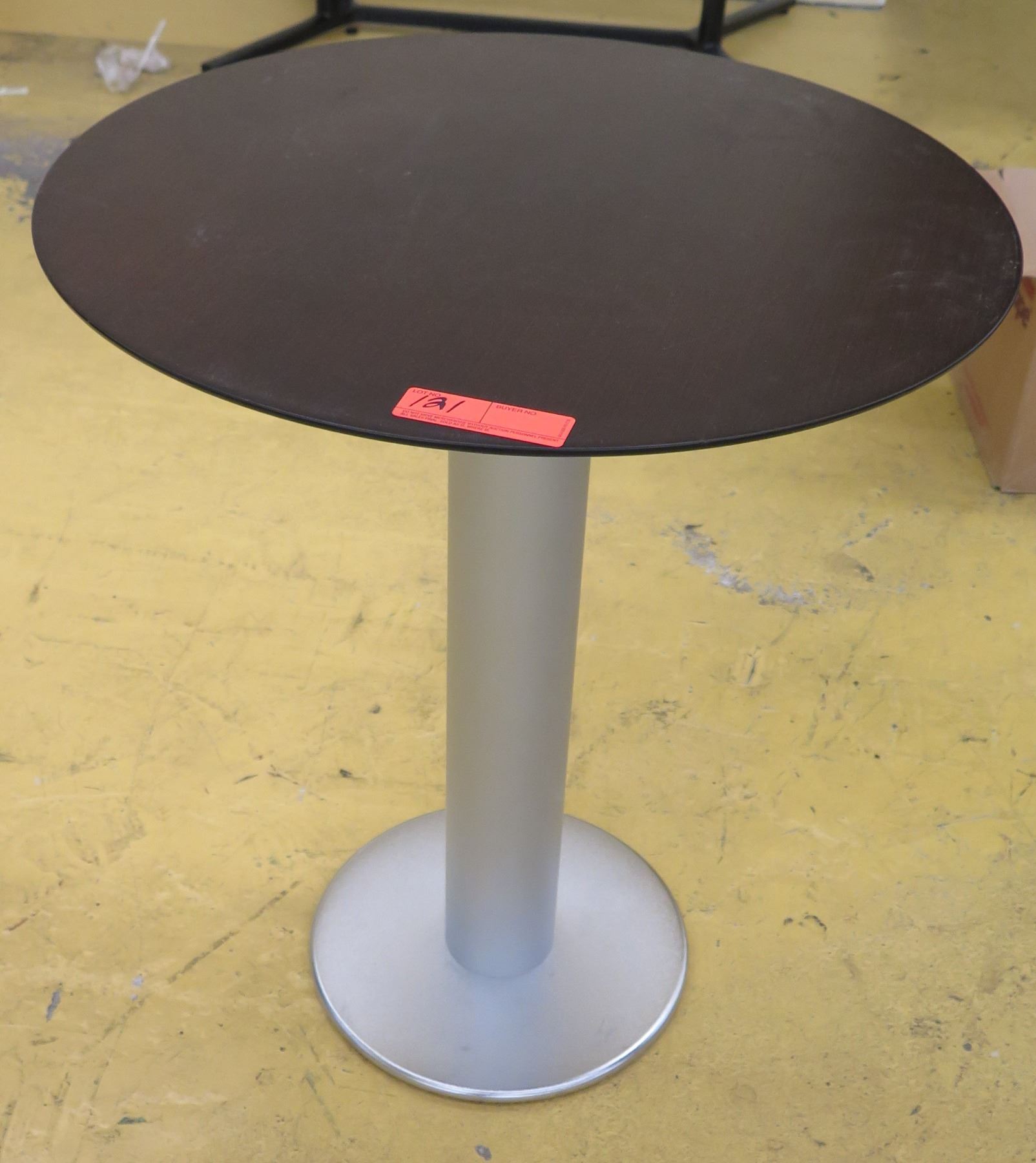 Round Pedestal Side Table - Dark Wood Top, Brushed Aluminum Base, 23.5" Dia., Some Surface Wear
