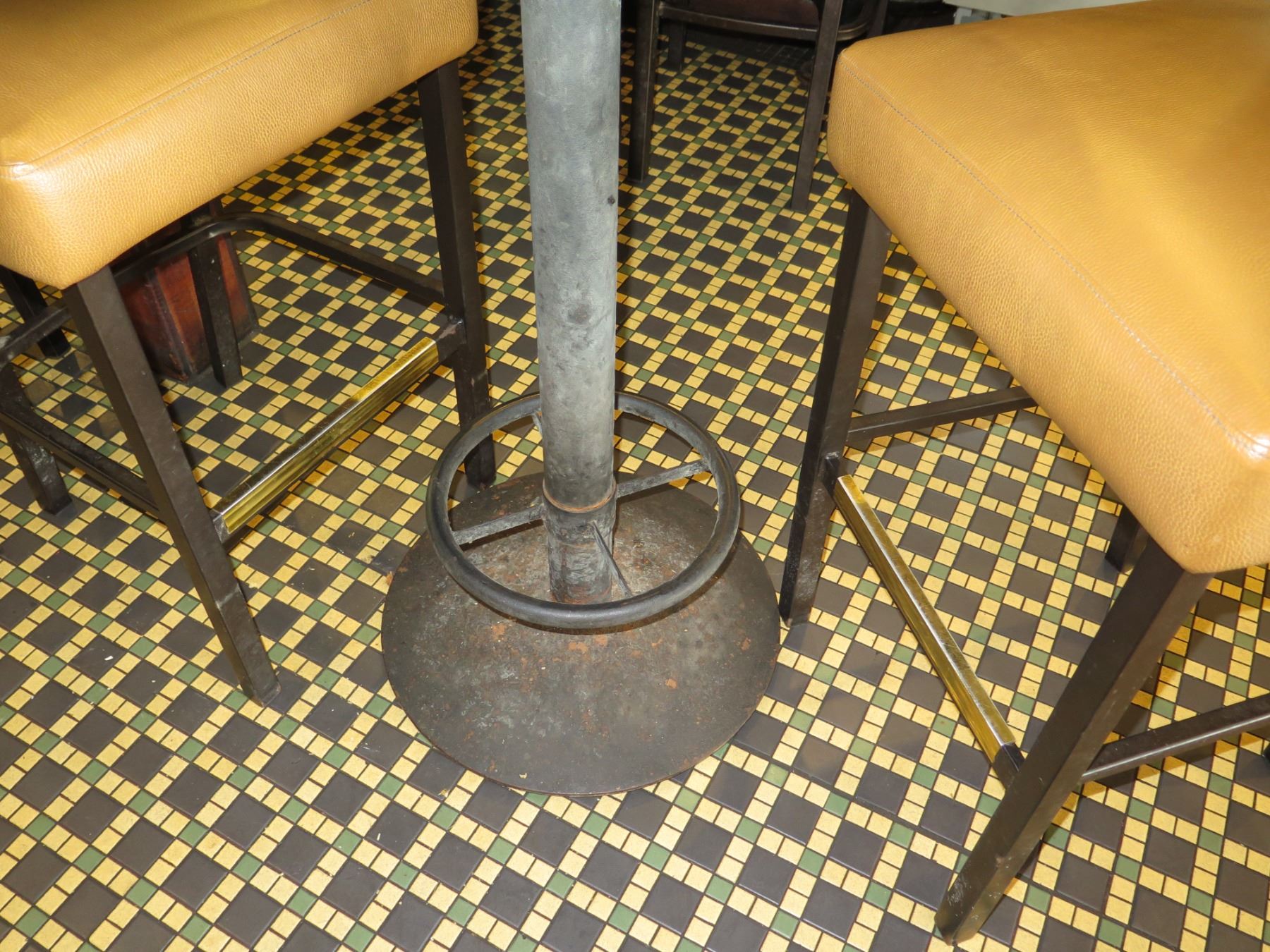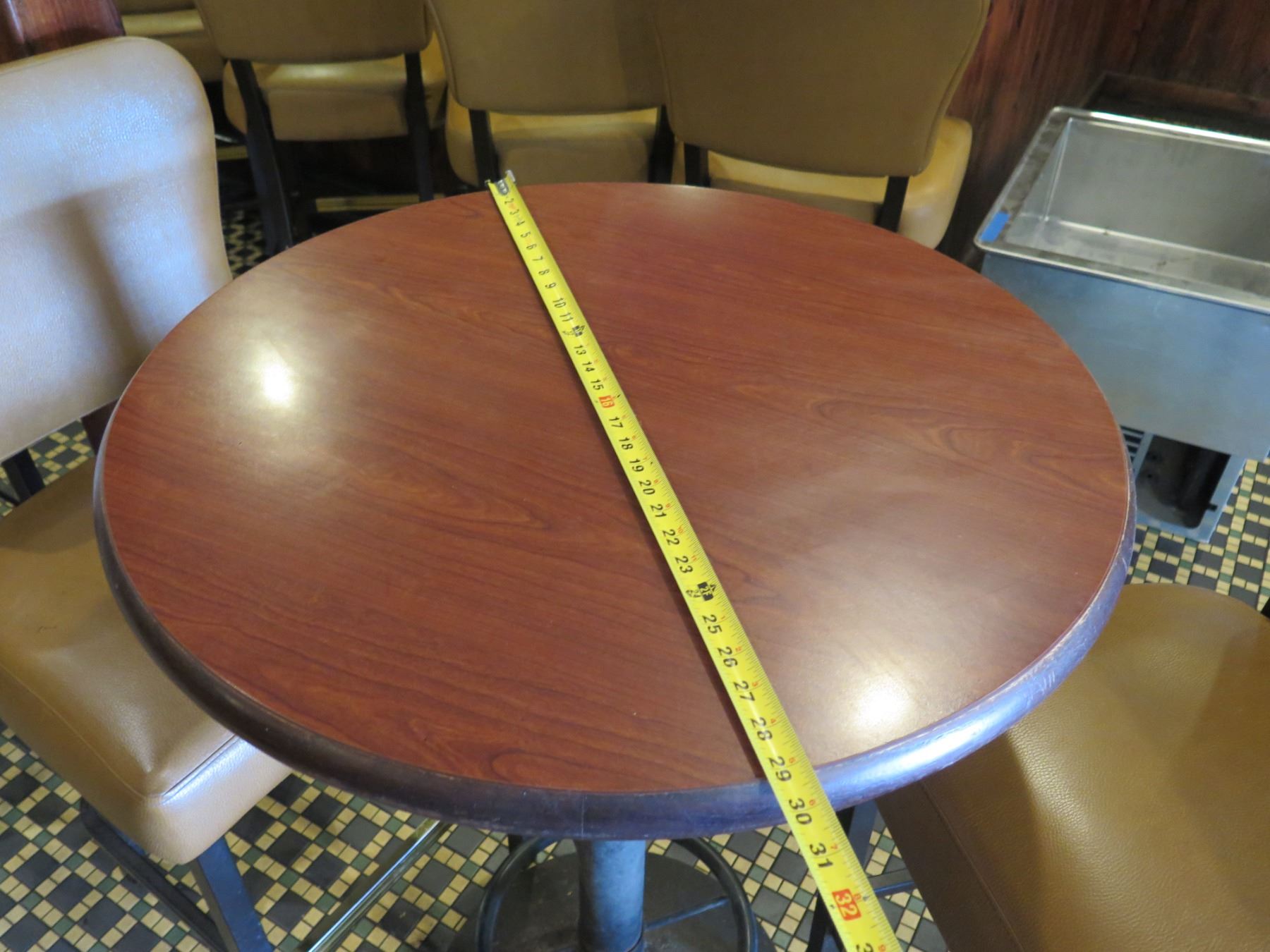 Round Table on Metal Pedestal Base 30" dia, 42"H w/ 2 Chairs 18"x18"x46"H. This is a stock photo, representative of item. Condition may vary.