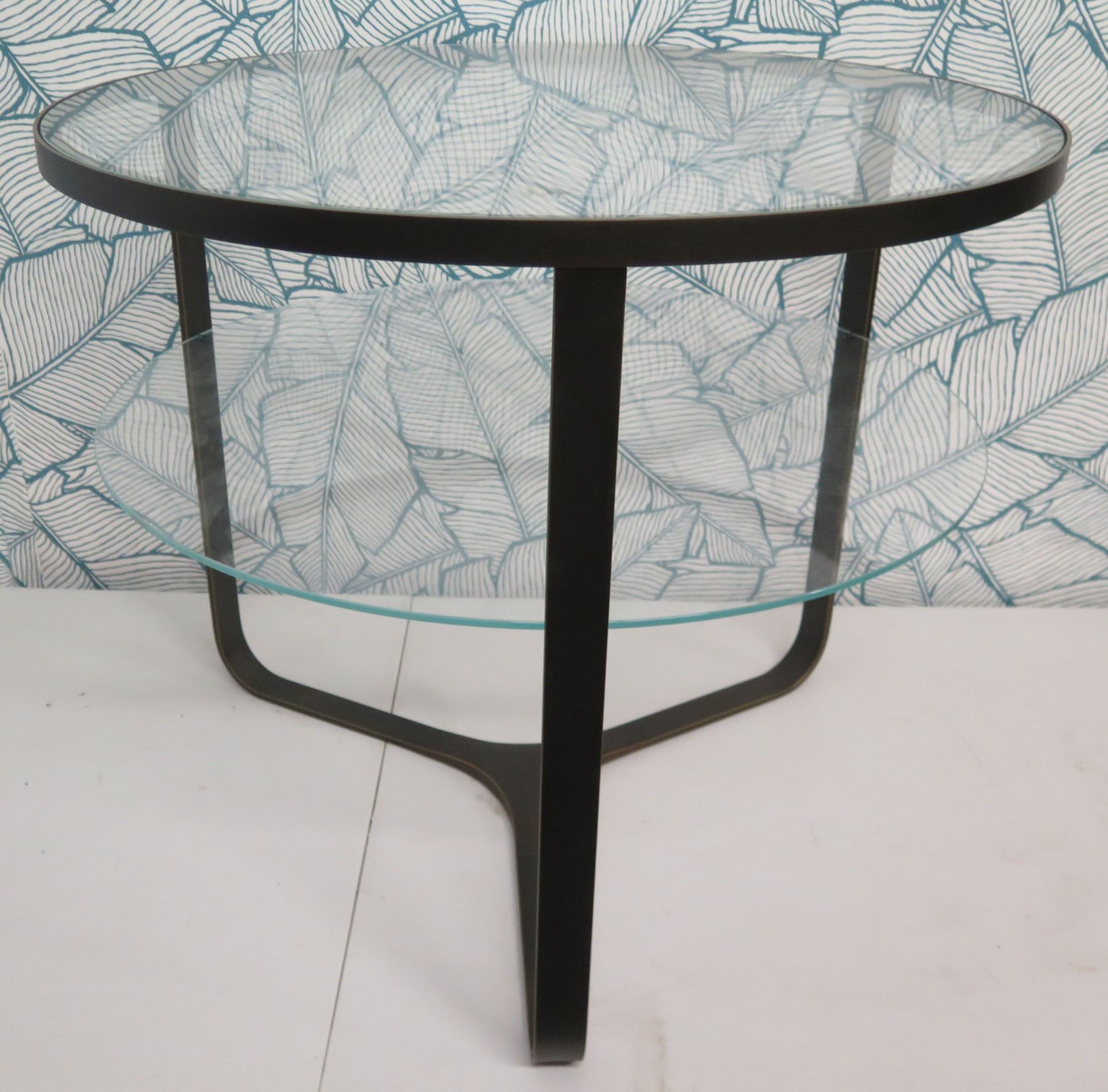 Round Two-Tier Espresso Side Table w/ Glass Top, 30" Dia, 26"H (Bistro Ht). Bottom glass is removable. This is a stock photo, representative of item. Condition may vary.