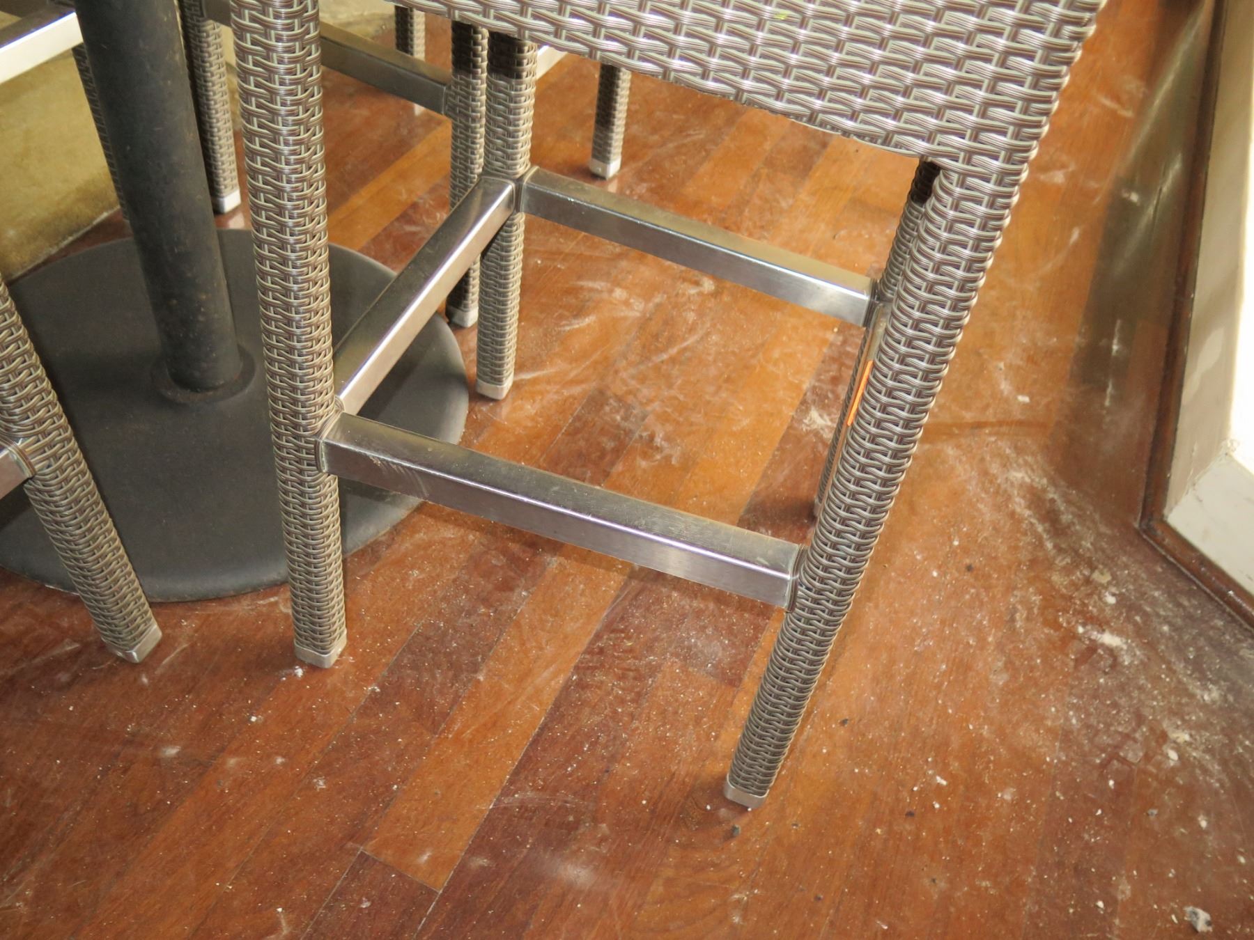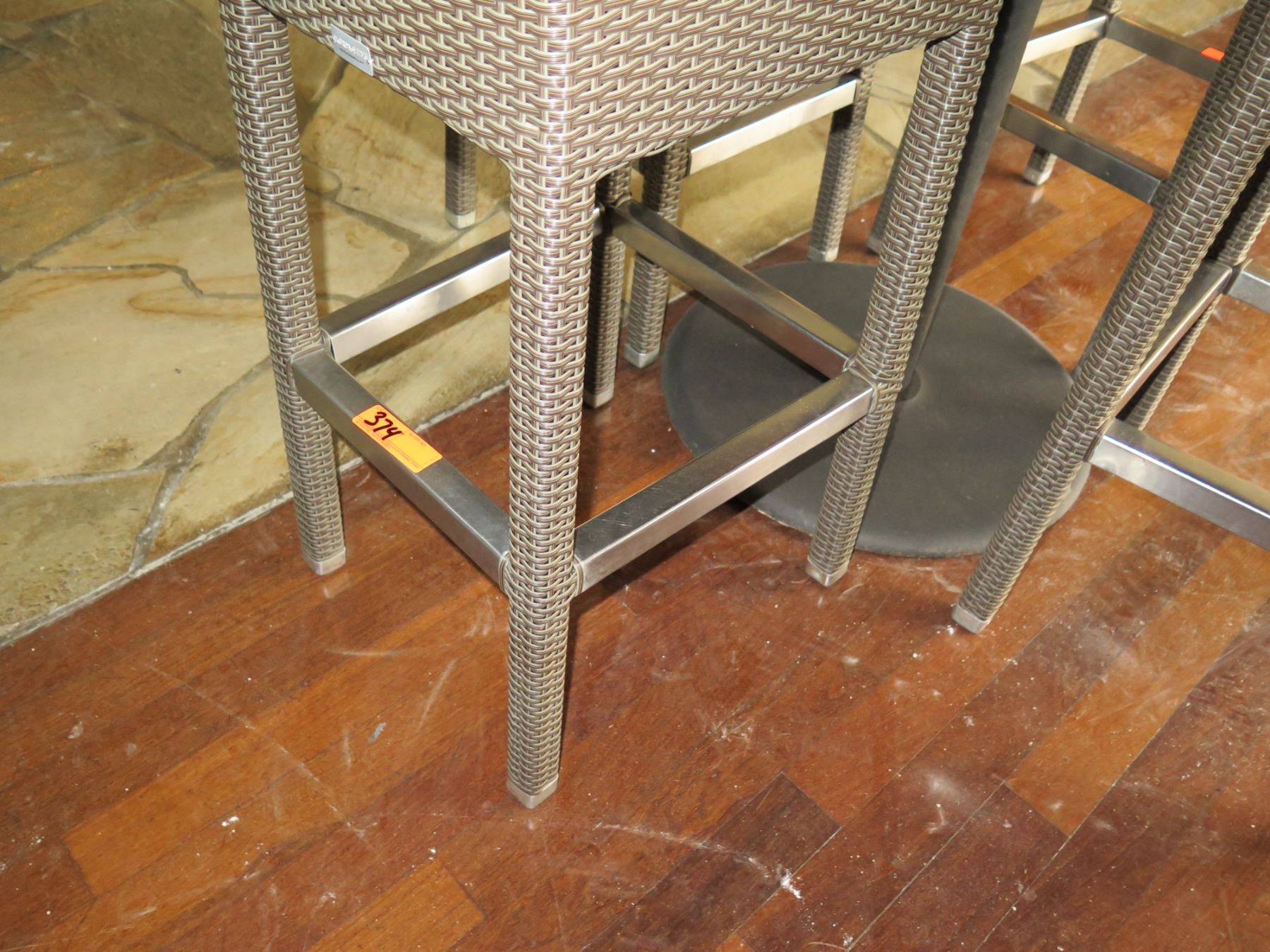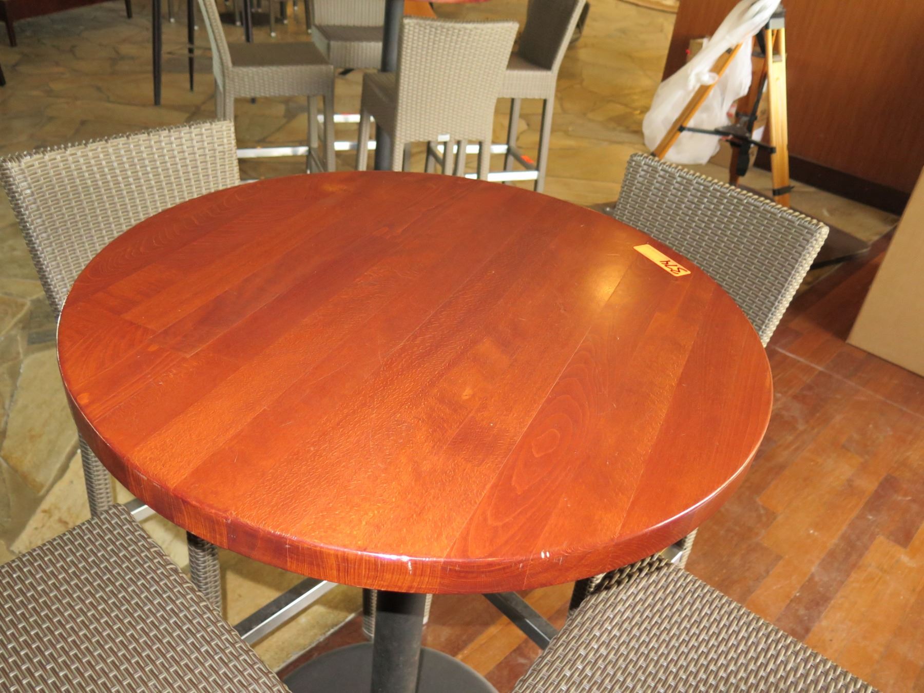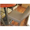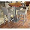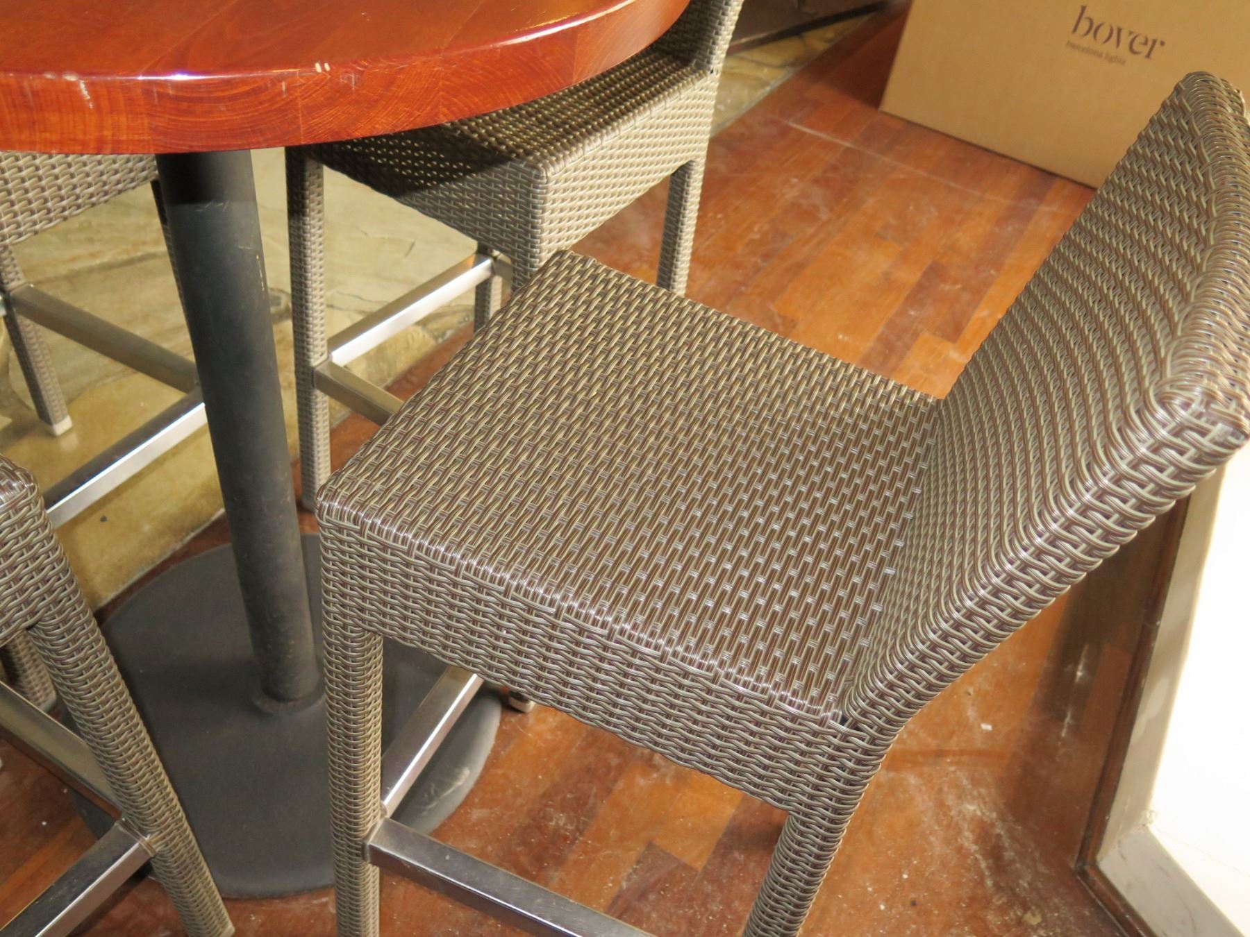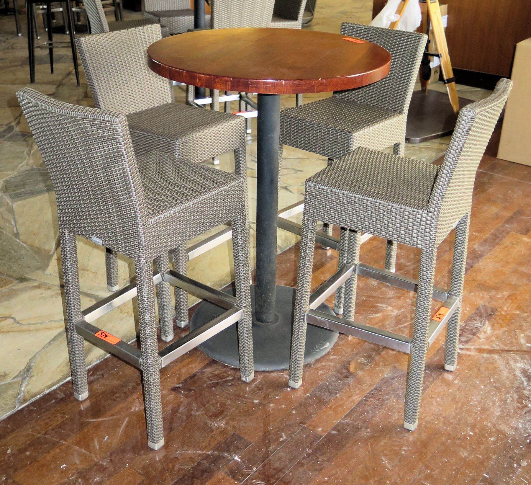 Round Wood Pedestal Table & 4 Gray Woven Synthetic Bar-Height Chairs