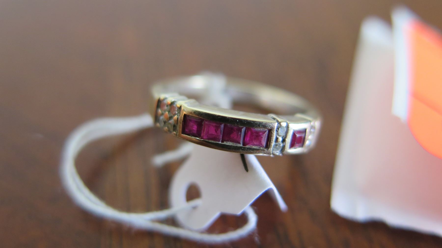 Ruby & Diamond Band Ring, 5 Square Cut Rubies Approx. .20 ct tw., 8 Round Brilliant Cut Diamonds Approx. .12 ct tw, 18K Yellow Gold, 3.1 g. wt, VS Clarity