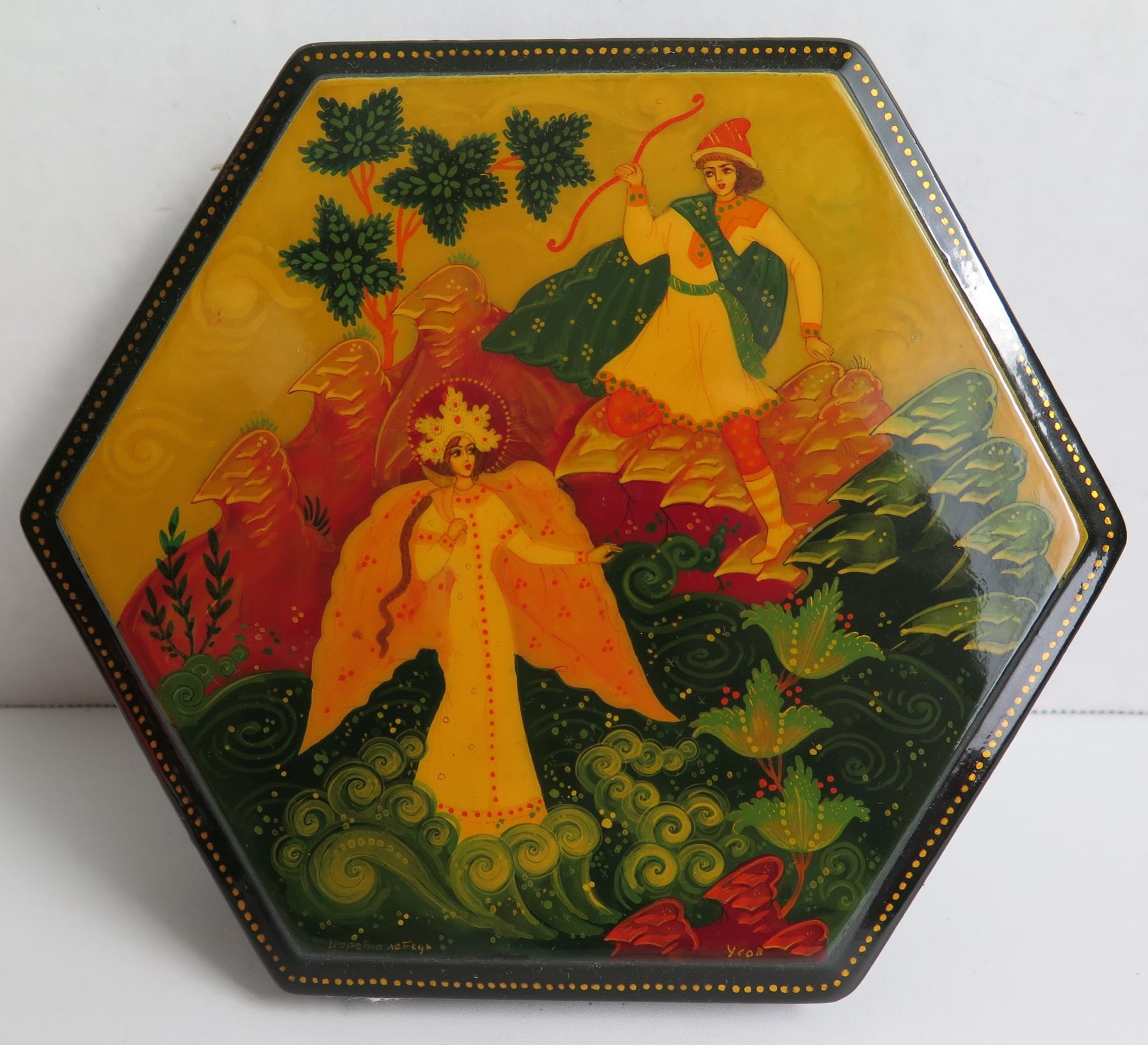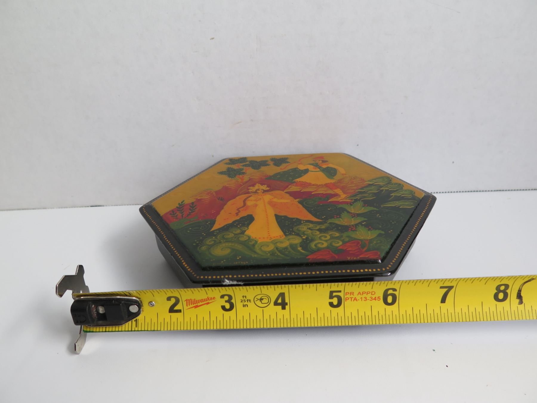 Russian Lacquer Jewelry Box, Hexagonal Hand Painted Signed 6" W