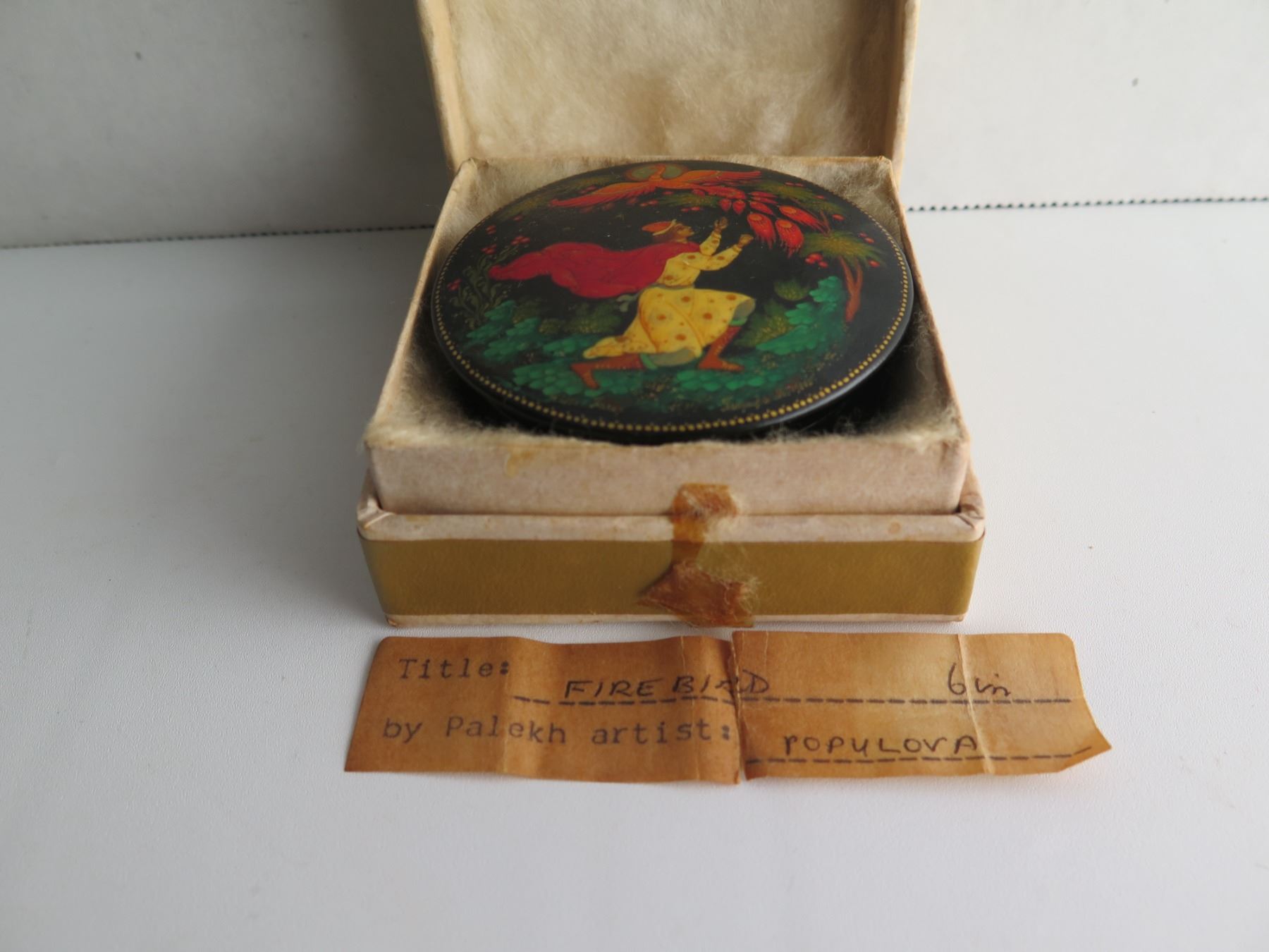 Russian Lacquered Trinket Box, Round Hand Painted Signed 3" Dia