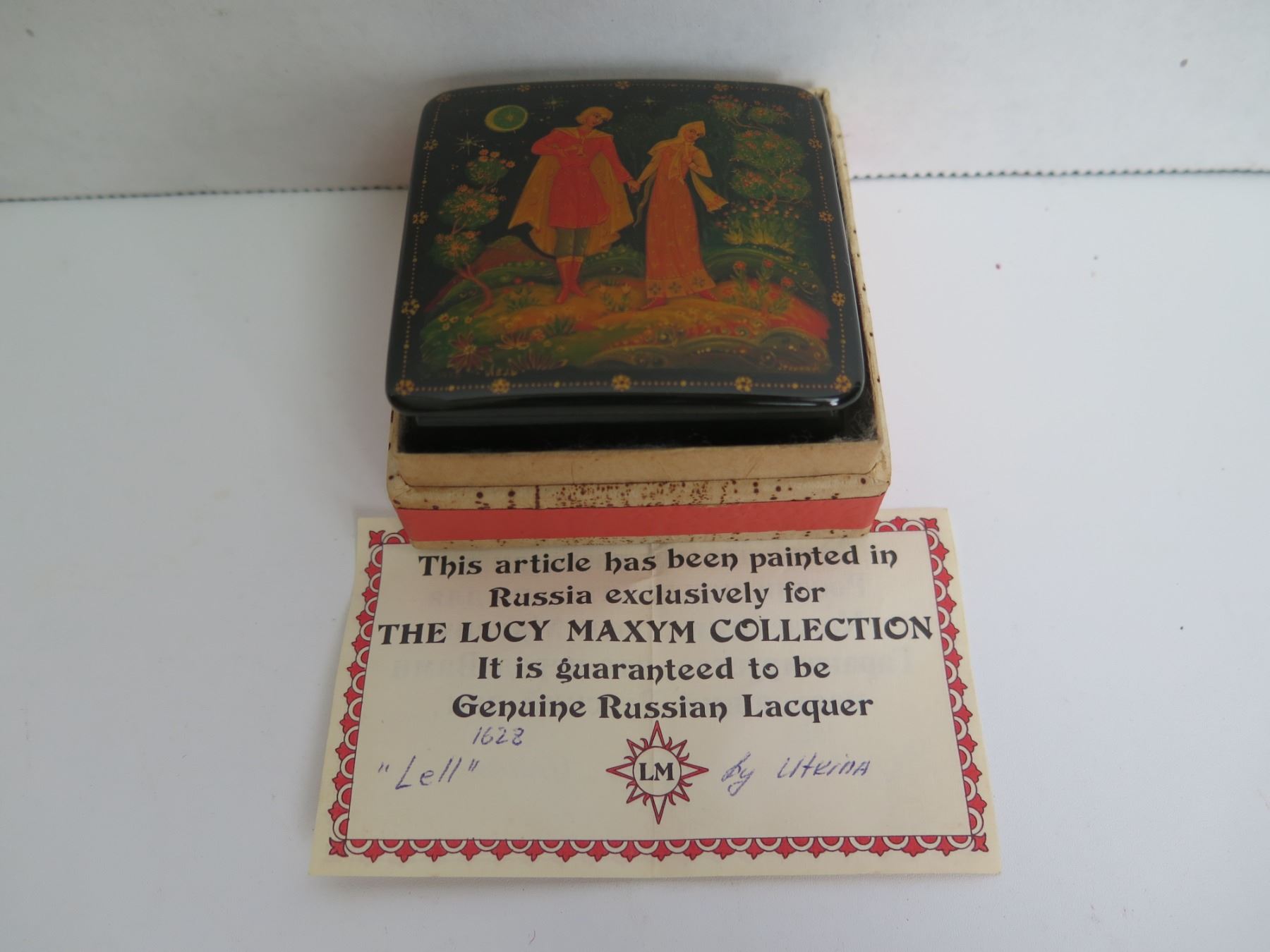 Russian Lacquered Trinket Box, Square Hand Painted w/Authentication, 2.5"x 2.5"