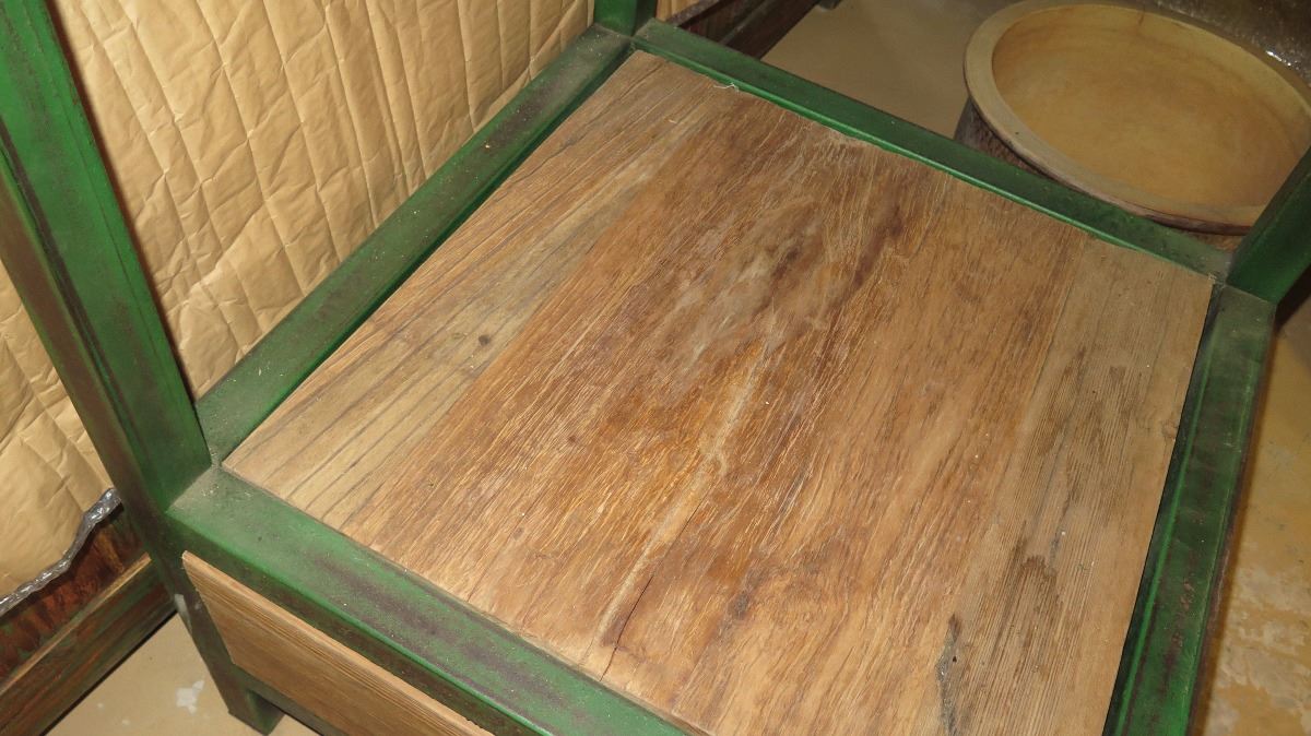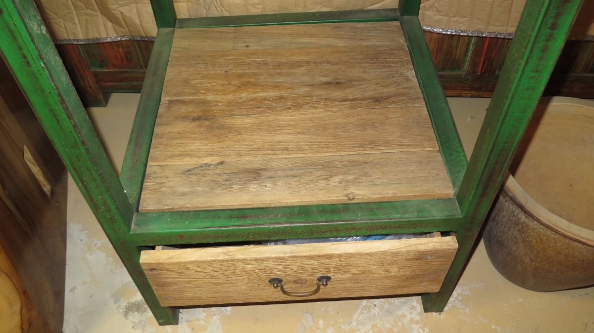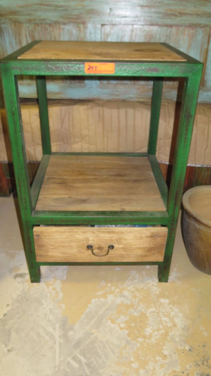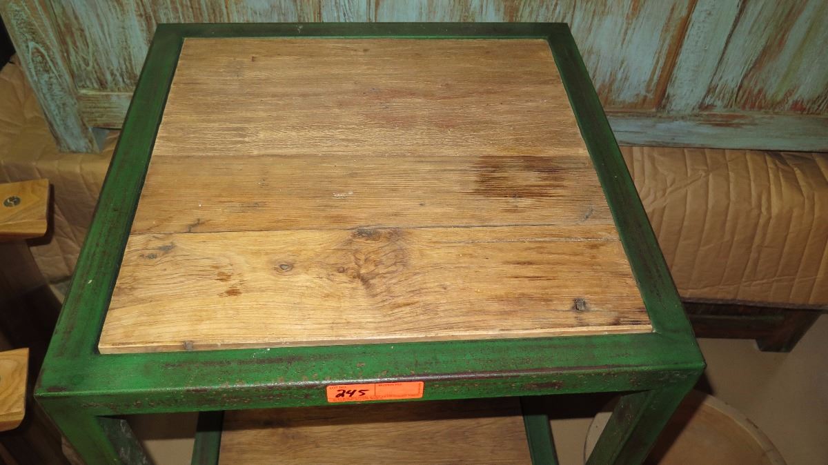 Rustic Wood Side Table - Natural Wood, Green Cast Metal Frame 23.5" X 24" X 35.5" H