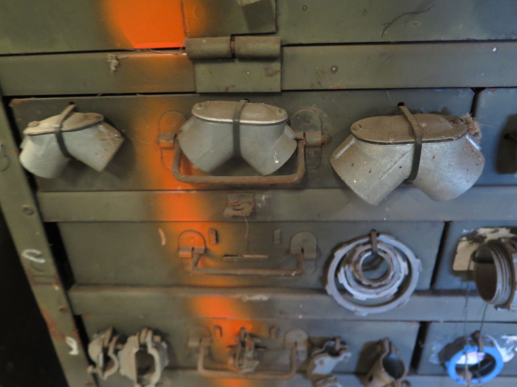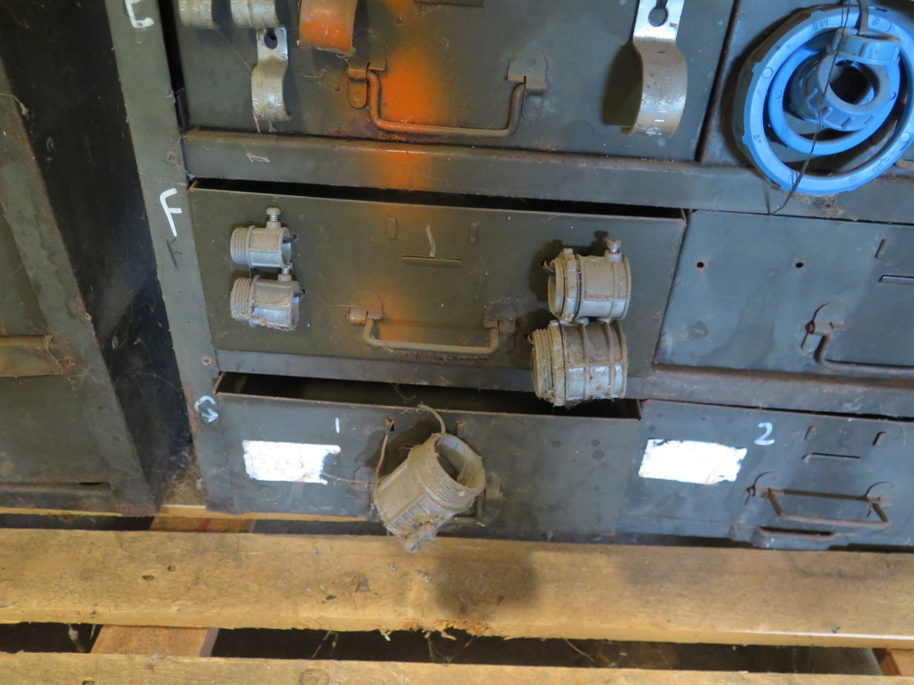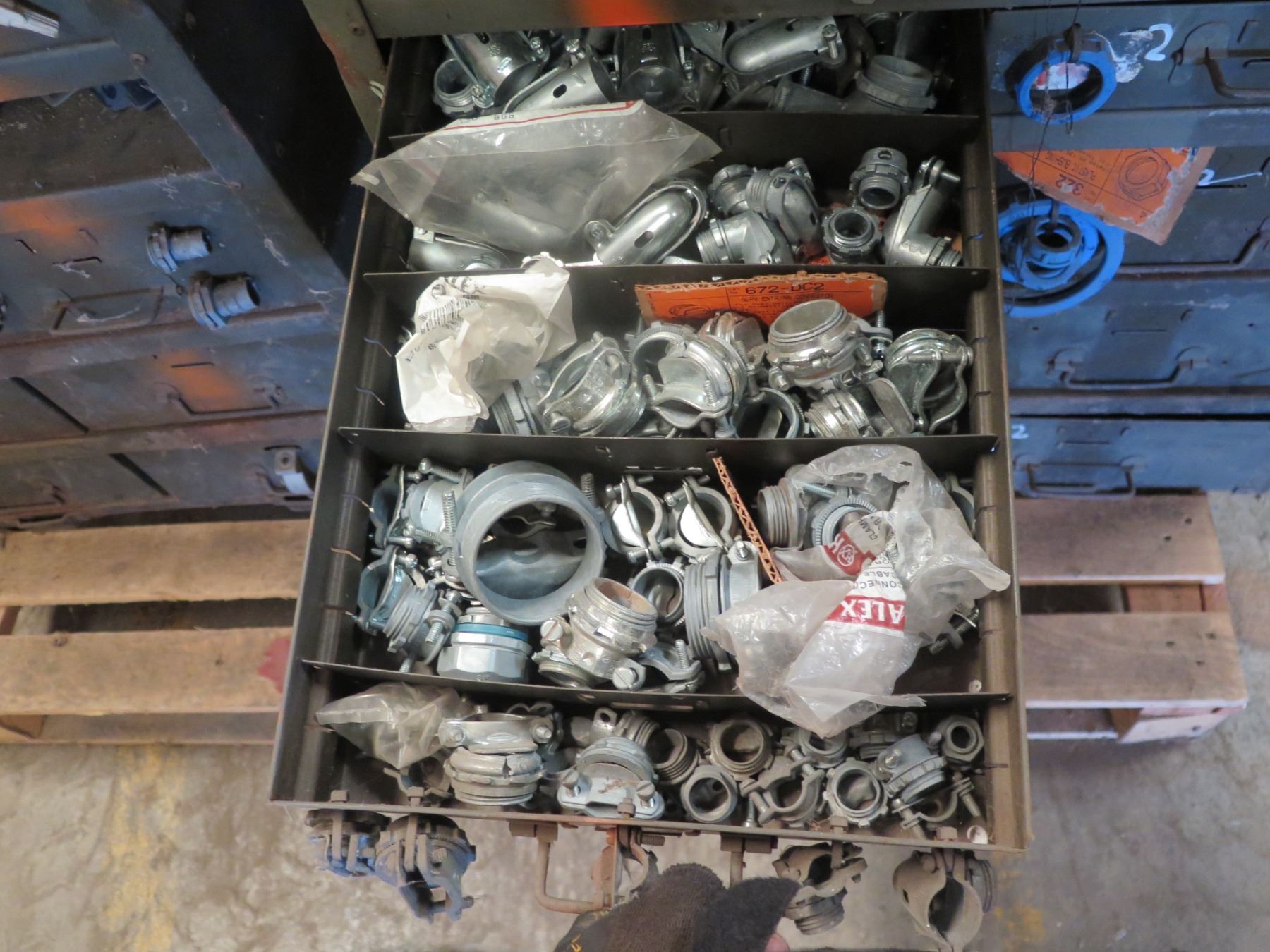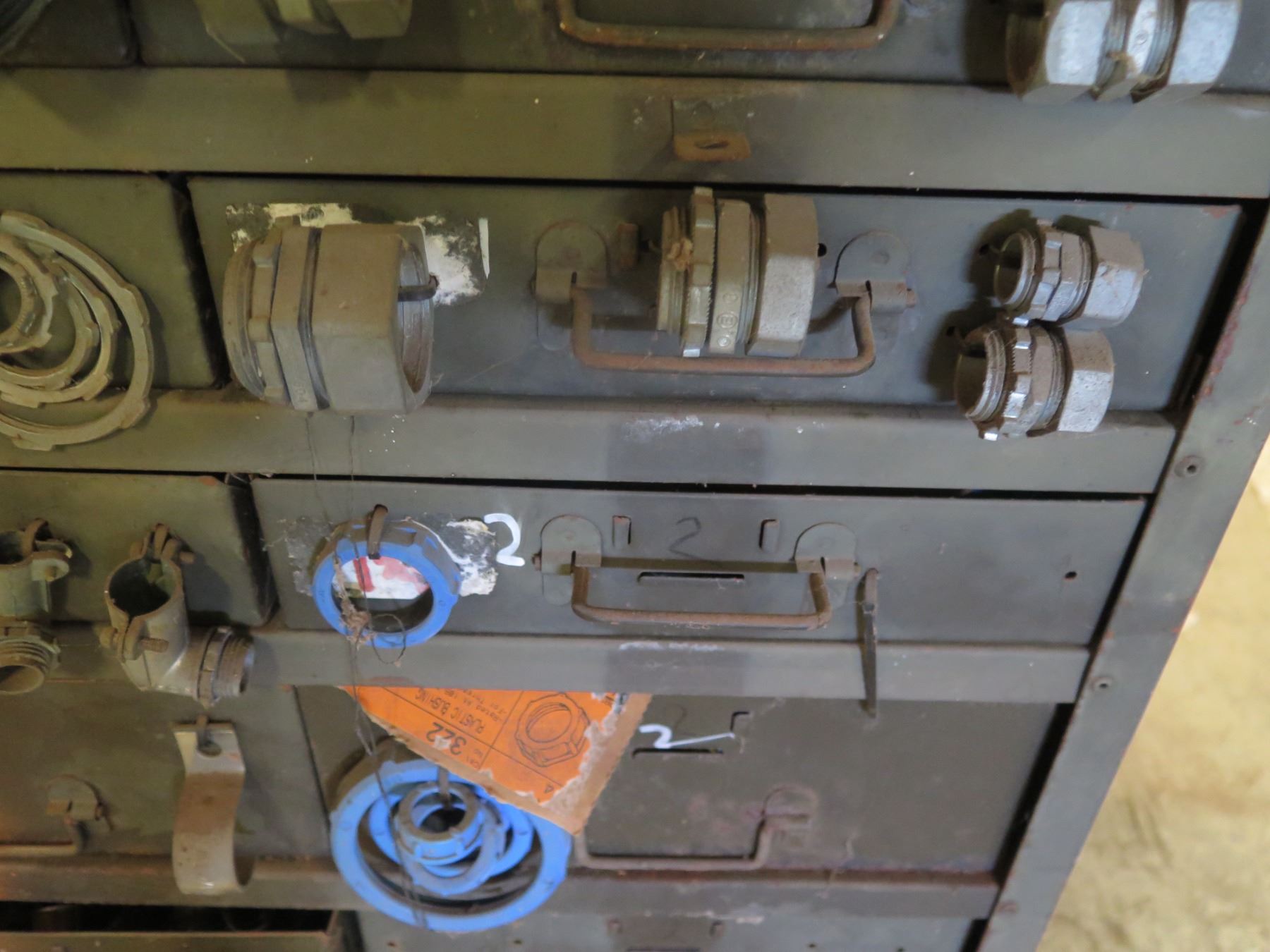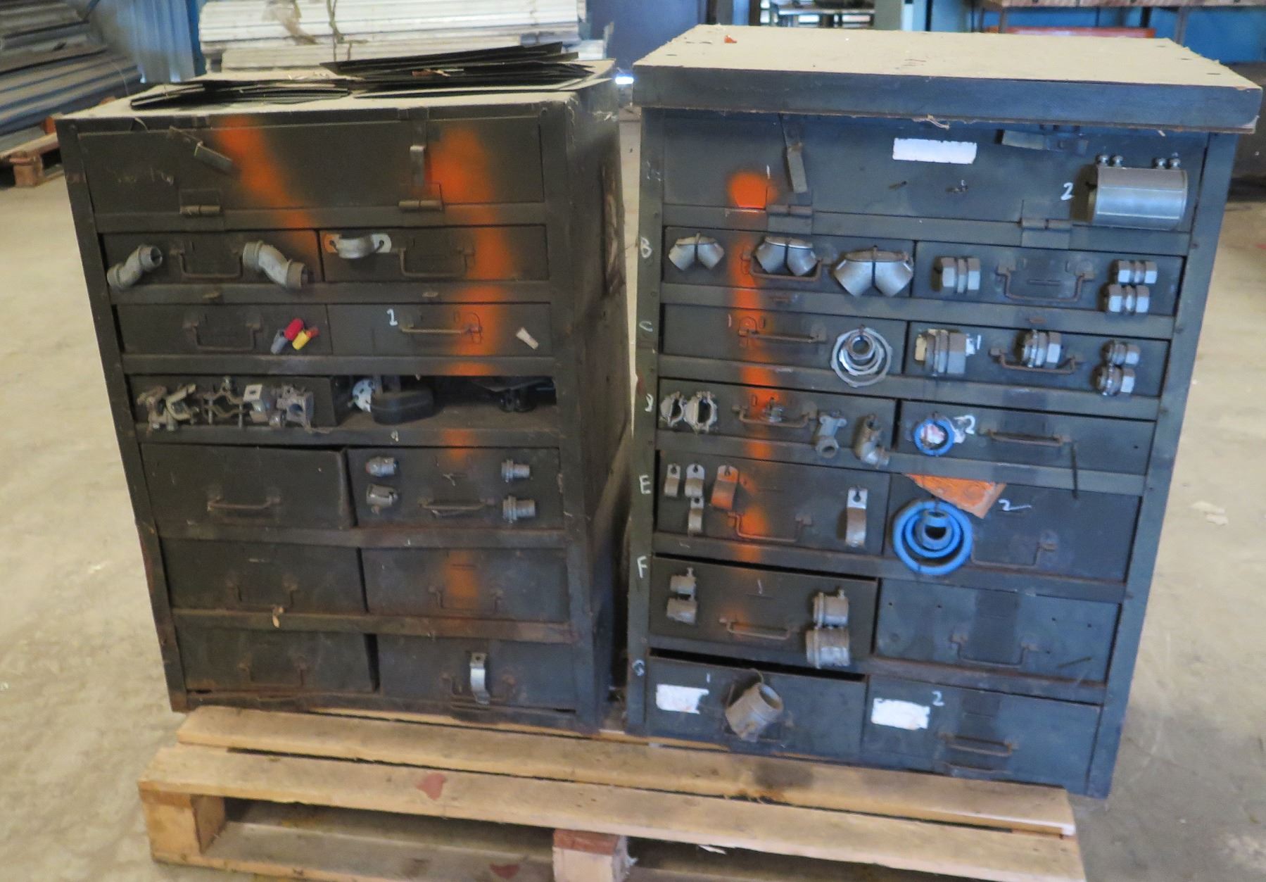 Qty 2 Metal Cabinets w/ Contents: Pipe Fittings, Elbows, Clamps, Hardware, etc