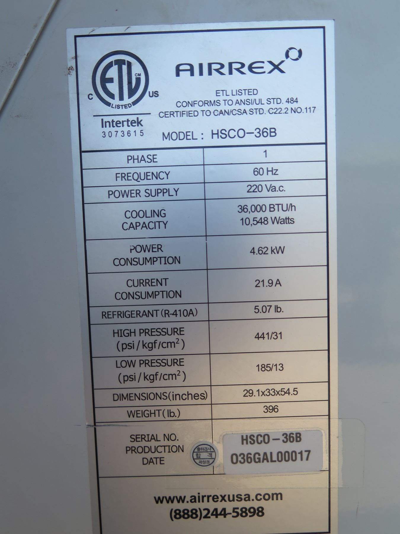 AIRREX HSCO-36B Portable Air Conditioner/Dehumidifier 230V 1PH