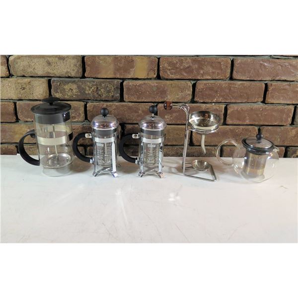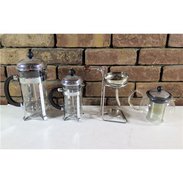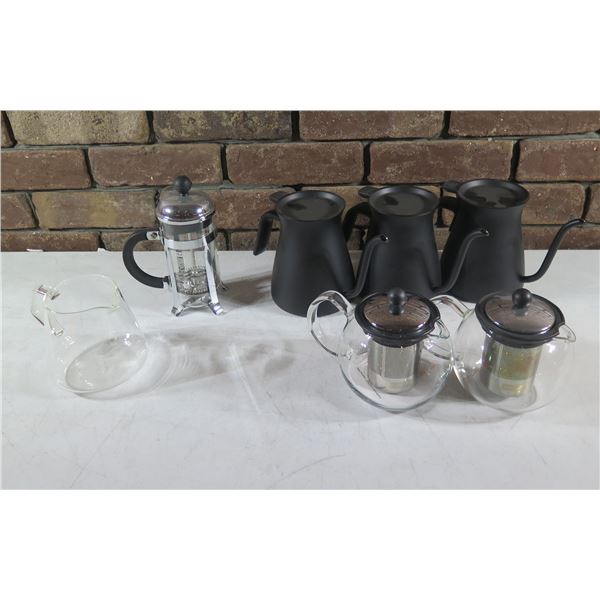 Qty 3 Kinto Pour Over Kettles, Bodum Beverage Server, Coffee Press, Teapot Infusers, etc