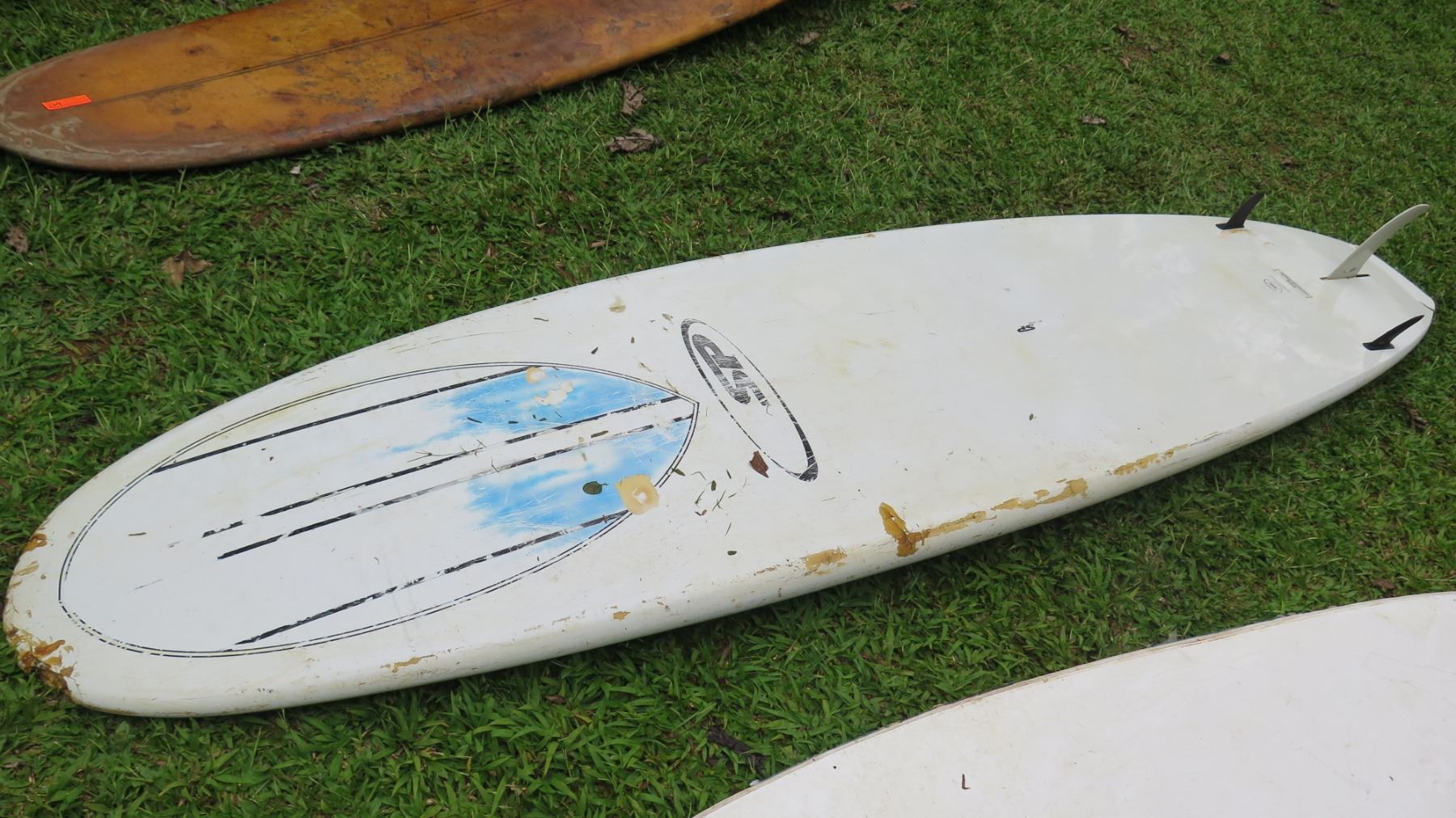 SP White Blue Stand Up Paddle Board SP with 3 fins.