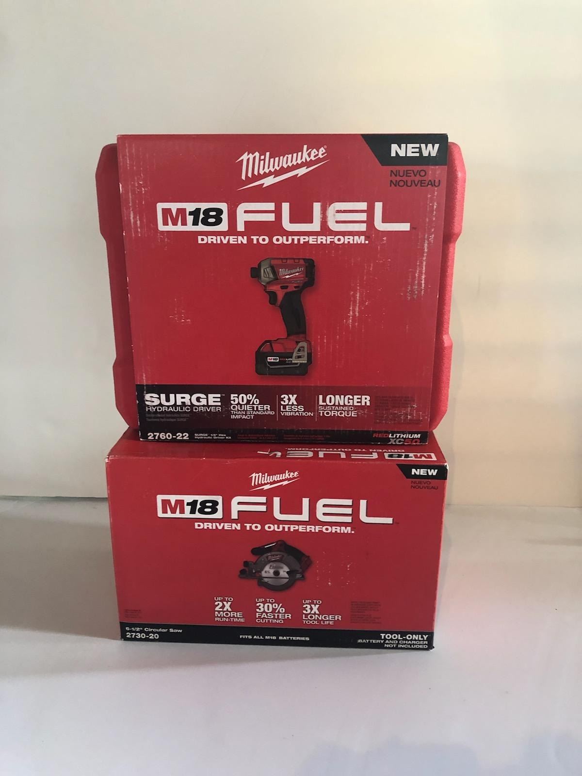 Surge 1/4" Hex Impact Driver Kit includes (2) batteries and a charger; Milwaukee M18 Fuel 6-1/2" Circular Saw (tool only battery not included) New. Donated By: Ferguson Enterprises
