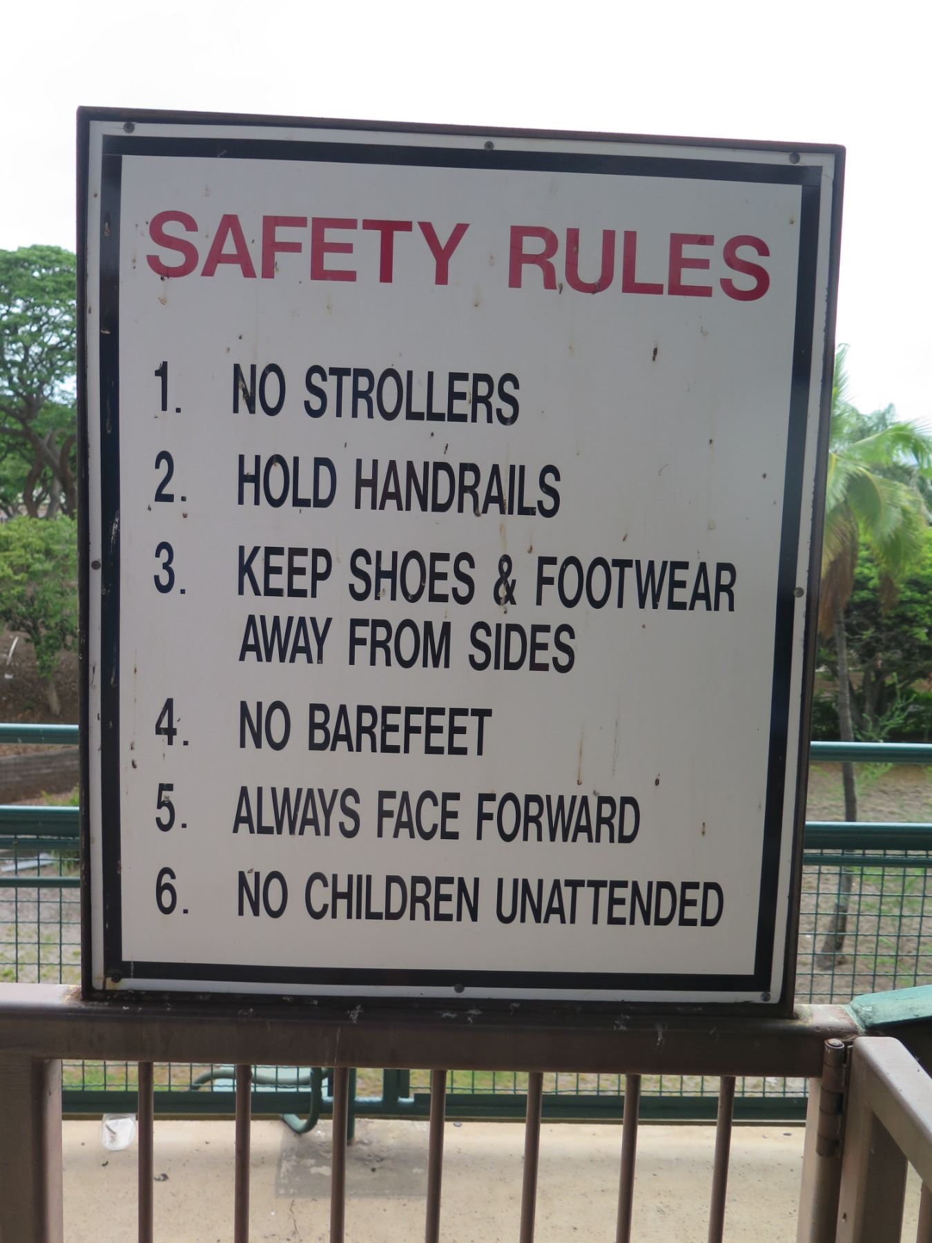 Safety Rules Sign: No Strollers, Hold Handrails, etc 30"x35". Note: Signs will be removed if hanging prior to pick up