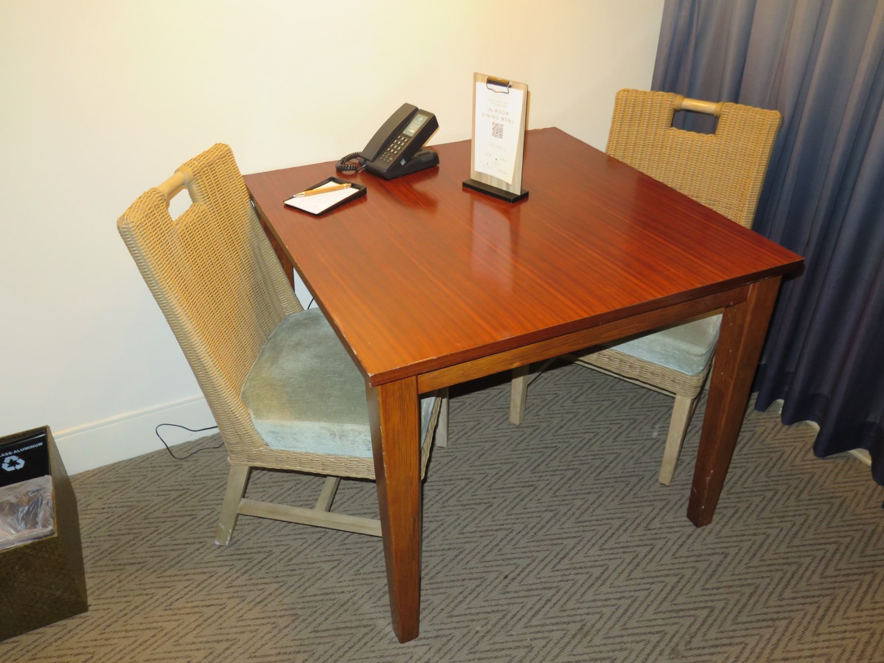 Samuelson Wooden Table w/ 2 Woven Rattan & Wood Upholstered Chairs