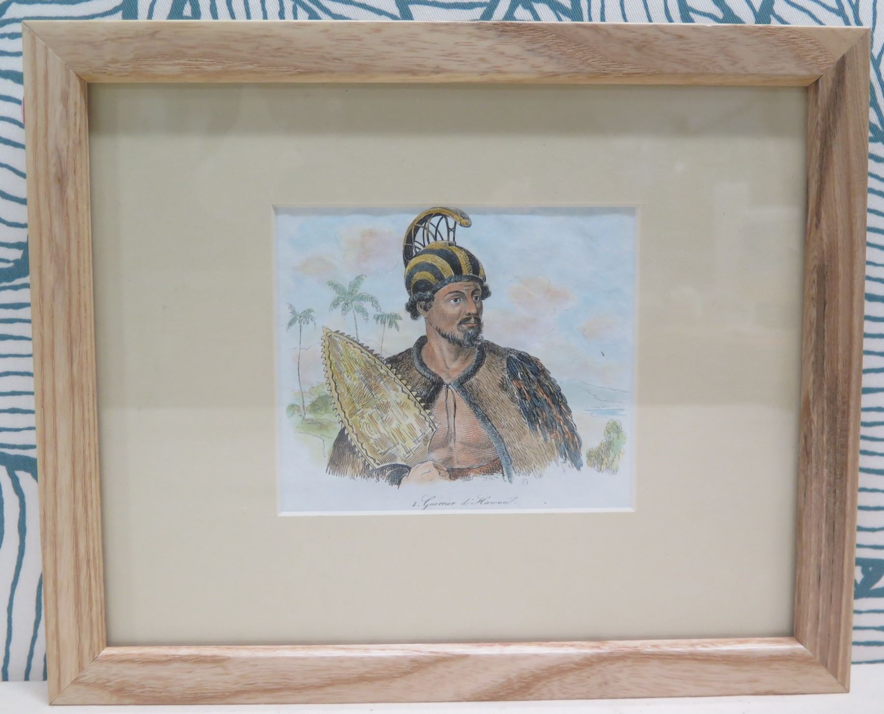 Sandwich Island Man w/ Shark Tooth Weapon 1841 Engraving, Hand Colored, Framed, 11"x9.5"