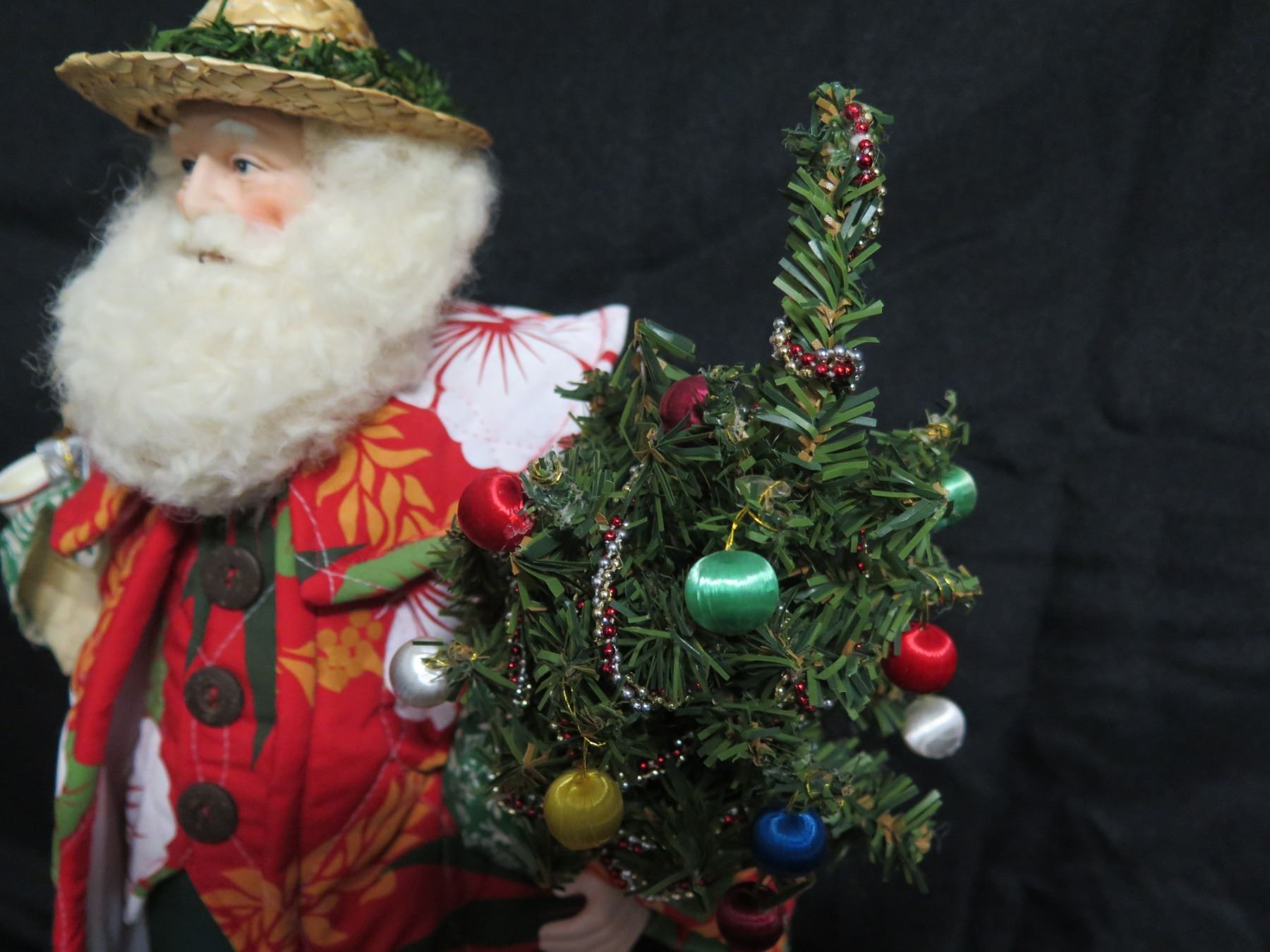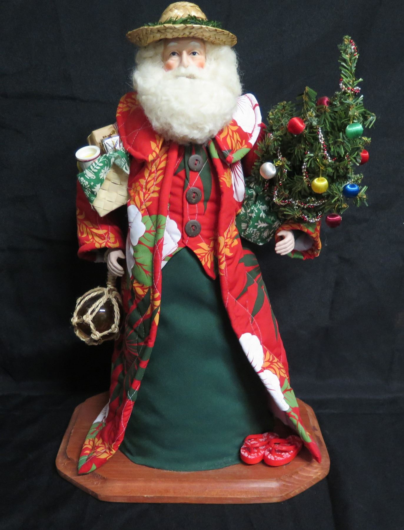Santa in Straw Hat Carrying Tree & Presents Signed Joan Blankenfeld 2010 Hawaii 18"H