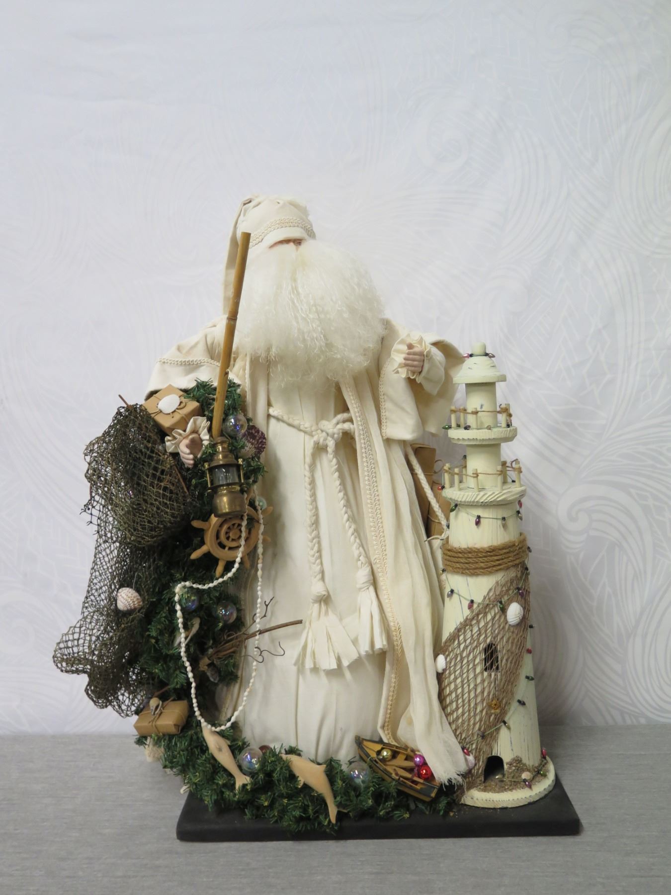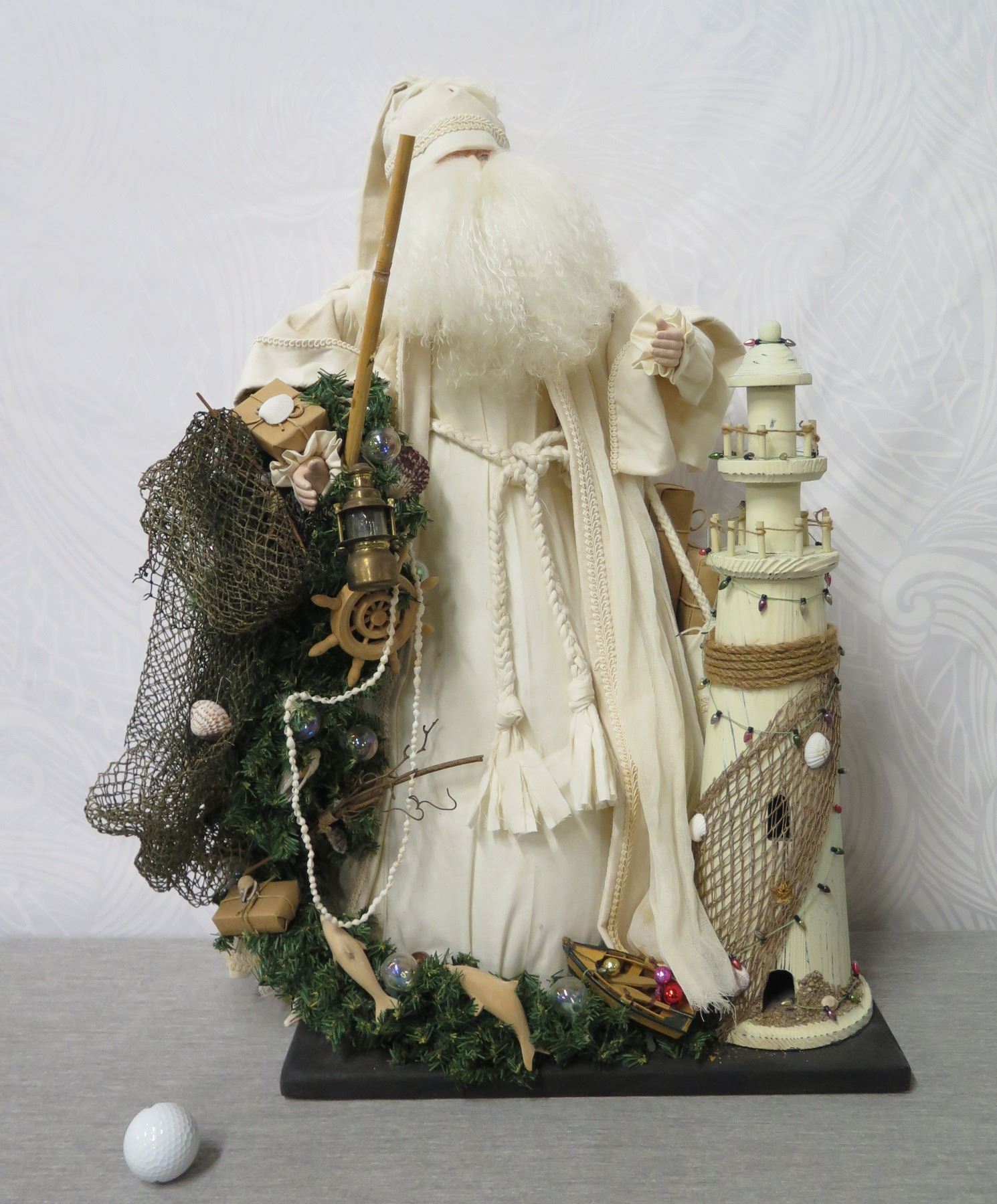 Santa in White Coat w/ Lighthouse & Fishing Net 27" Tall