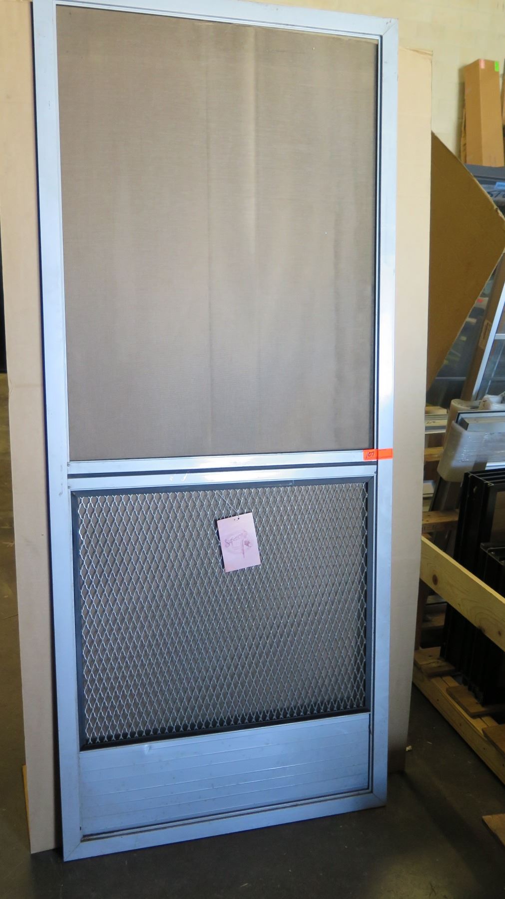 Hinged screen door / clear anodized finish / charcoal fiberglass insect screening 35-1/8" x 83-1/4". Has dent towards the bottom.