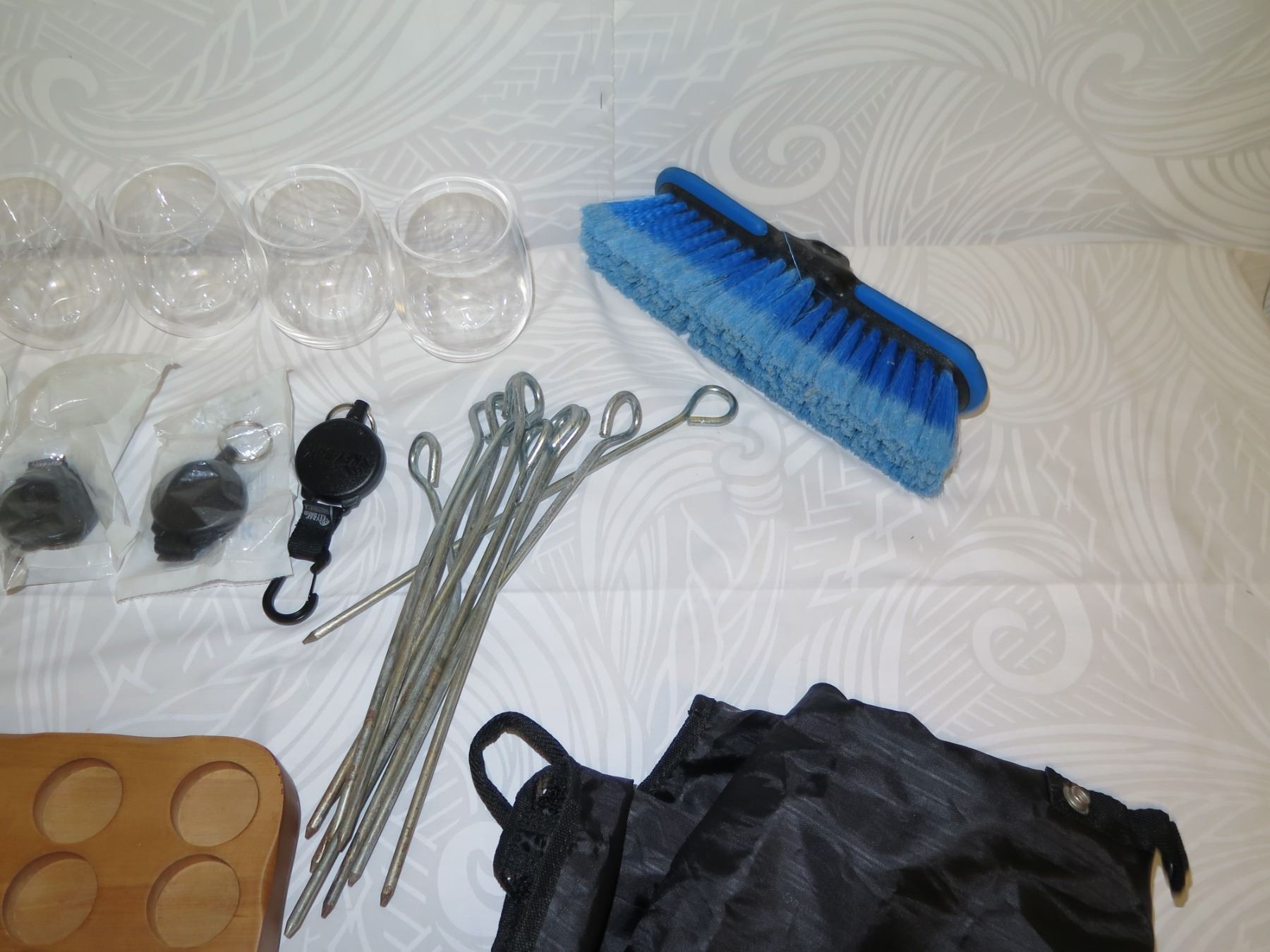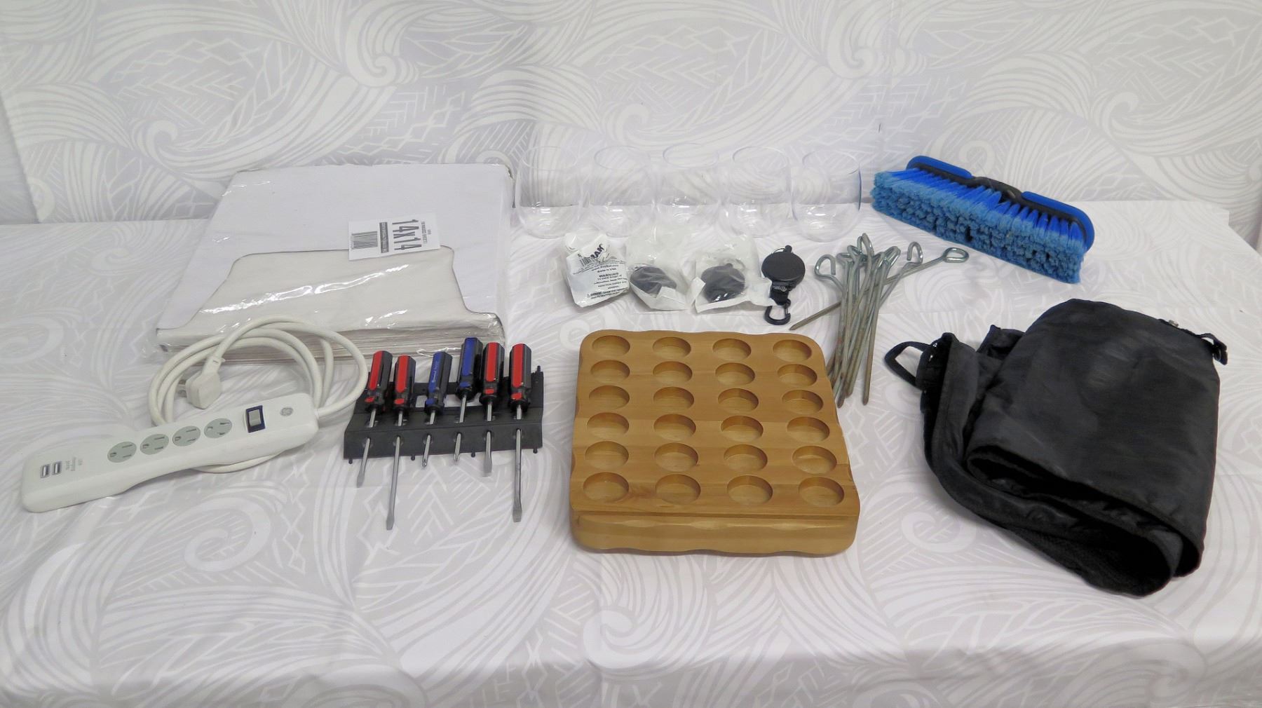 Screwdriver Set, Surge Protector, Wax Sheets, Glassware, Brush, Tent Spikes, etc