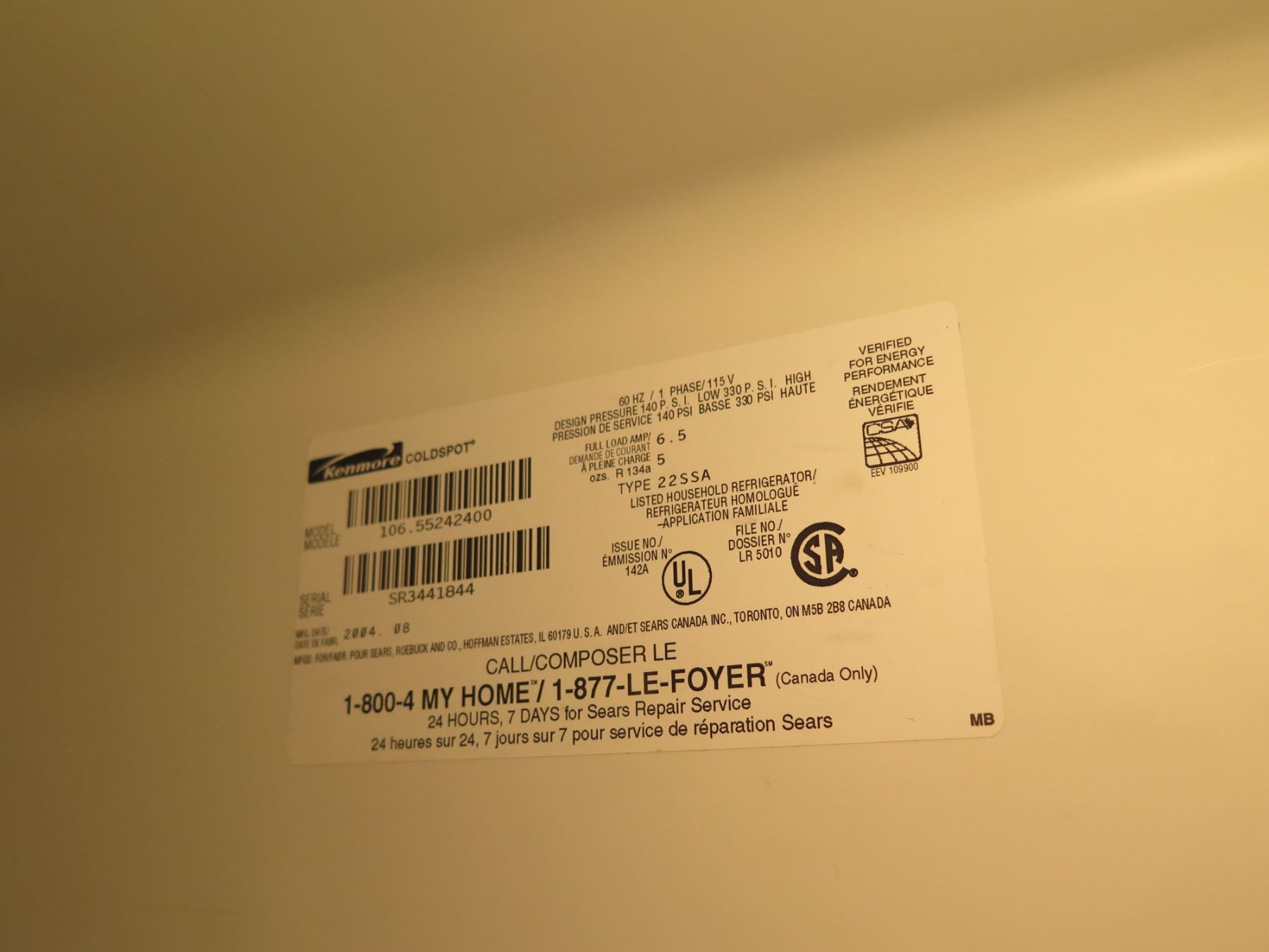 Sears Kenmore Coldspot 106.55242400 Side by Side Refrigerator Freezer w/ Ice Maker