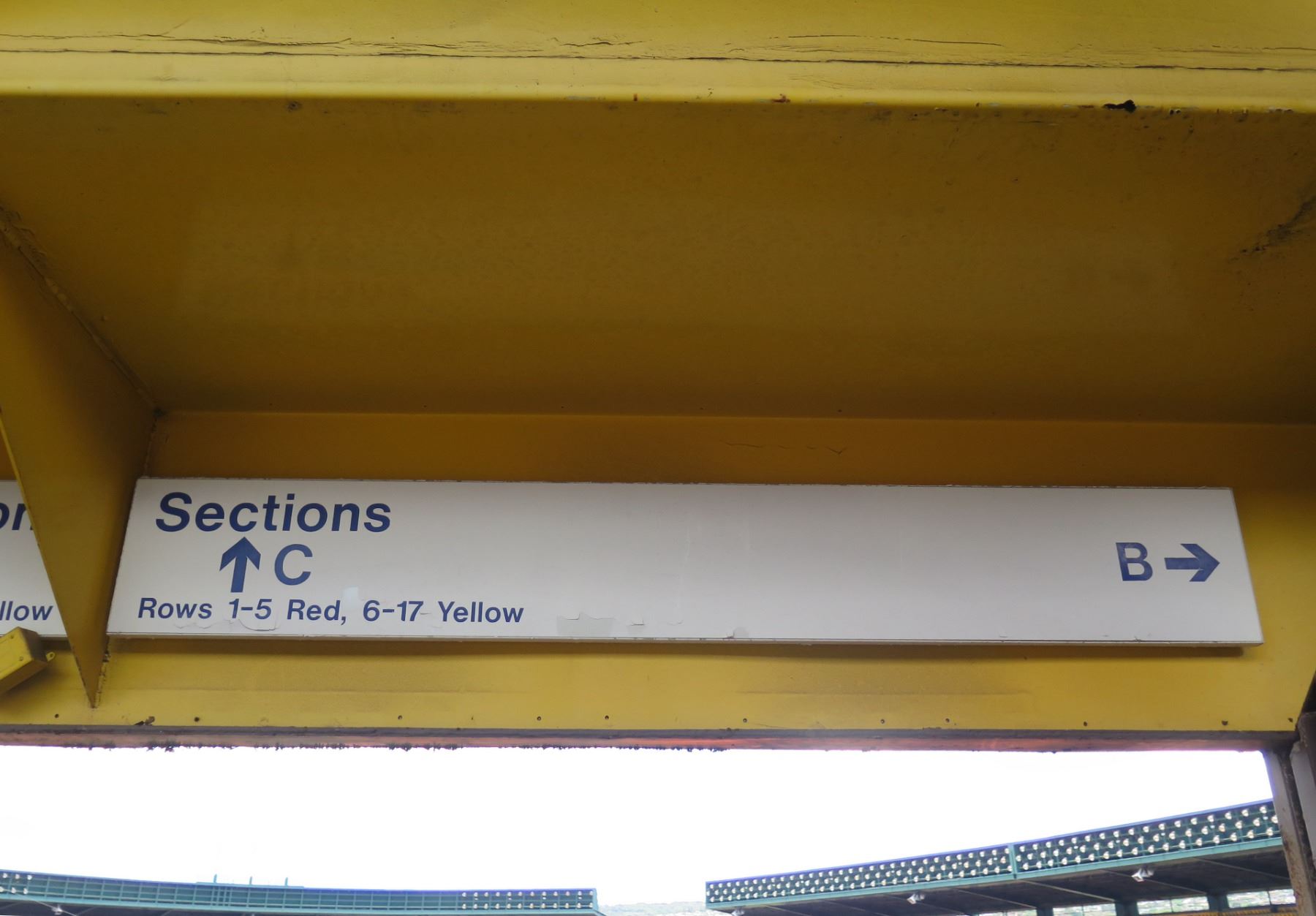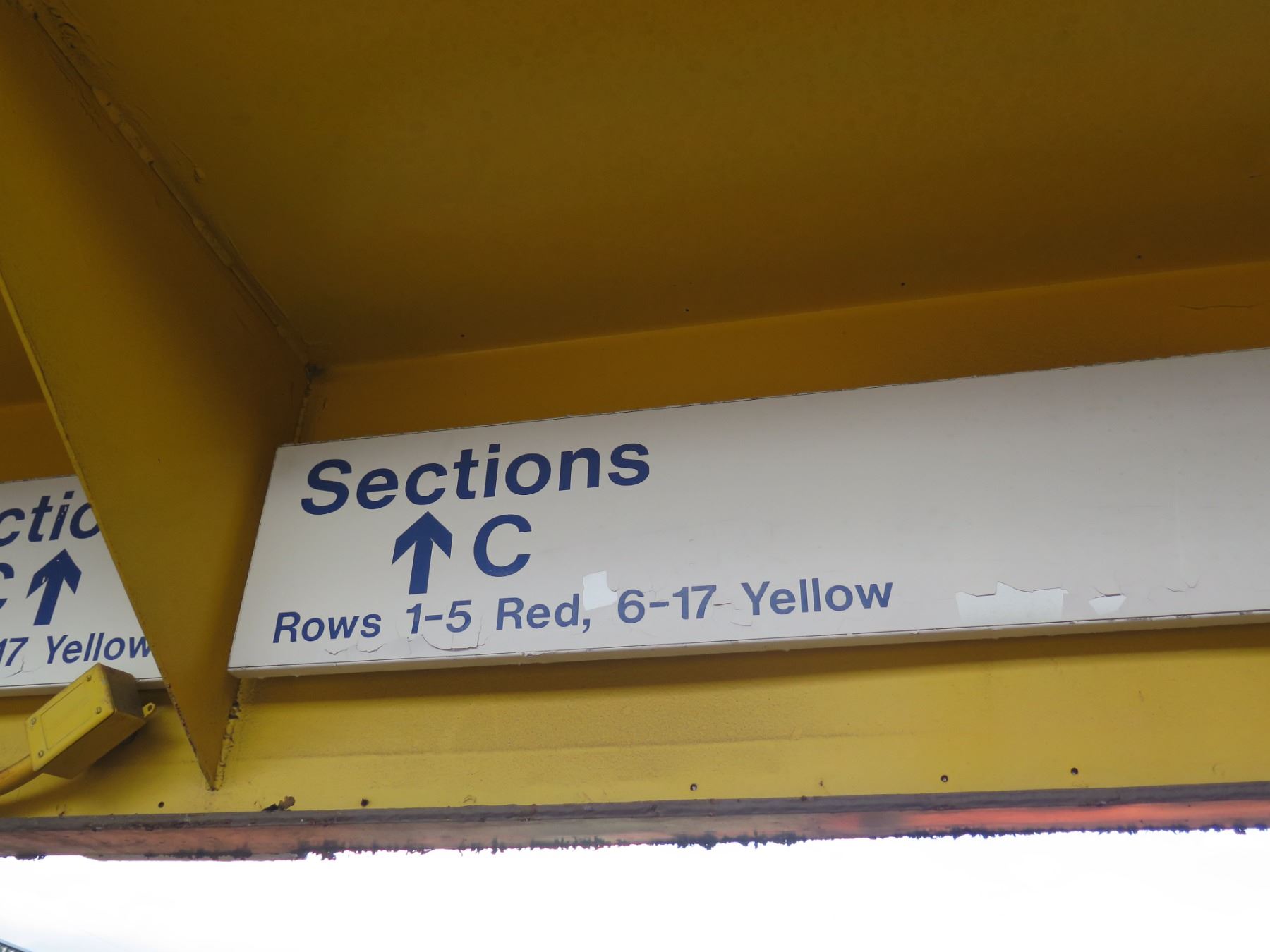 Section Sign C & B w/ Arrows, Rows 1-5 Red, 6-17 Yellow, 85"x12". Note: Signs will be removed if hanging prior to pick up