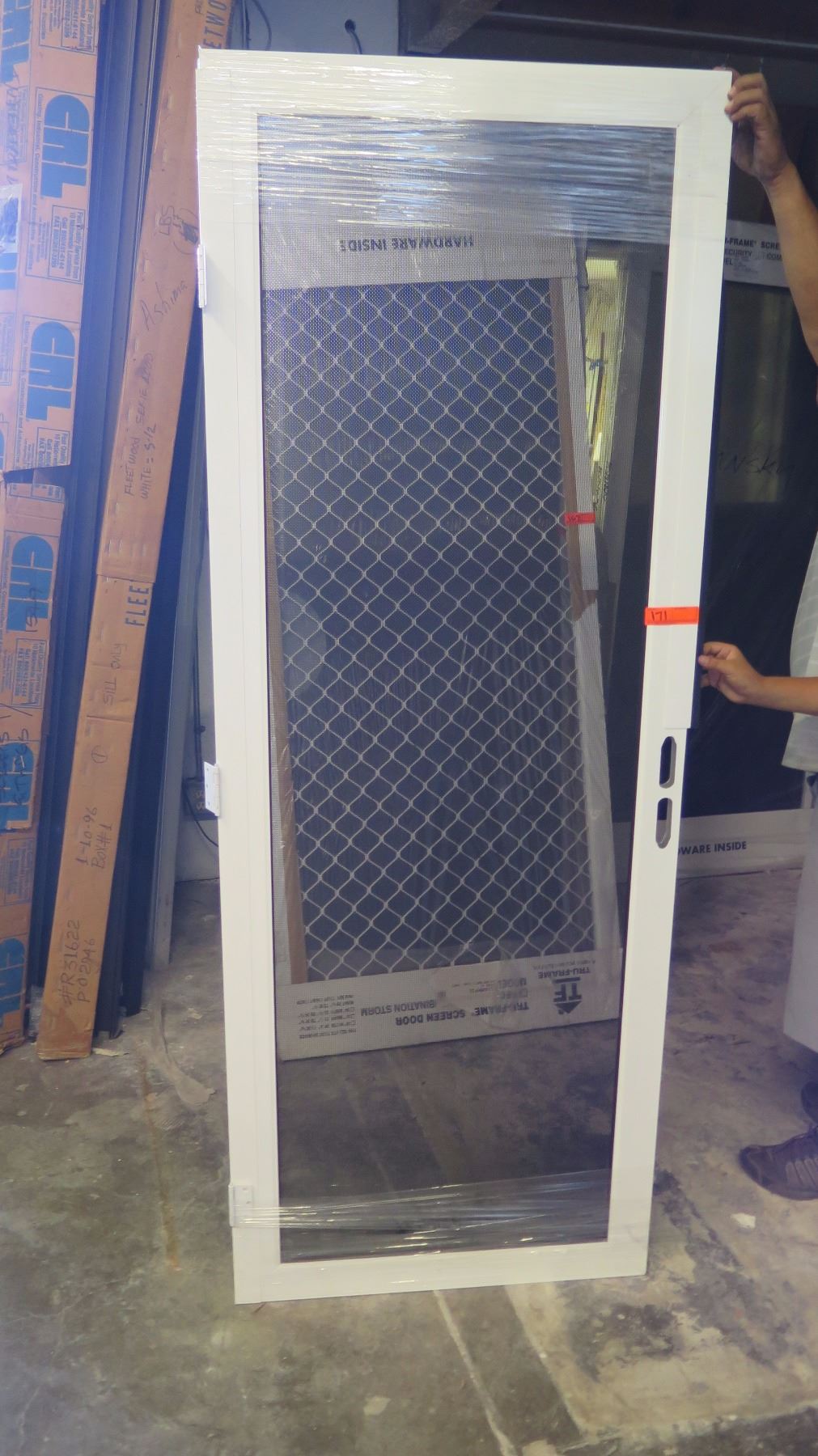 Kawili hinge expander aluminum security screen door / white painted finish / black stainless steel mesh / 29-5/8" x 79-1/4"