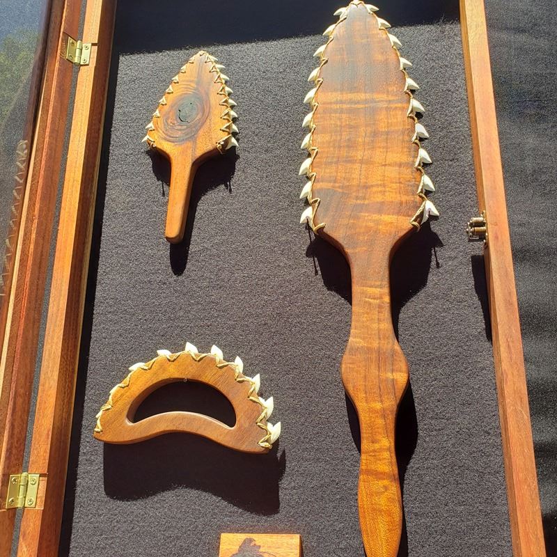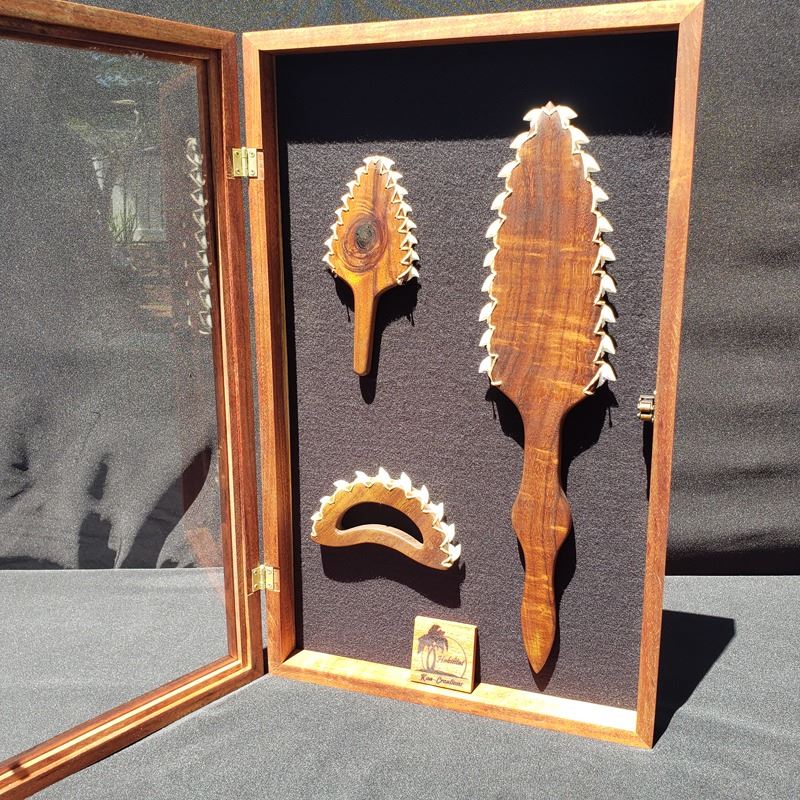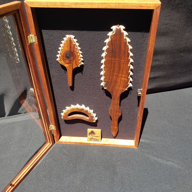 26 x 16'' Shadow Box with 8 X 3 3/4'' Lei O Mano, 6 x 3'' Knuckle Duster, 21 x 4'' Lei O Mano Koa with Tiger Shark Teeth handmade by Habilitat