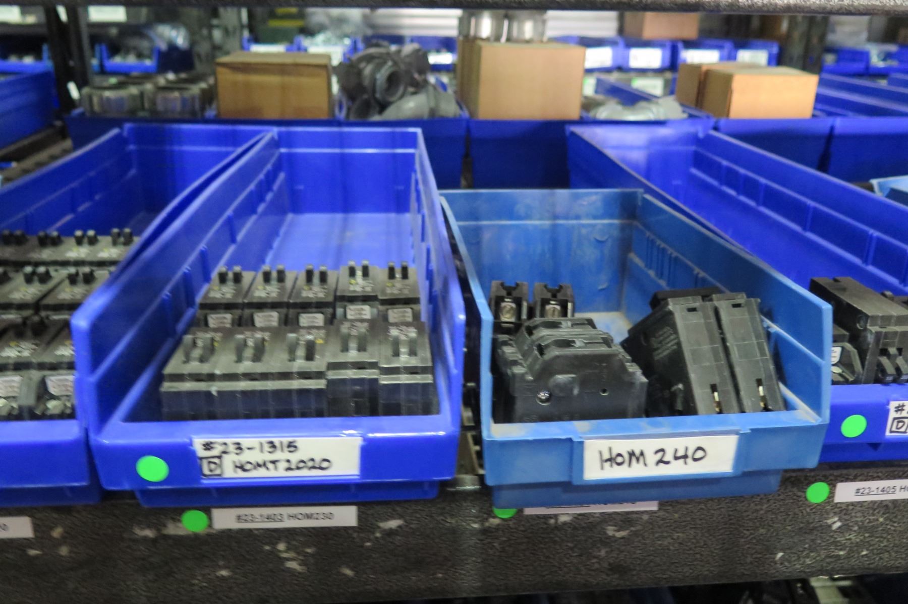 Shelf & Bins of Misc Size Square D Homeline Series Breakers, etc (see video for details)