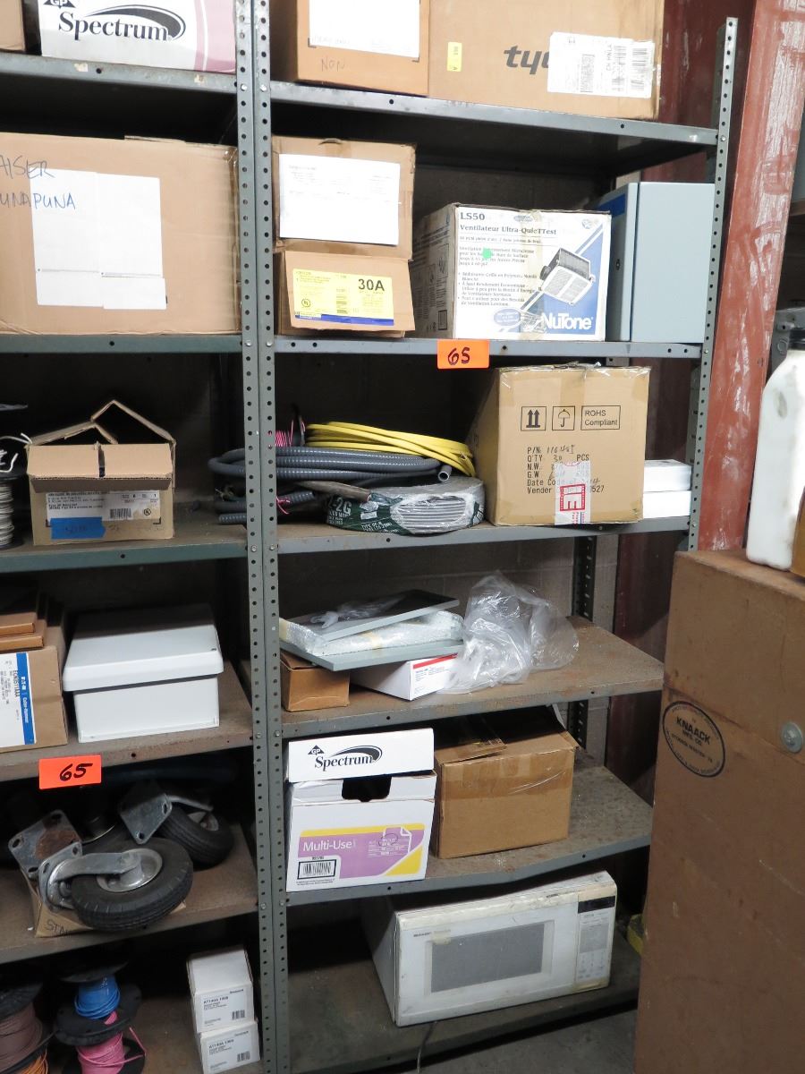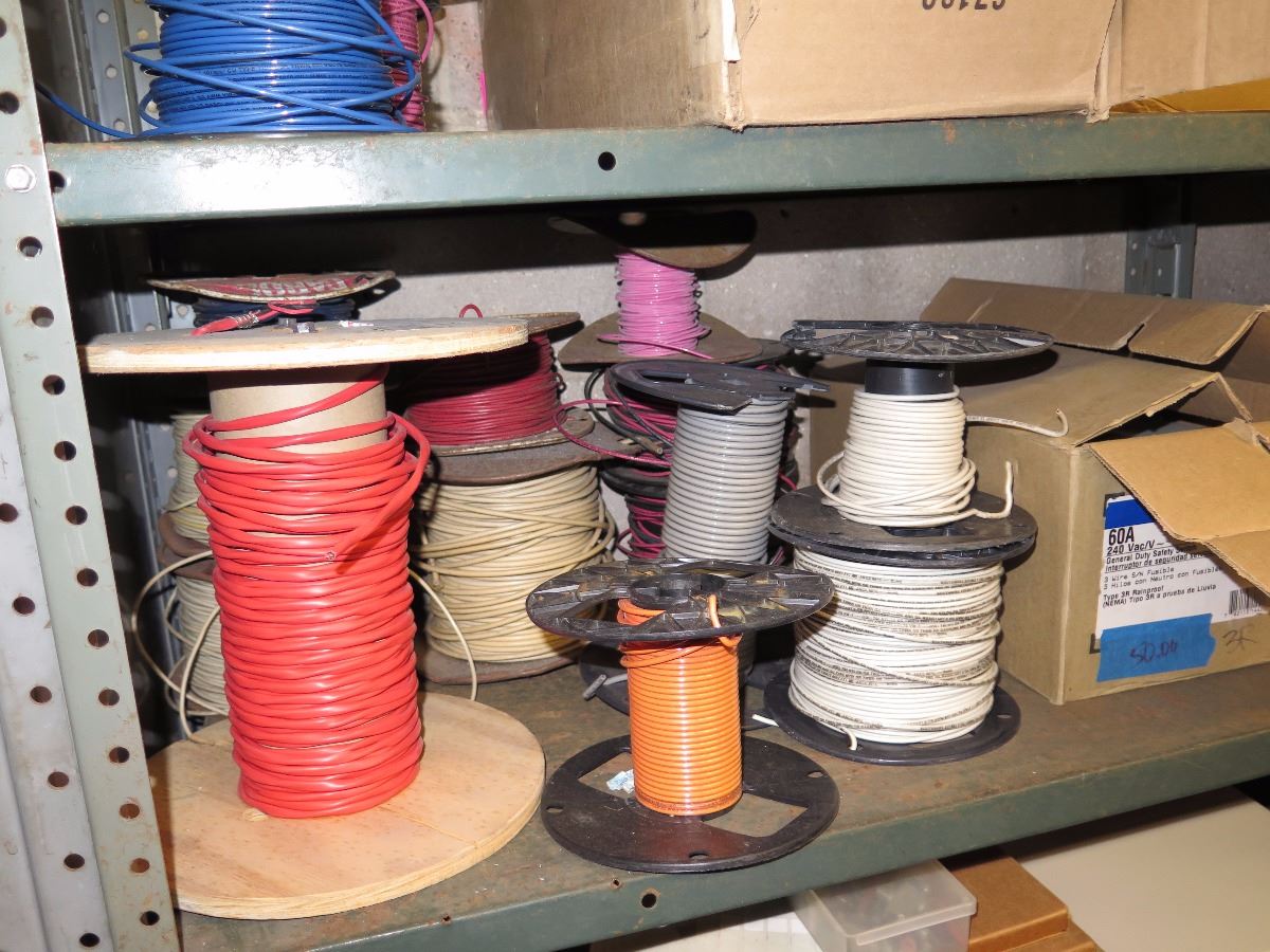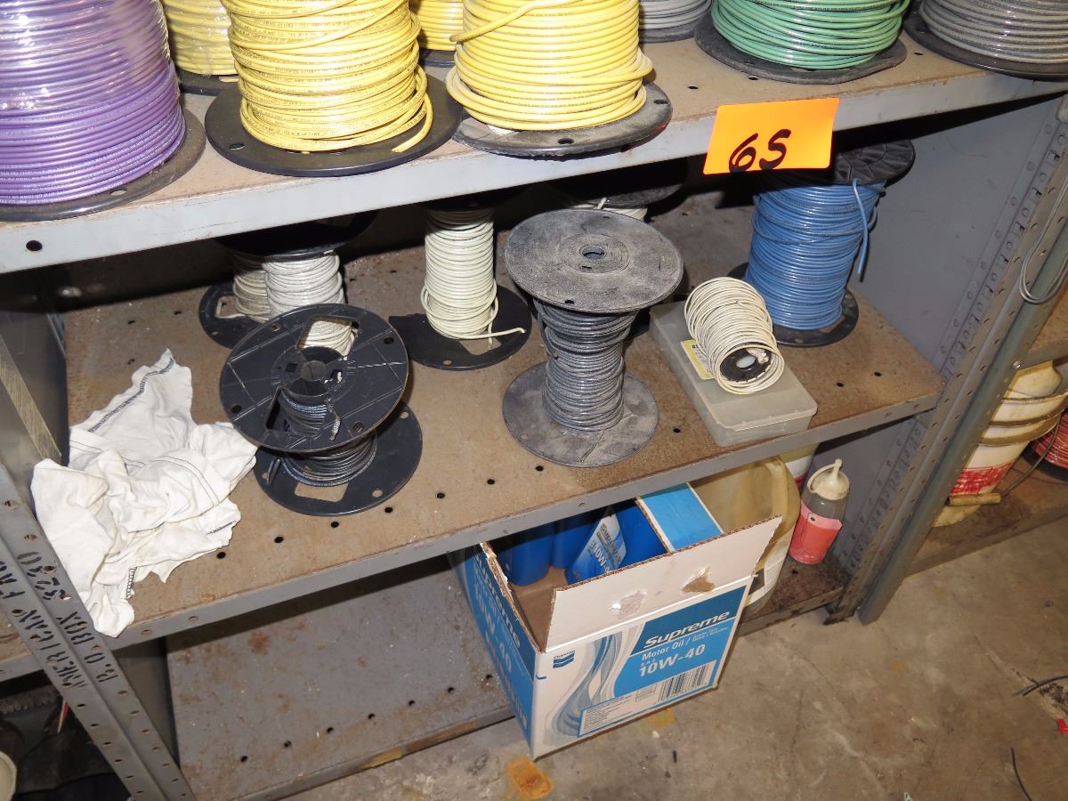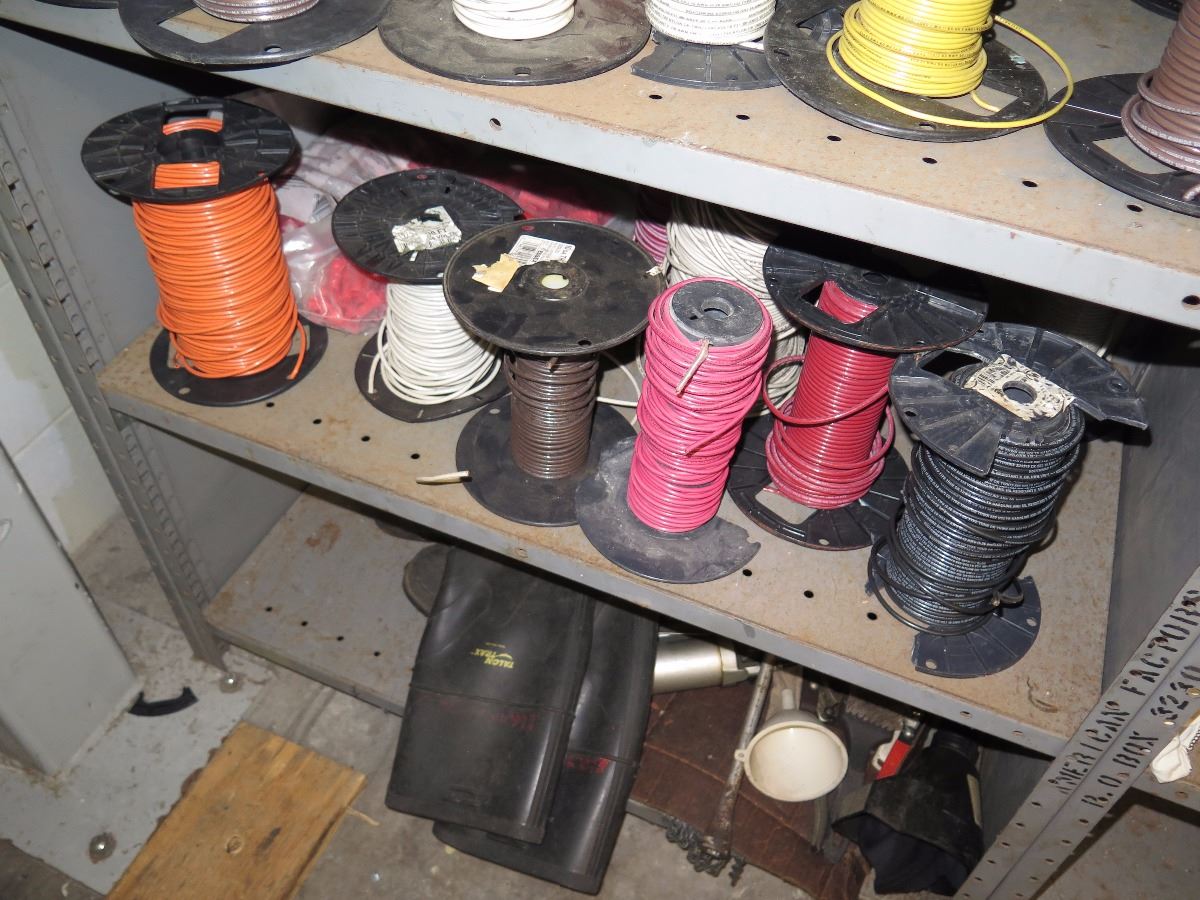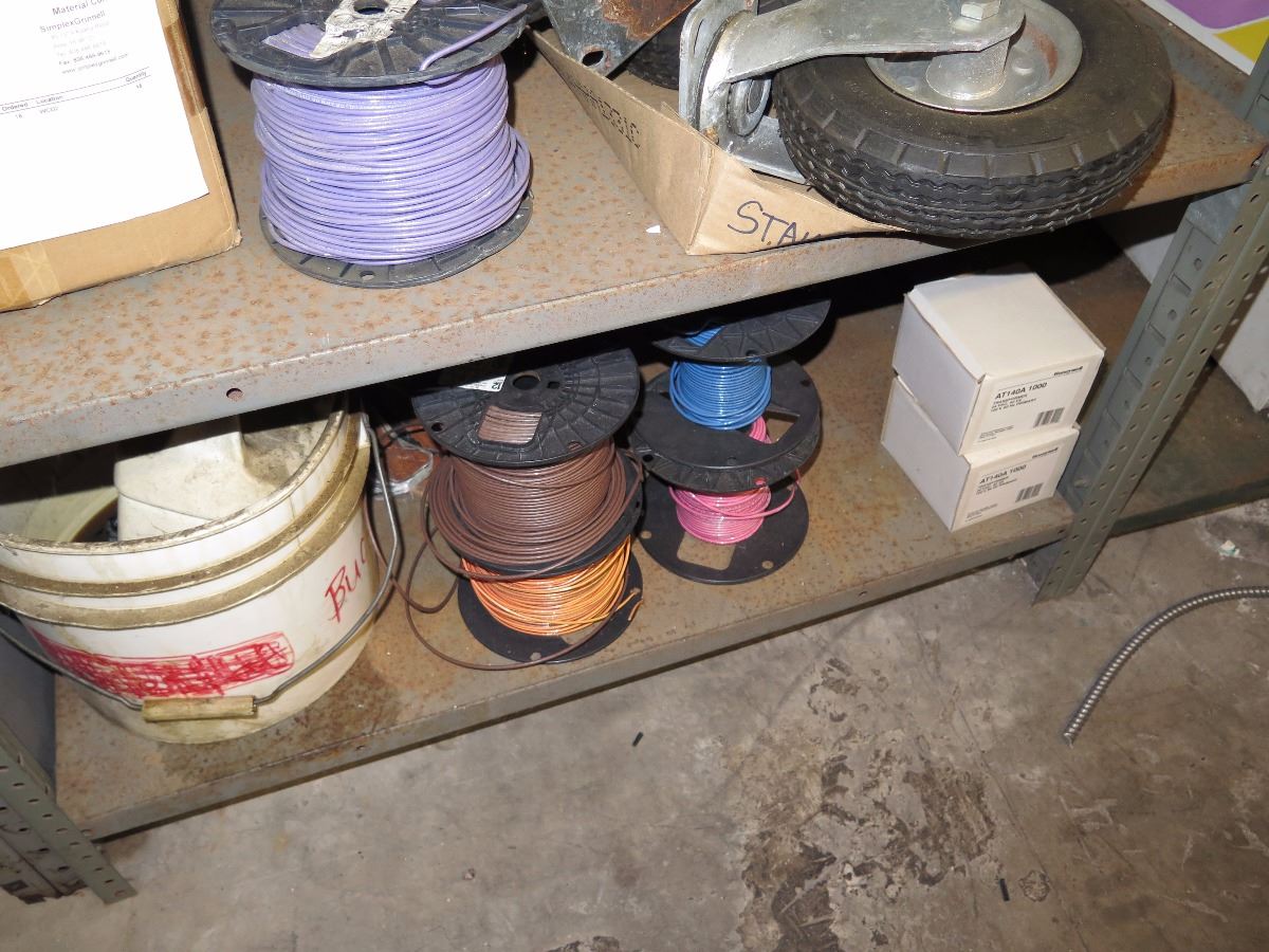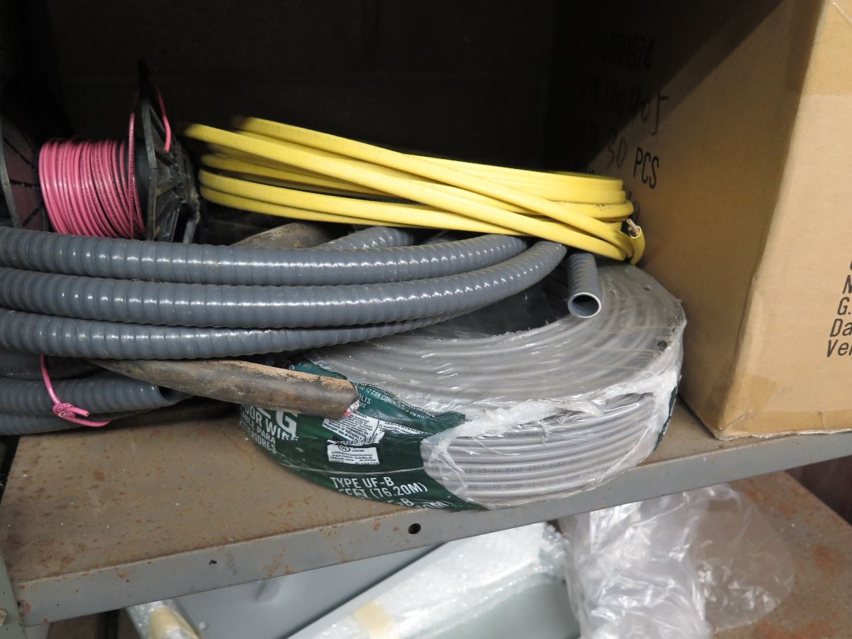 Shelves with Misc. Insulated Wiring, Safety Switches, Flex Tubing, Motor Oil, etc.