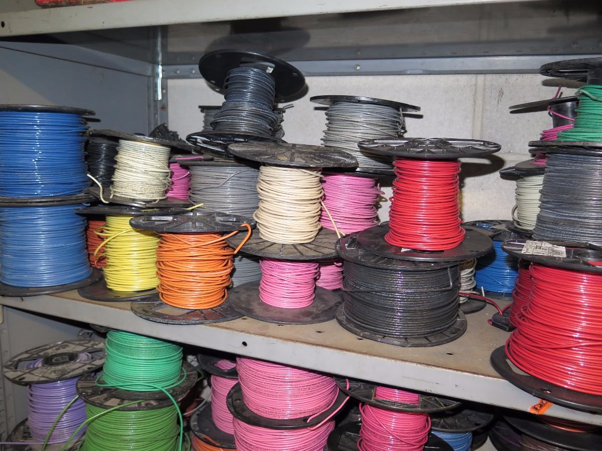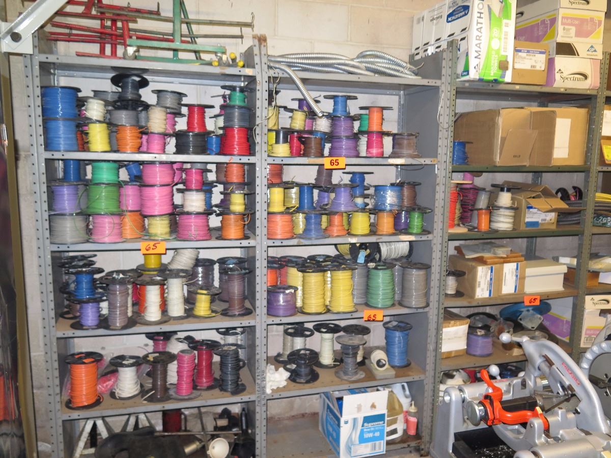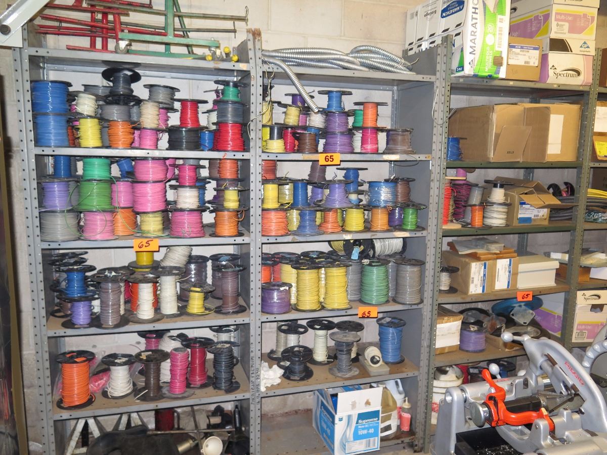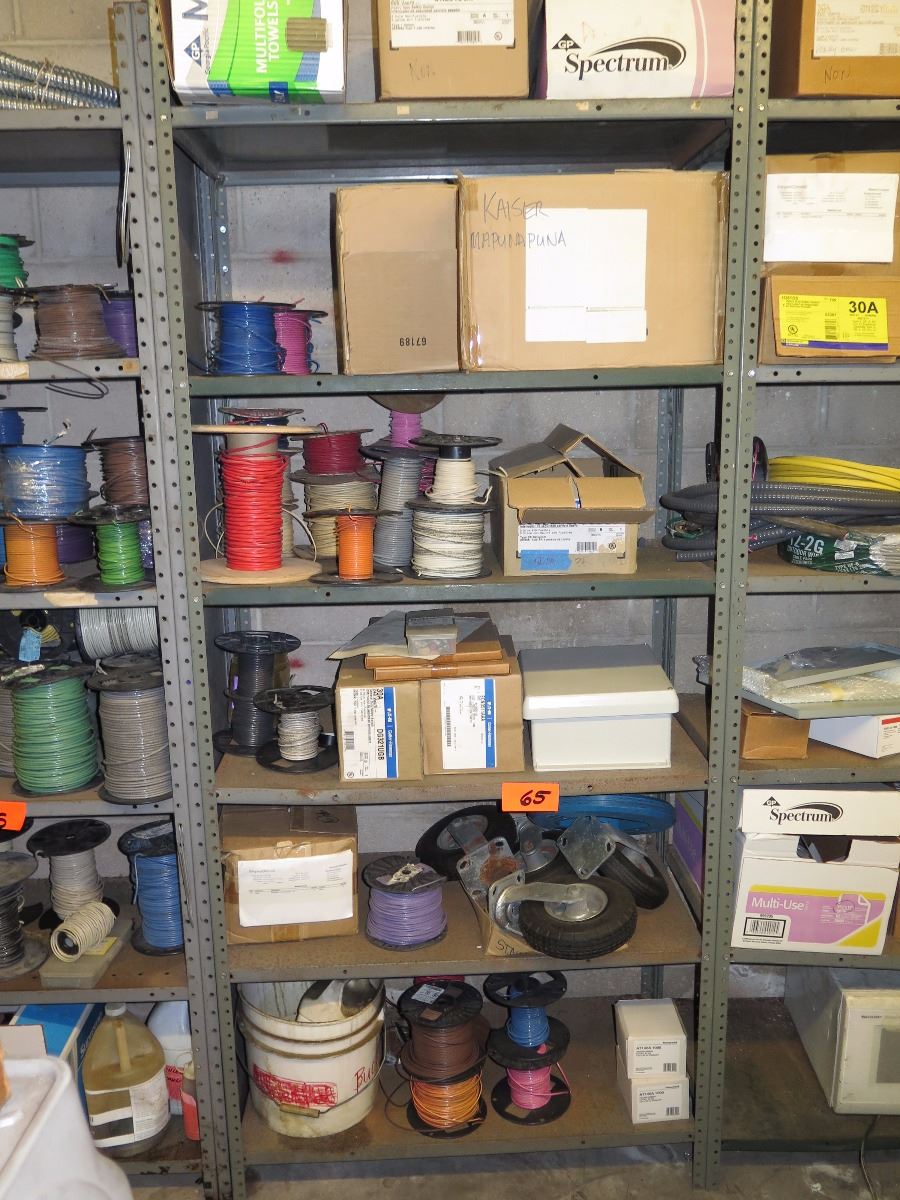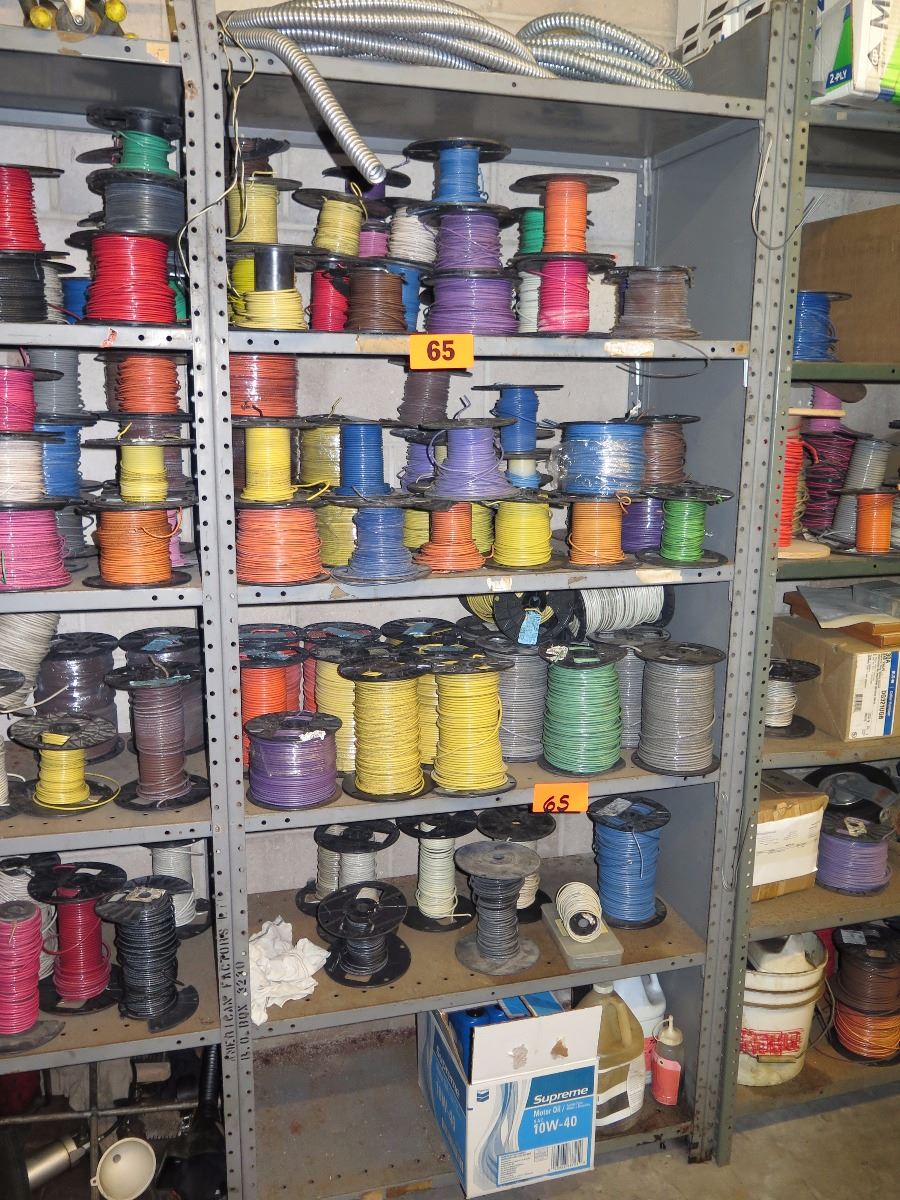 Shelves with Misc. Insulated Wiring, Safety Switches, Flex Tubing, Motor Oil, etc.