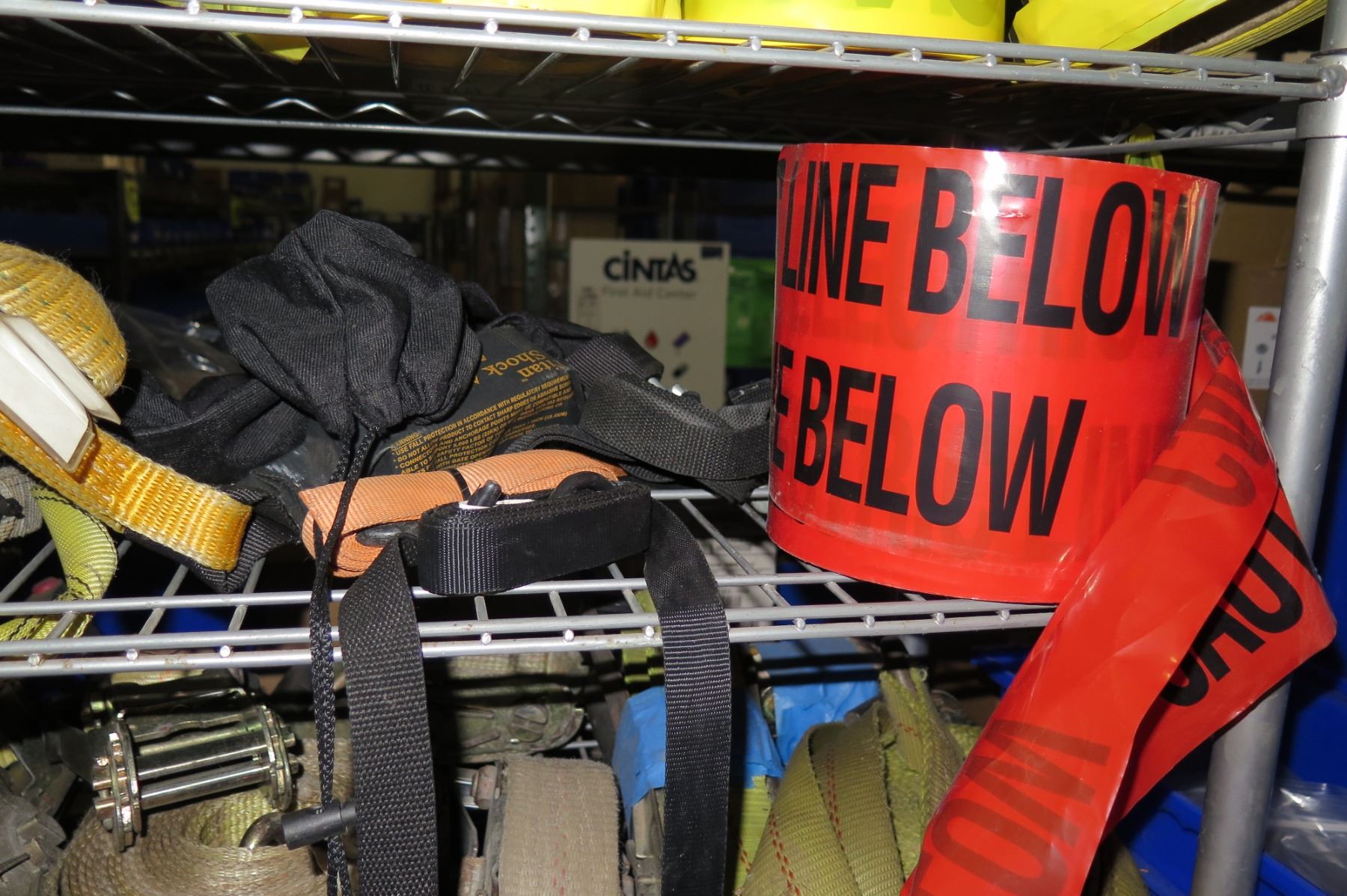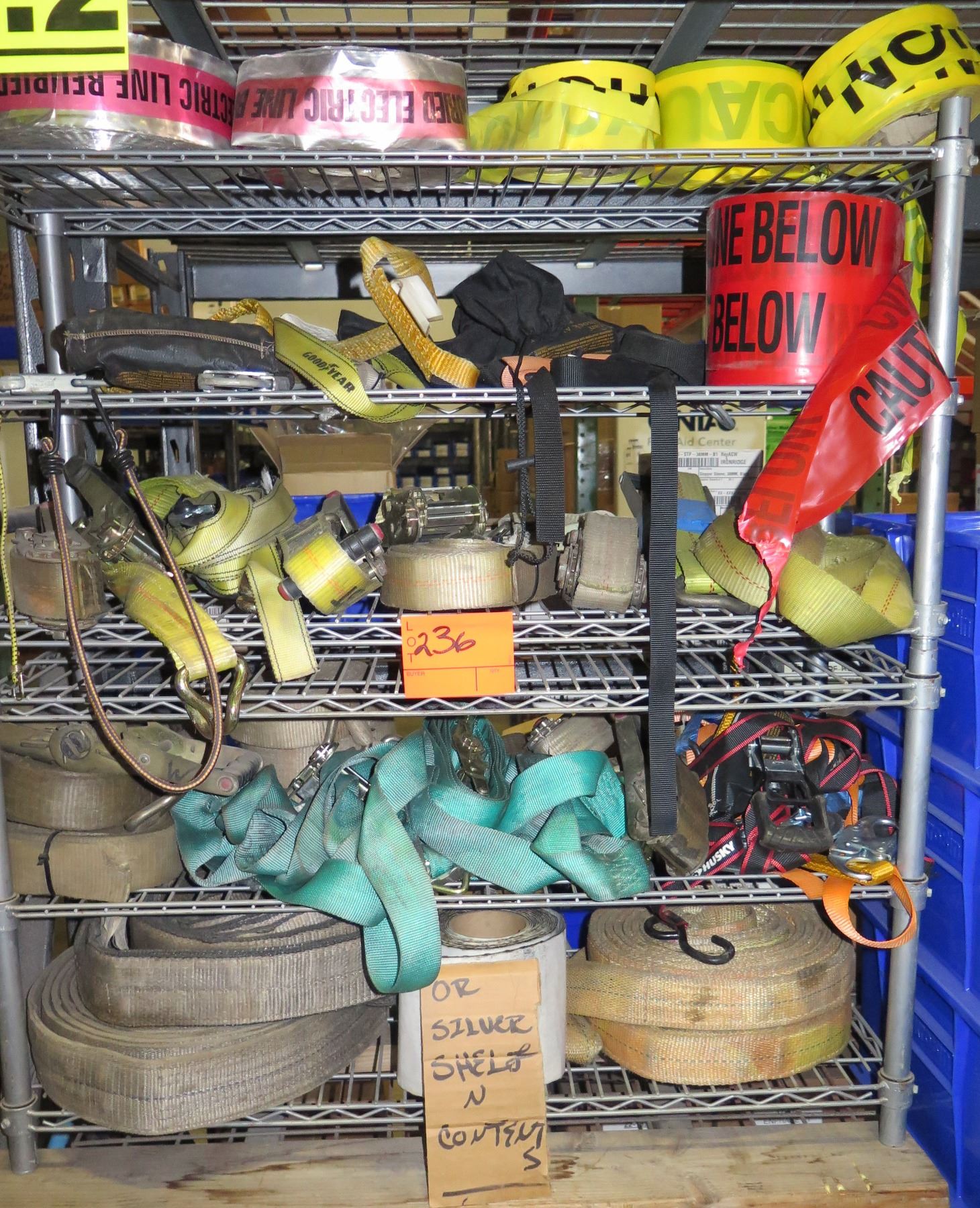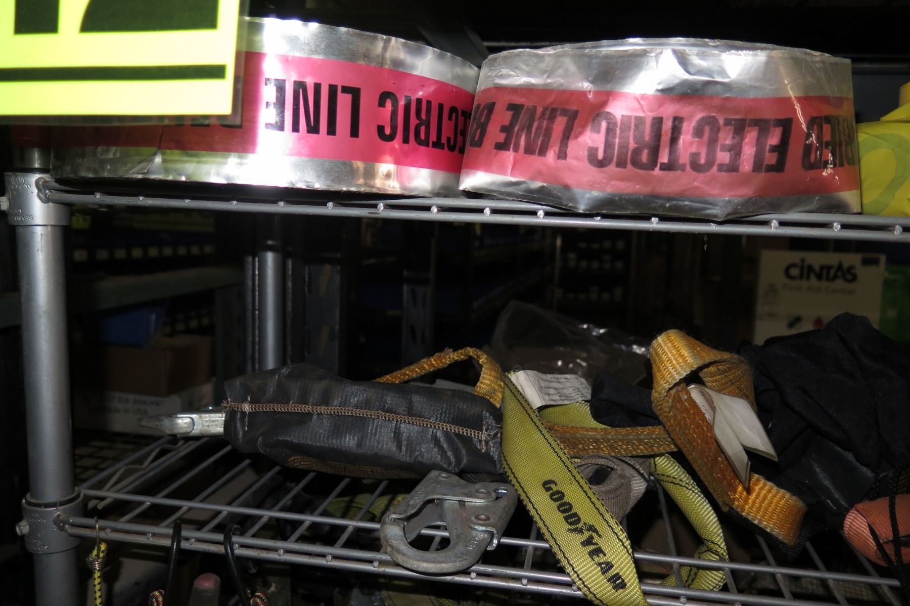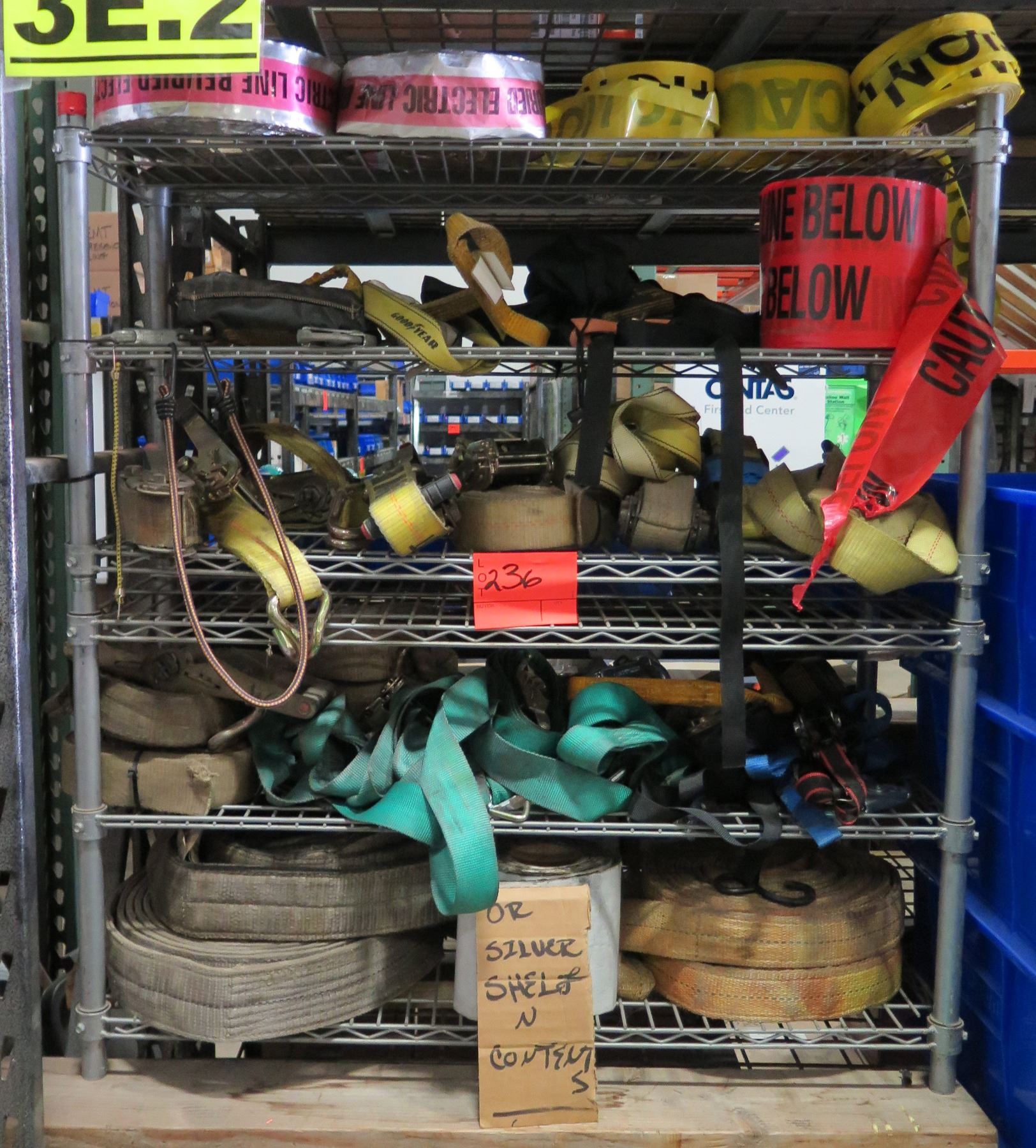 Shelving Unit and Contents: Ratchet Straps, Caution Tape, etc