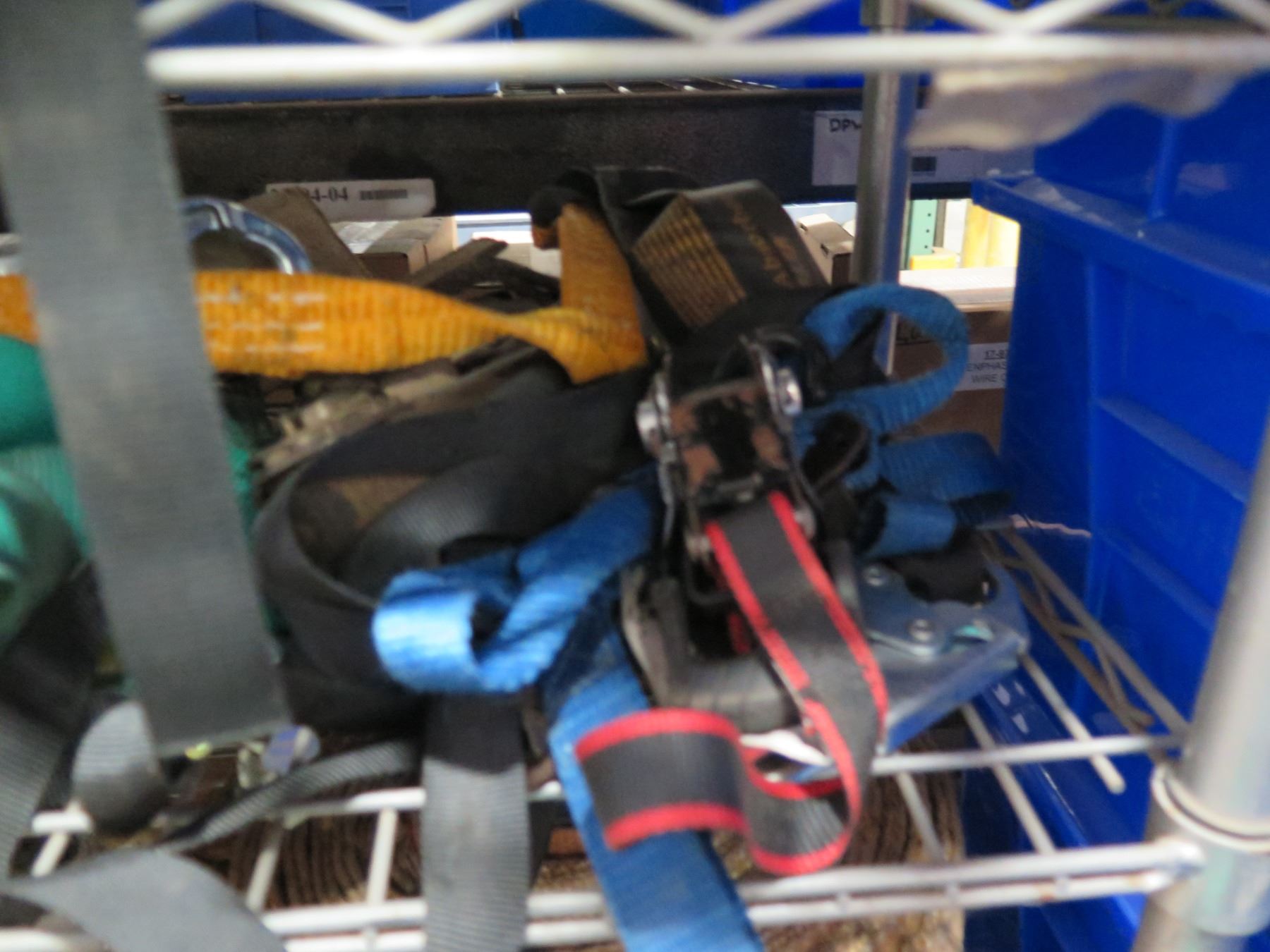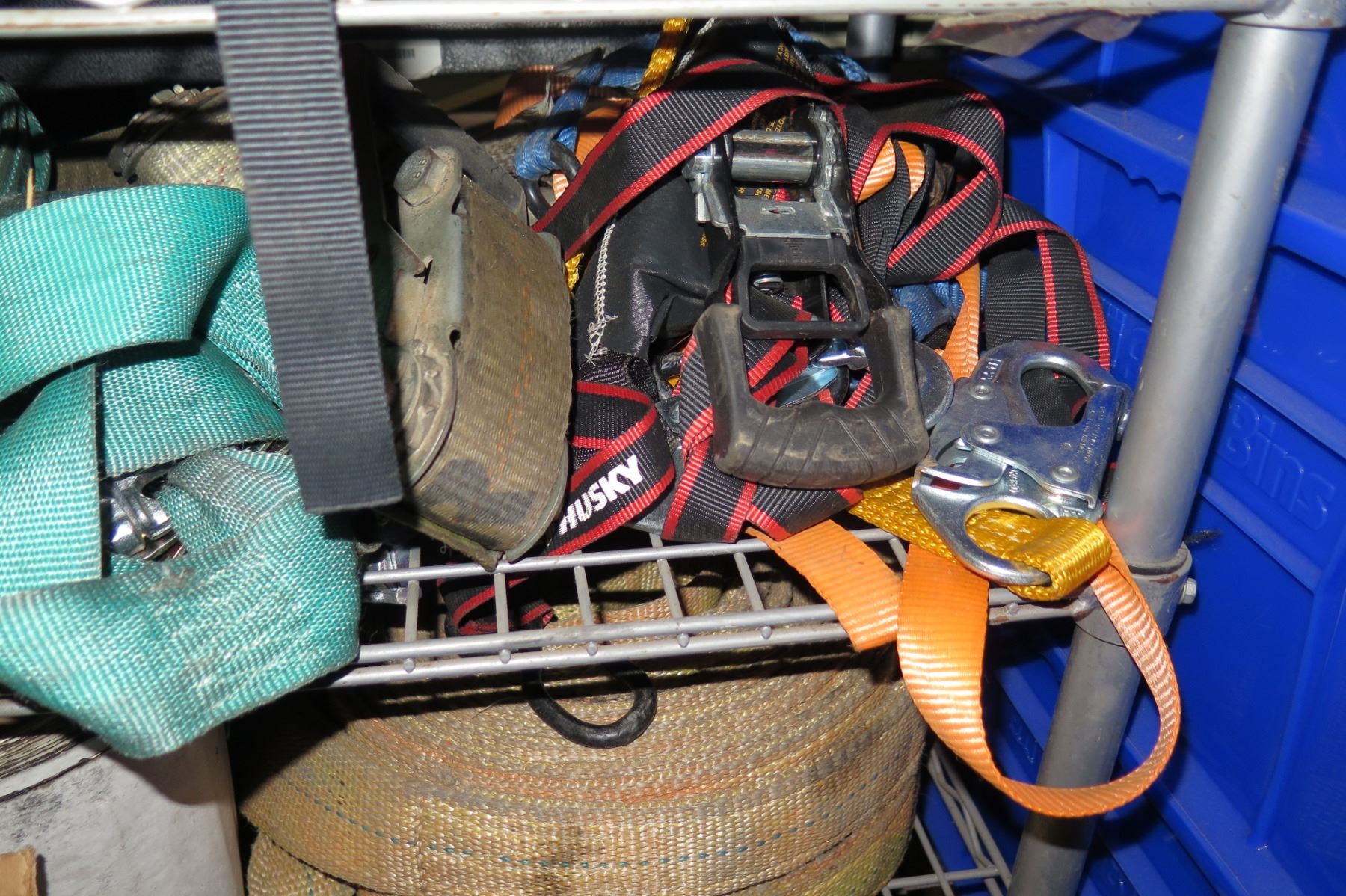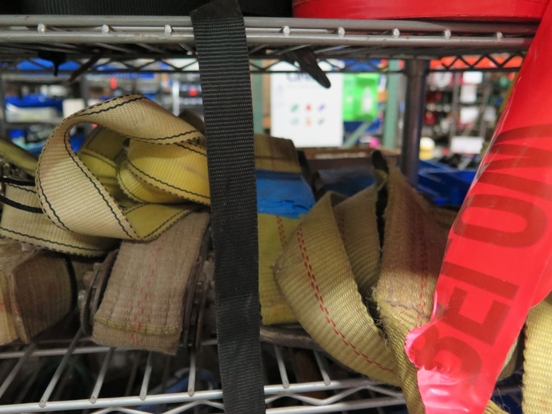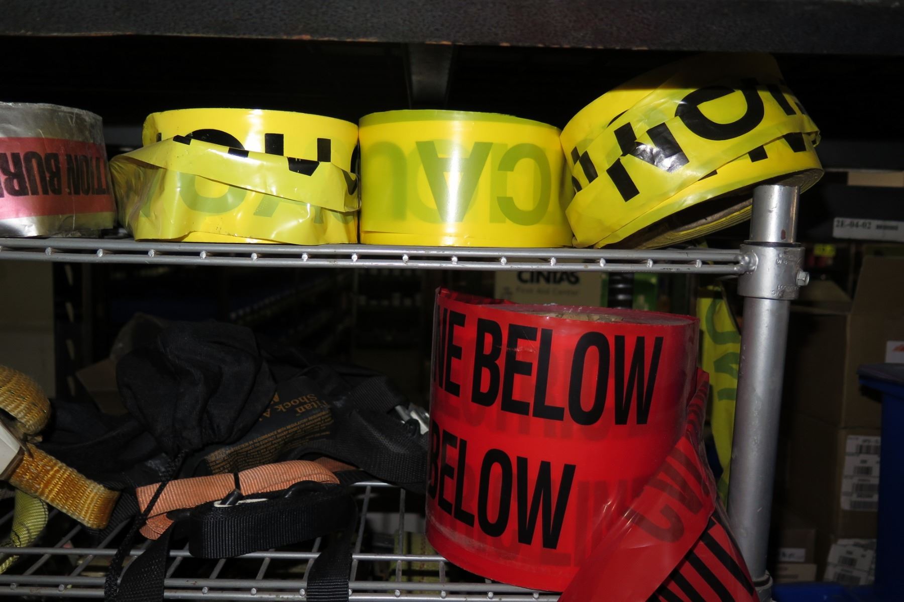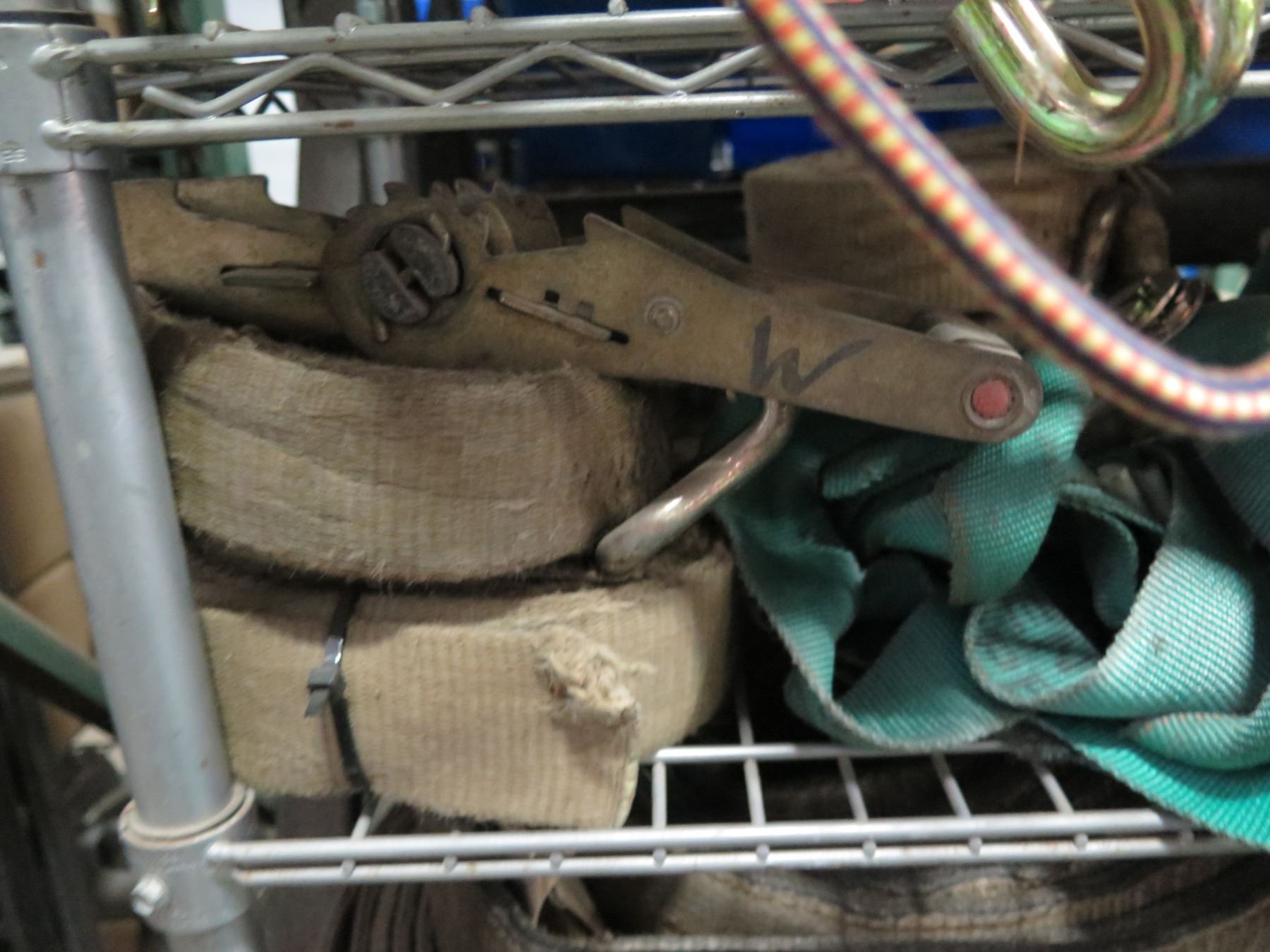 Shelving Unit and Contents: Ratchet Straps, Caution Tape, etc